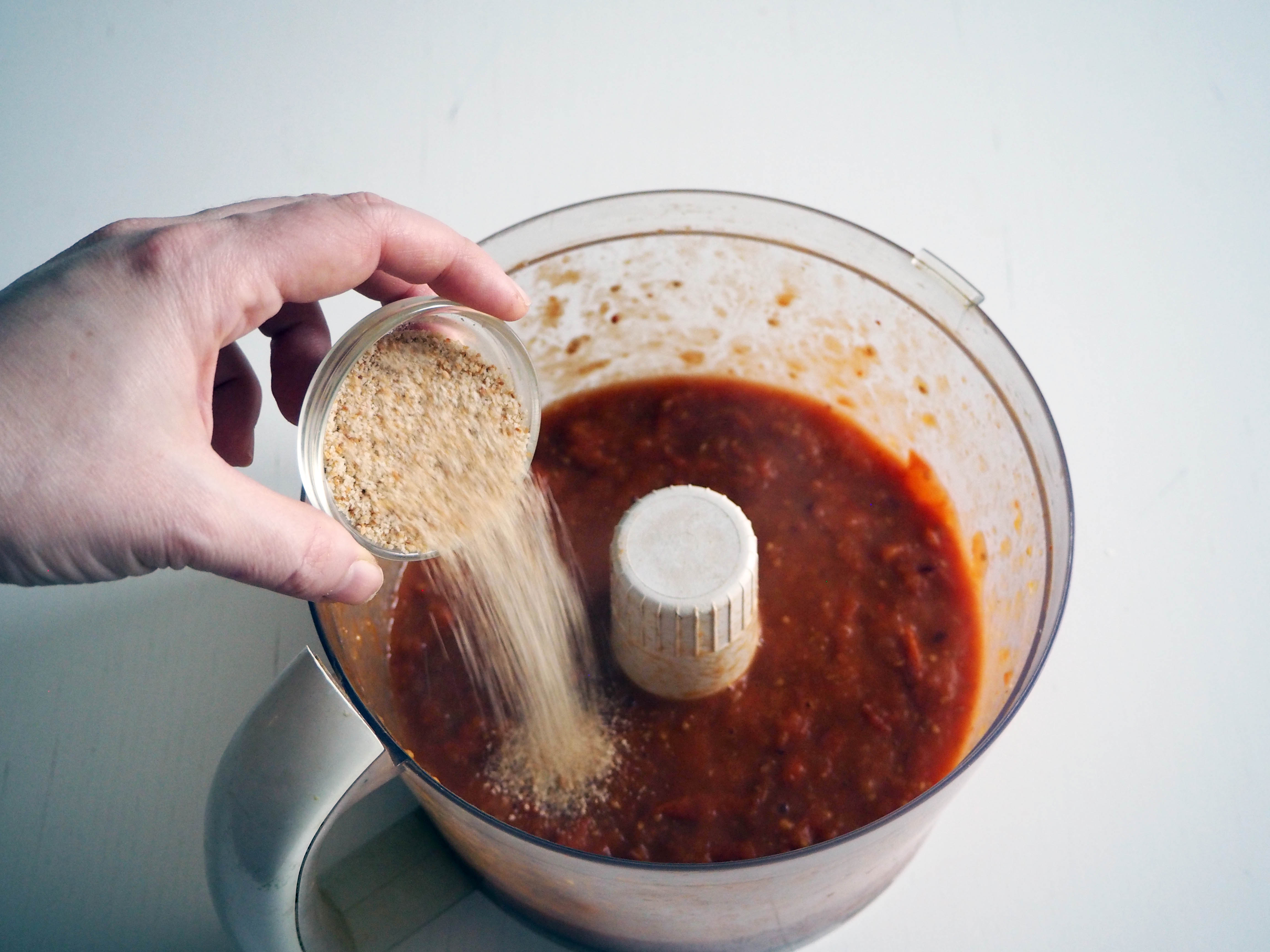 6. Add breadcrumbs, salt and pepper and continue processing. Depending on how thick you want the final spread to be, add more breadcrumbs or not. Taste the final spread and adjust the salt.