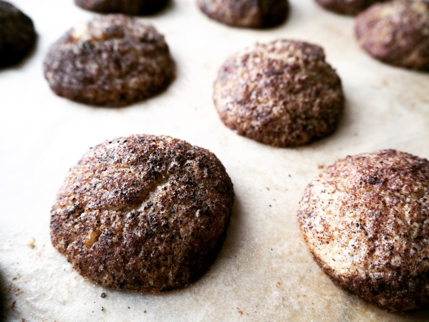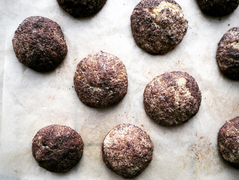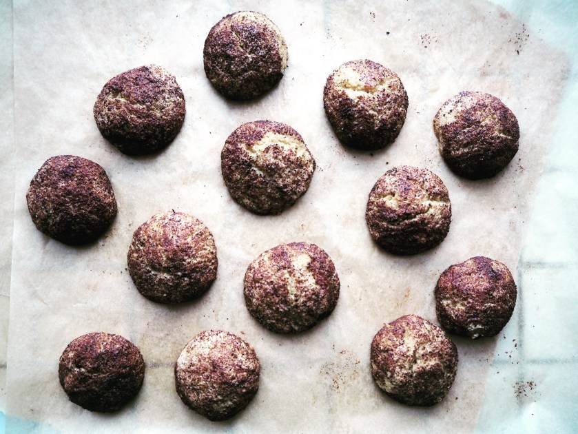 7. Take the cookie dough out of the fridge. Take 1 tablespoon from the dough and gently shape it into a ball, then roll in the sugar-cinnamon mixture. Put ready balls on an oven tray with a baking paper (they will spread a little so I recommend to put them a little separate from each other, about 2 cm difference in between – so my photo is a little misleading) and bake for 18 to 20 minutes, until they start to look like they are getting crispy. When they are out of the oven, let them cool for 10 minutes and then transfer to a wire rack. Enjoy with fresh tea or coffee!