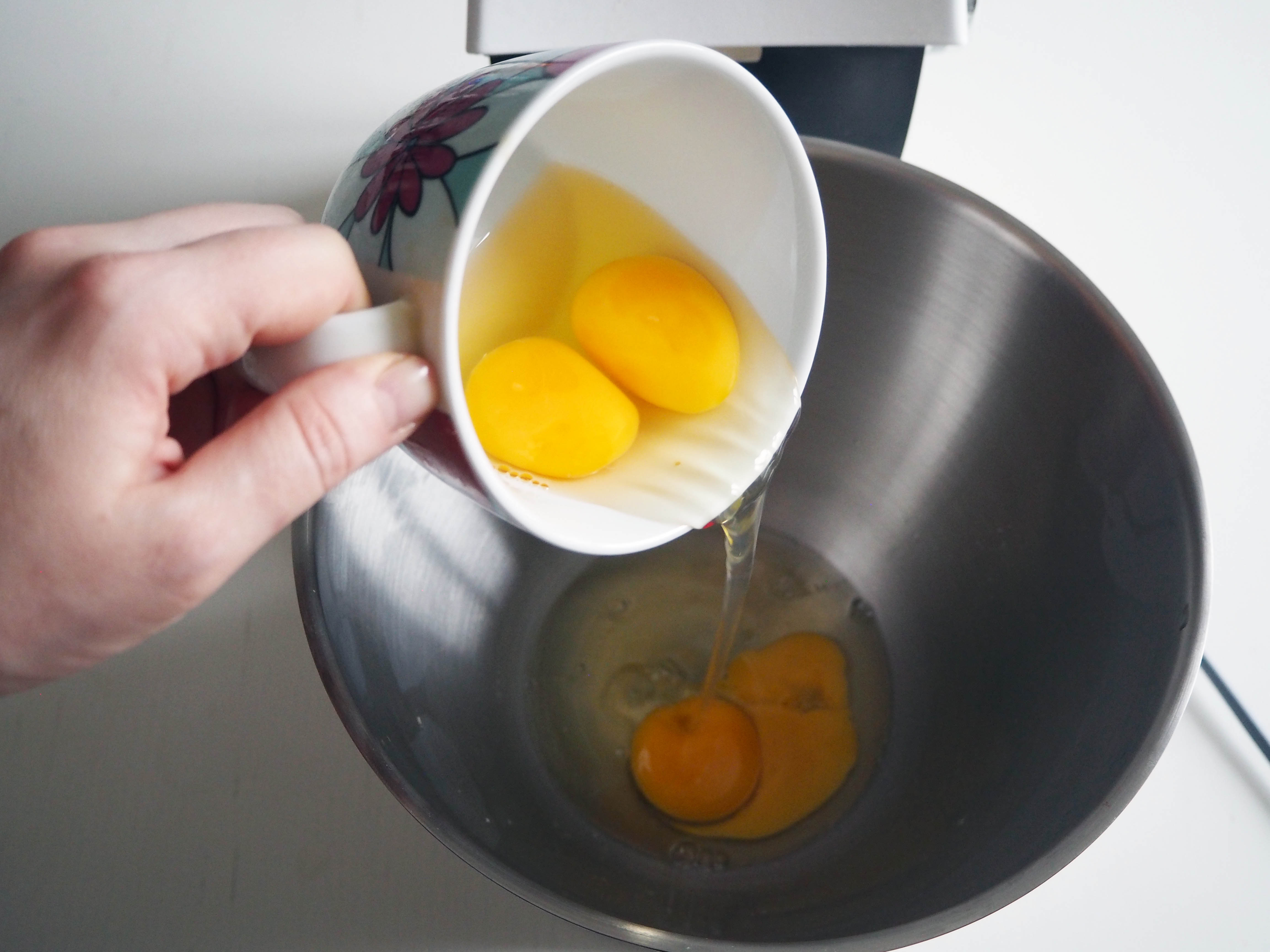 2. In a mixing bowl, put eggs, granulated white sugar and coconut sugar, and whisk from medium to high speed for about 4 minutes, or until it gets creamy.