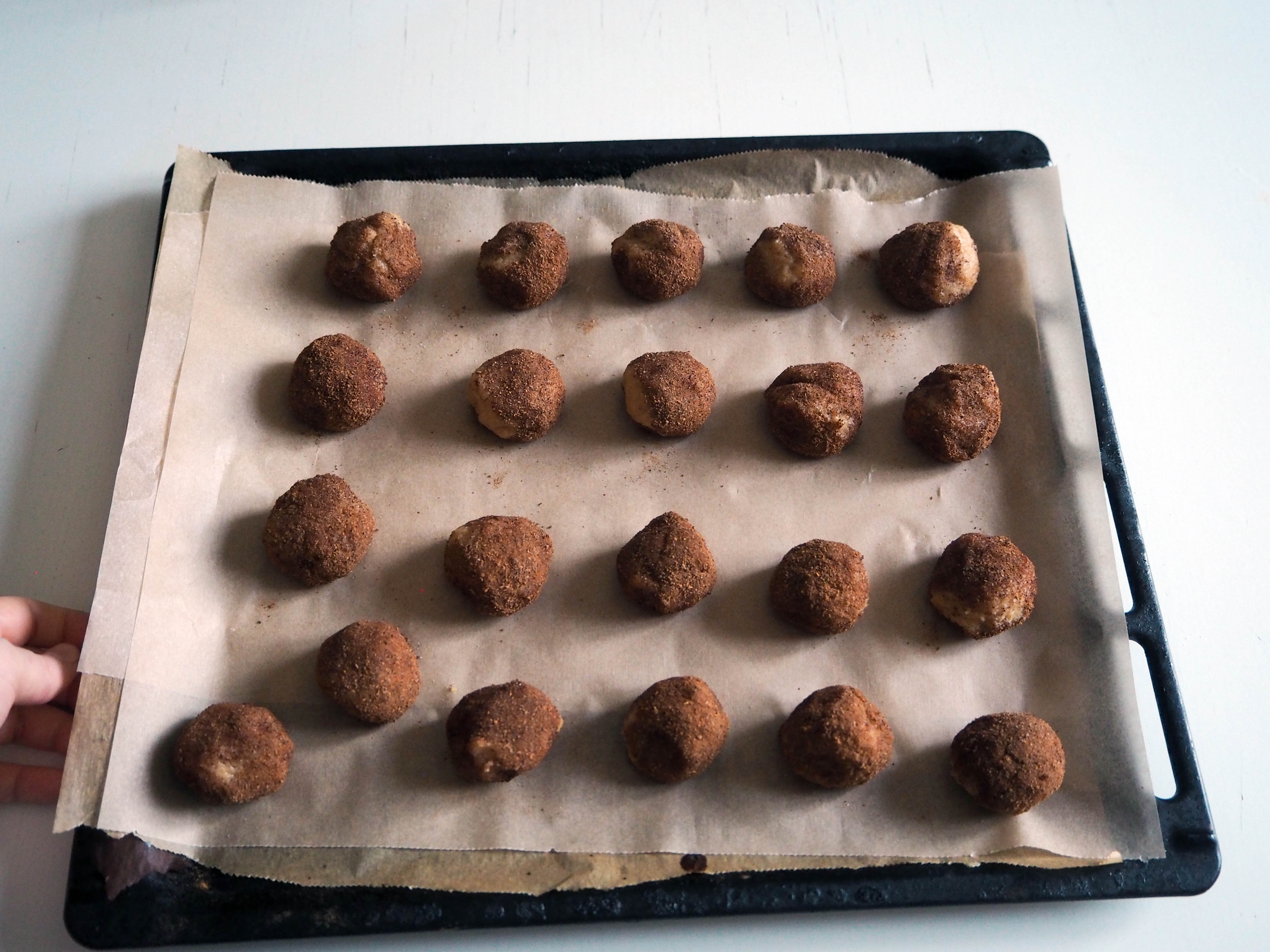 7. Take the cookie dough out of the fridge. Take 1 tablespoon from the dough and gently shape it into a ball, then roll in the sugar-cinnamon mixture. Put ready balls on an oven tray with a baking paper (they will spread a little so I recommend to put them a little separate from each other, about 2 cm difference in between – so my photo is a little misleading) and bake for 18 to 20 minutes, until they start to look like they are getting crispy. When they are out of the oven, let them cool for 10 minutes and then transfer to a wire rack. Enjoy with fresh tea or coffee!