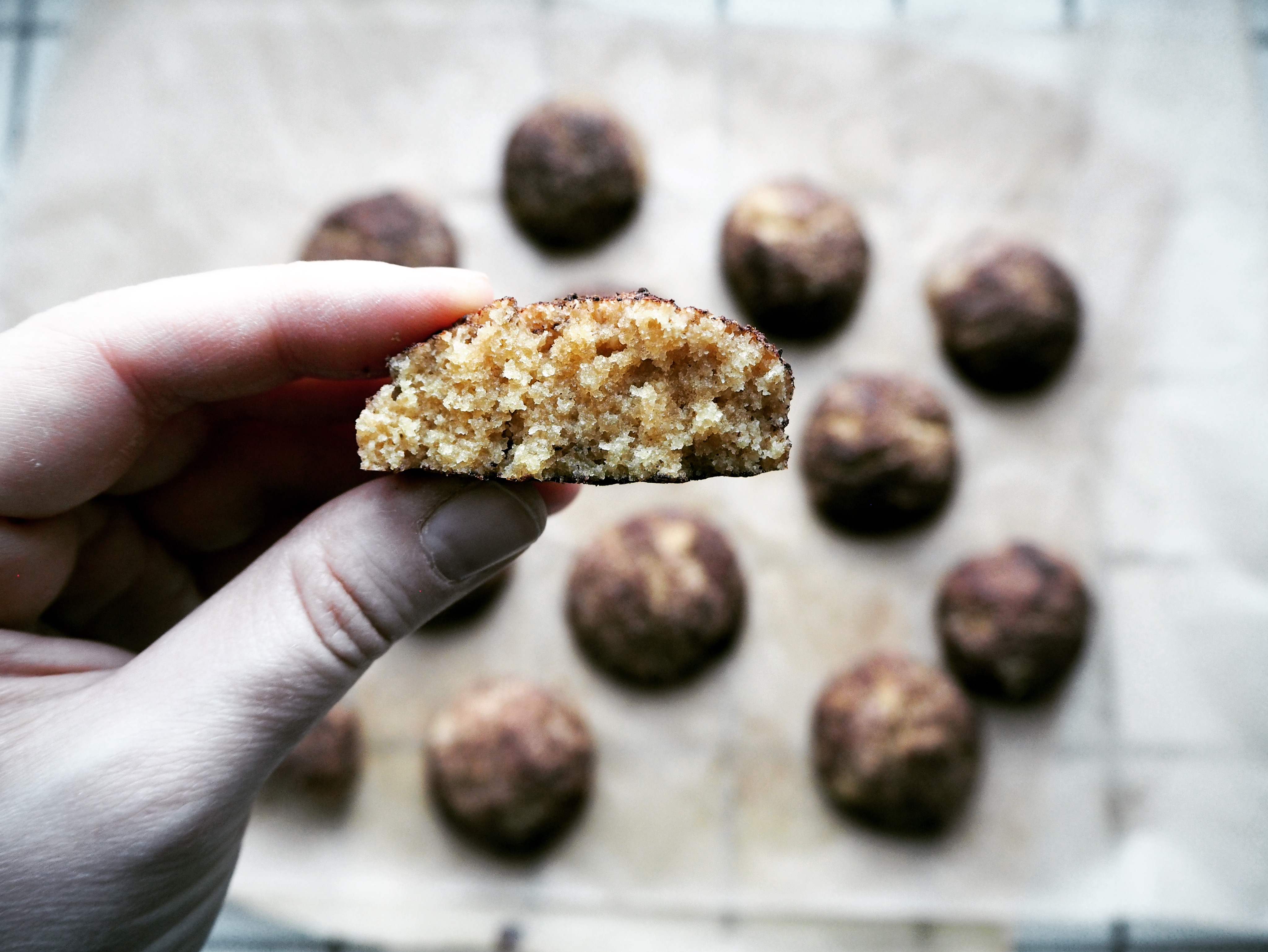 It took me a while to get the good texture for these cookies. When I made them first time, the starting point was to just make coconut cookies. But the resulting cookie dough turned out to be way too soft to handle and even though I kept it in the fridge for a few hours, it only got solid a little – not enough to roll into cookies.