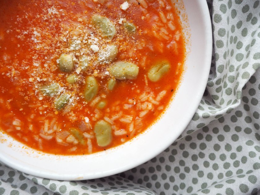 5. When the soup starts boiling, add some salt and pepper and lower the heat. Cover the pot and let the soup simmer for about 20-25 minutes or until the beans cook completely. When the soup is cooked, taste and adjust seasoning. Serve with grated parmesan if you want. The soup will get thicker and thicker as time passes so if there is any leftover, just take from the pot as much as you want to eat into a small pan, add water to thin it (as much as you like) and heat it while stirring frequently. Enjoy!