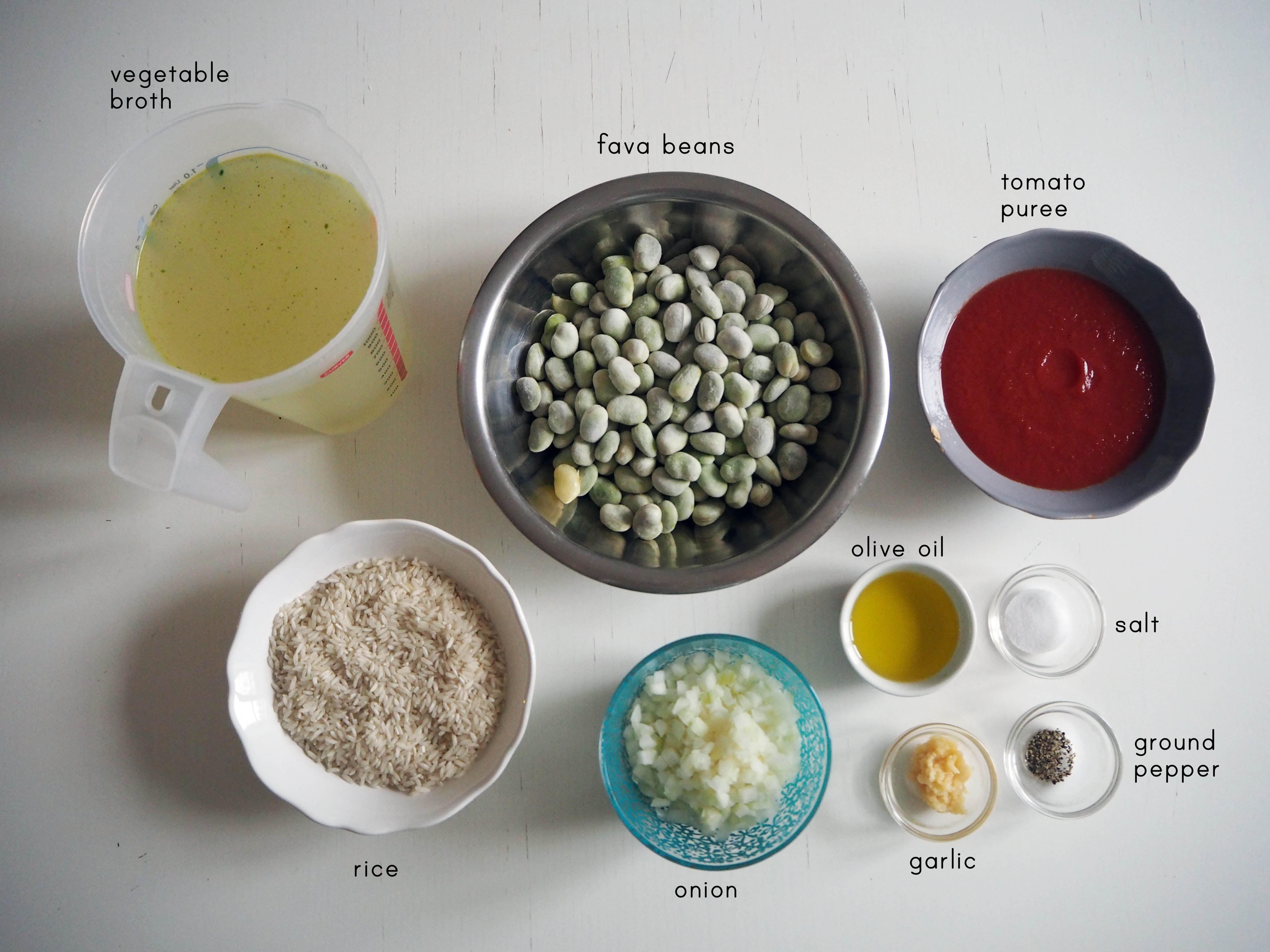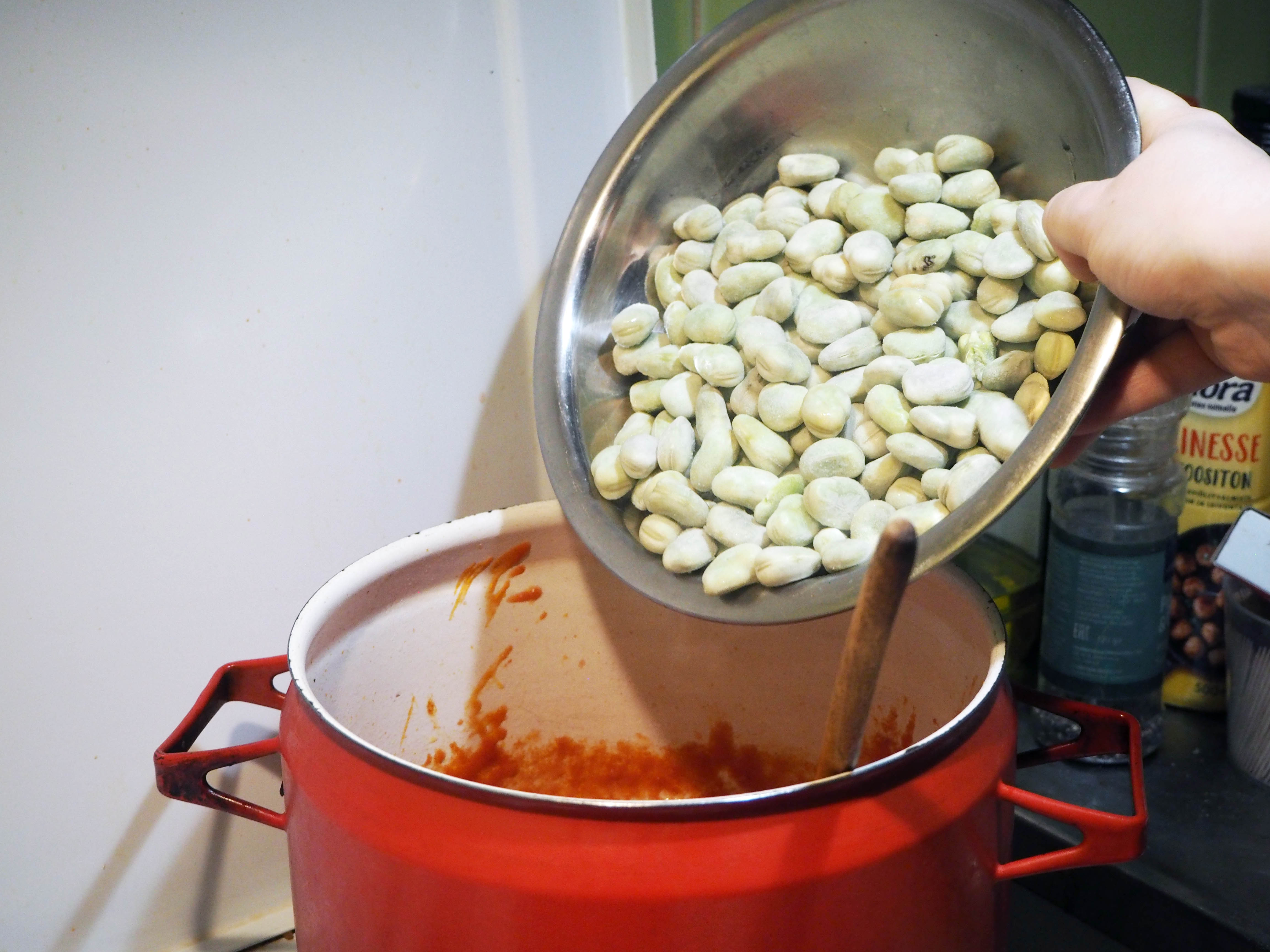 6.5 dl (or 2 3/4 cups or 400 gr.) fresh or frozen (shelled) fava beans*