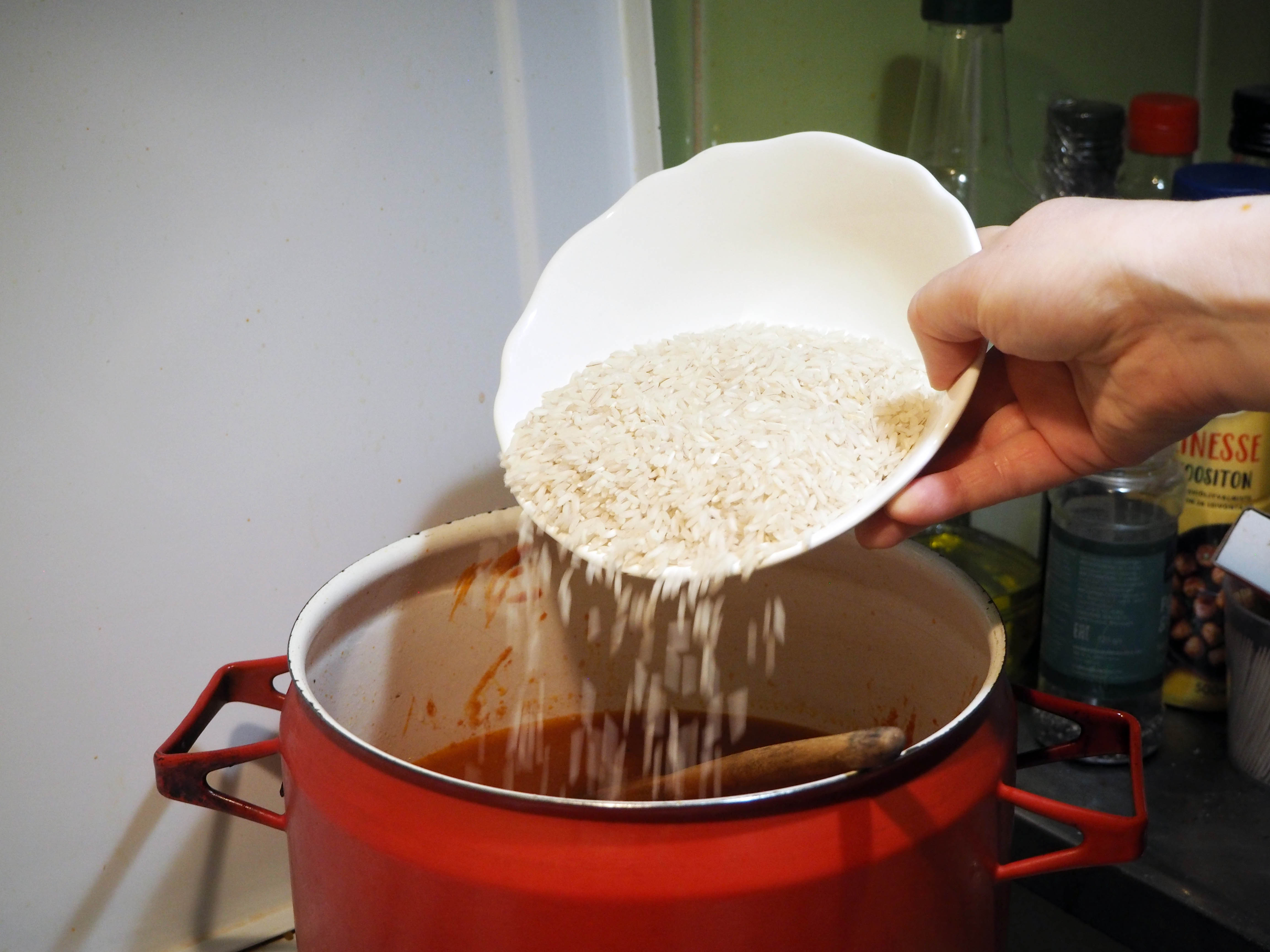 2.5 dl + 2 tbsp (or 1 1/4 cups or 225 gr.) white rice, washed and drained