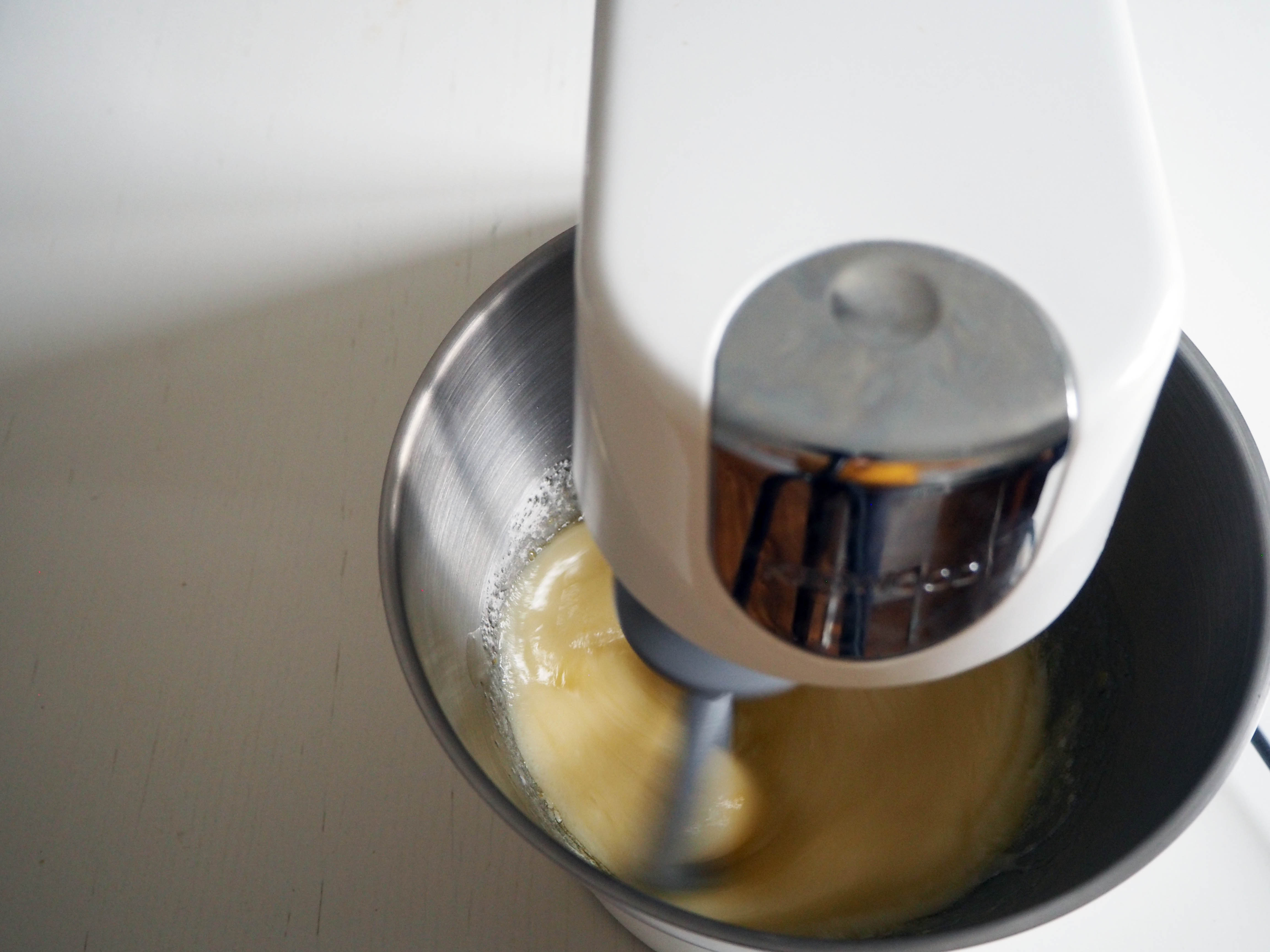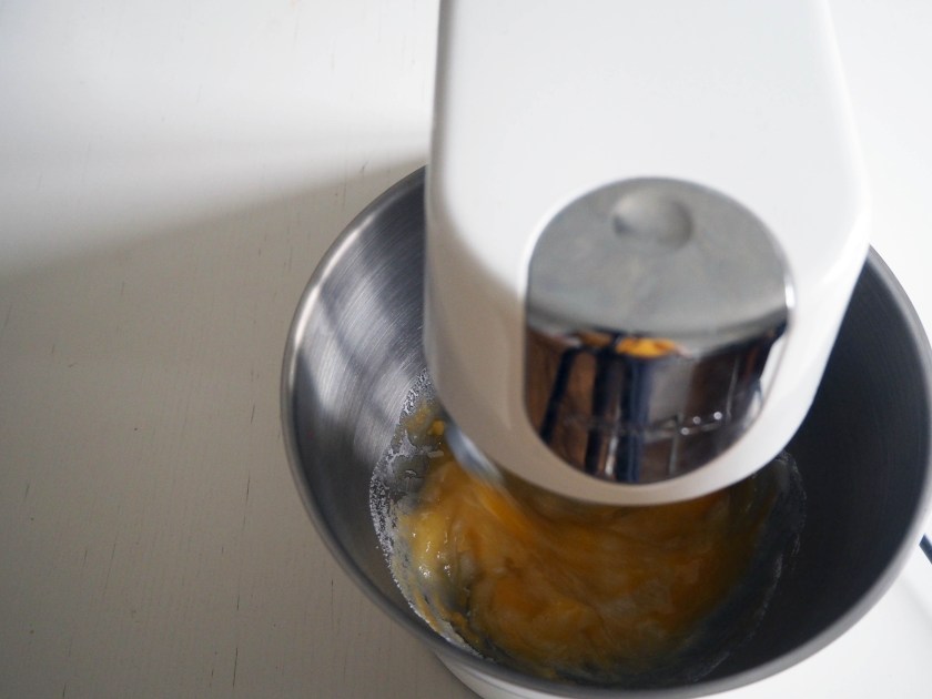 3. In a mixing bowl, put eggs and sugar and beat for about 4 minutes from low to medium high, until the mixture gets light and creamy.