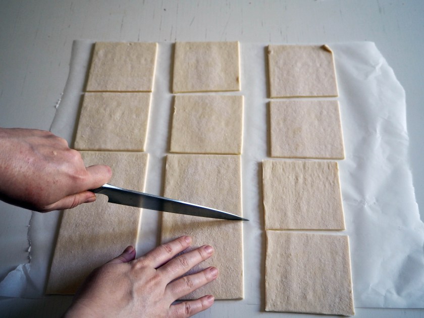 2. Cut thawed puff pastry sheets in two pieces to make 12 squares.
