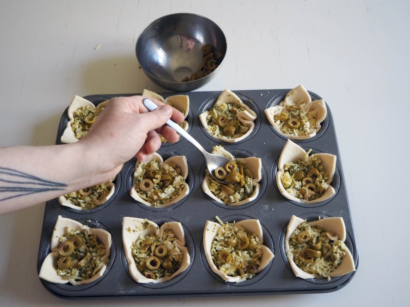 5. Fill the cups with appr. 1 tablespoon cheese (fully filled). Add 1 tsp cut olives (or 1 whole olive) and 2 pieces cherry tomatoes (which means 1 cherry tomato per cup, cut in 2).