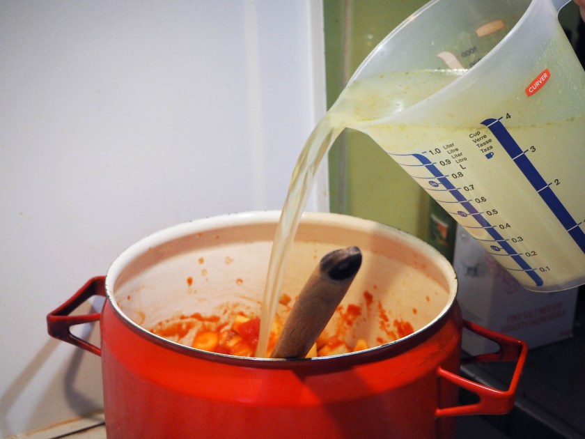 4. Add vegetable broth, cayenne pepper, salt and pepper, give it a stir and cover the pot. Let it boil. When it starts boiling, lower the heat to medium and cook for 20-25 minutes, until the vegetables are tender.