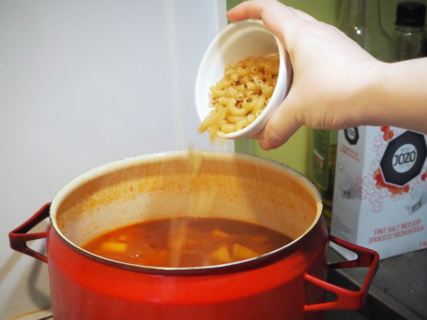 5. Add macaroni and stir. Check the package instructions and let the cooking time be according to the instructions.
