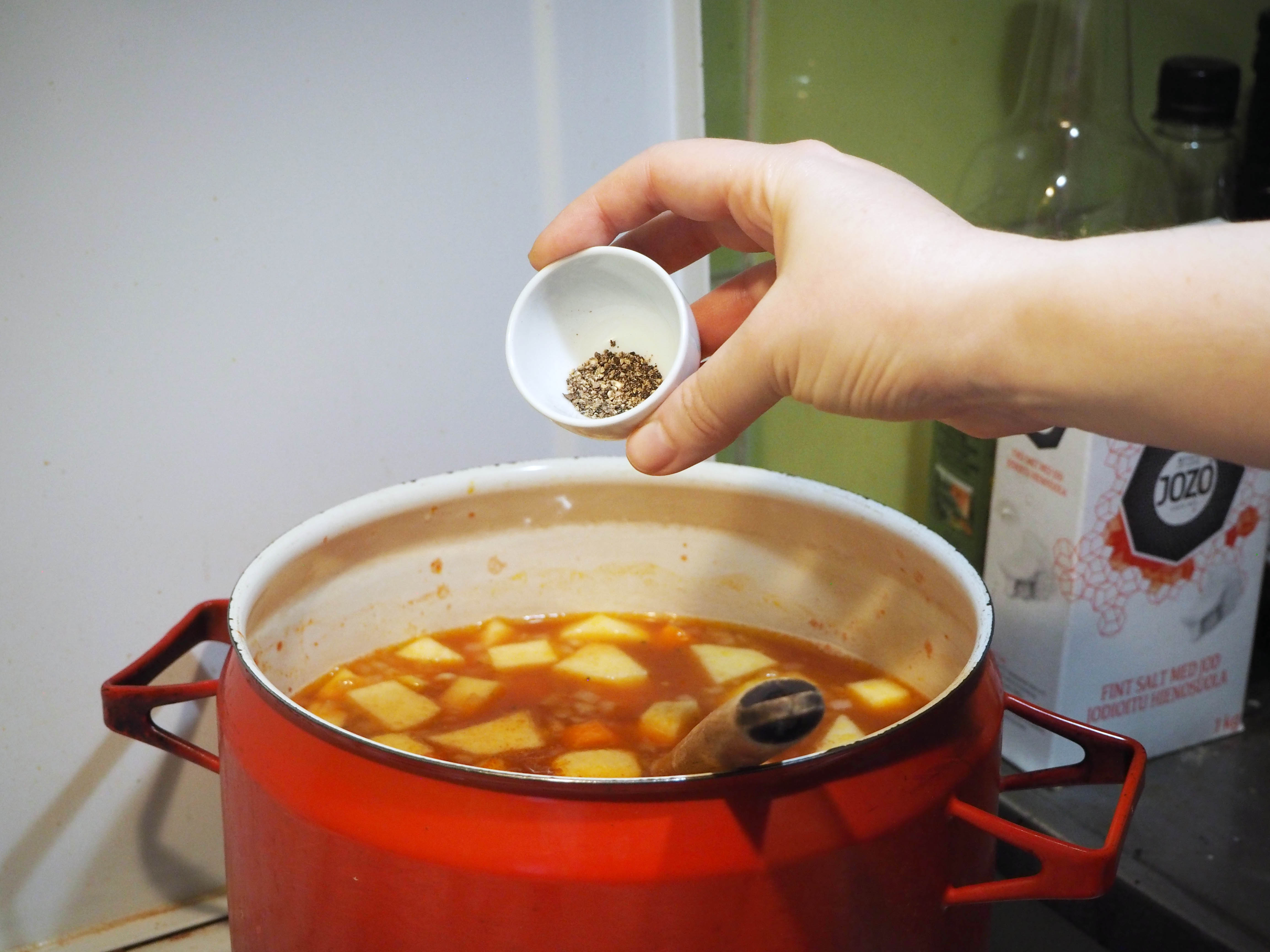 4. Add vegetable broth, cayenne pepper, salt and pepper, give it a stir and cover the pot. Let it boil. When it starts boiling, lower the heat to medium and cook for 20-25 minutes, until the vegetables are tender.