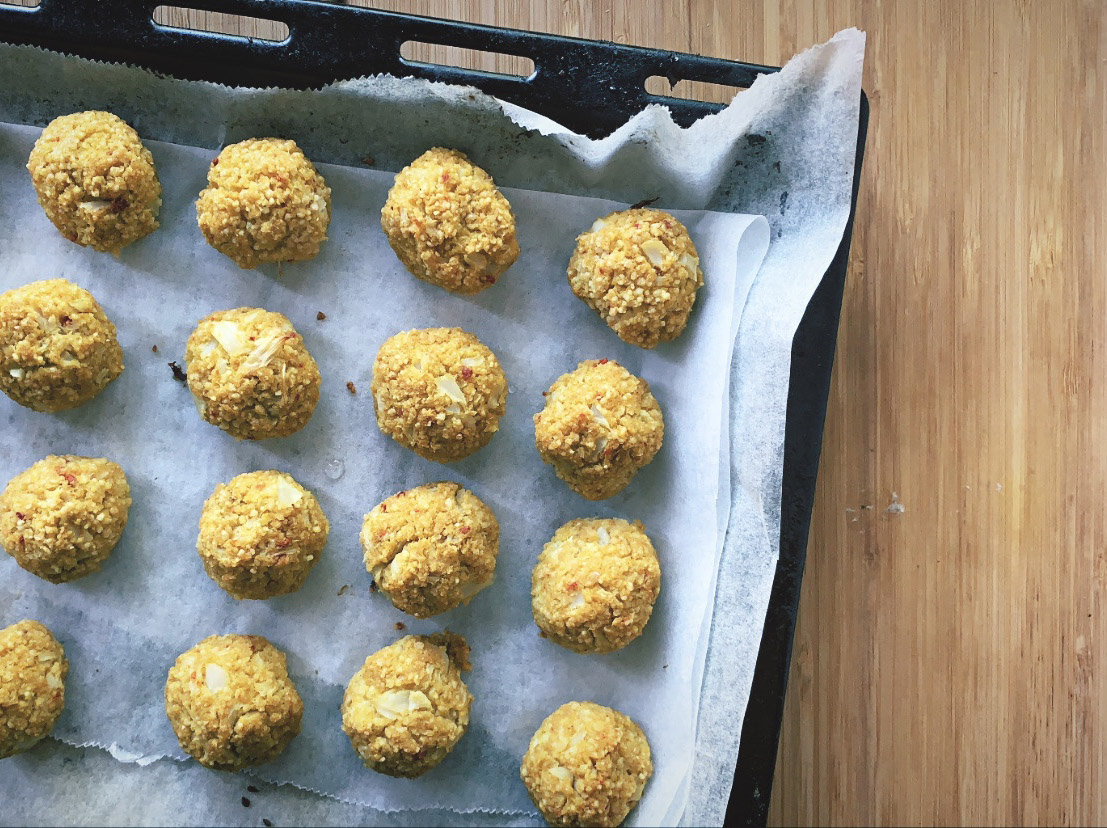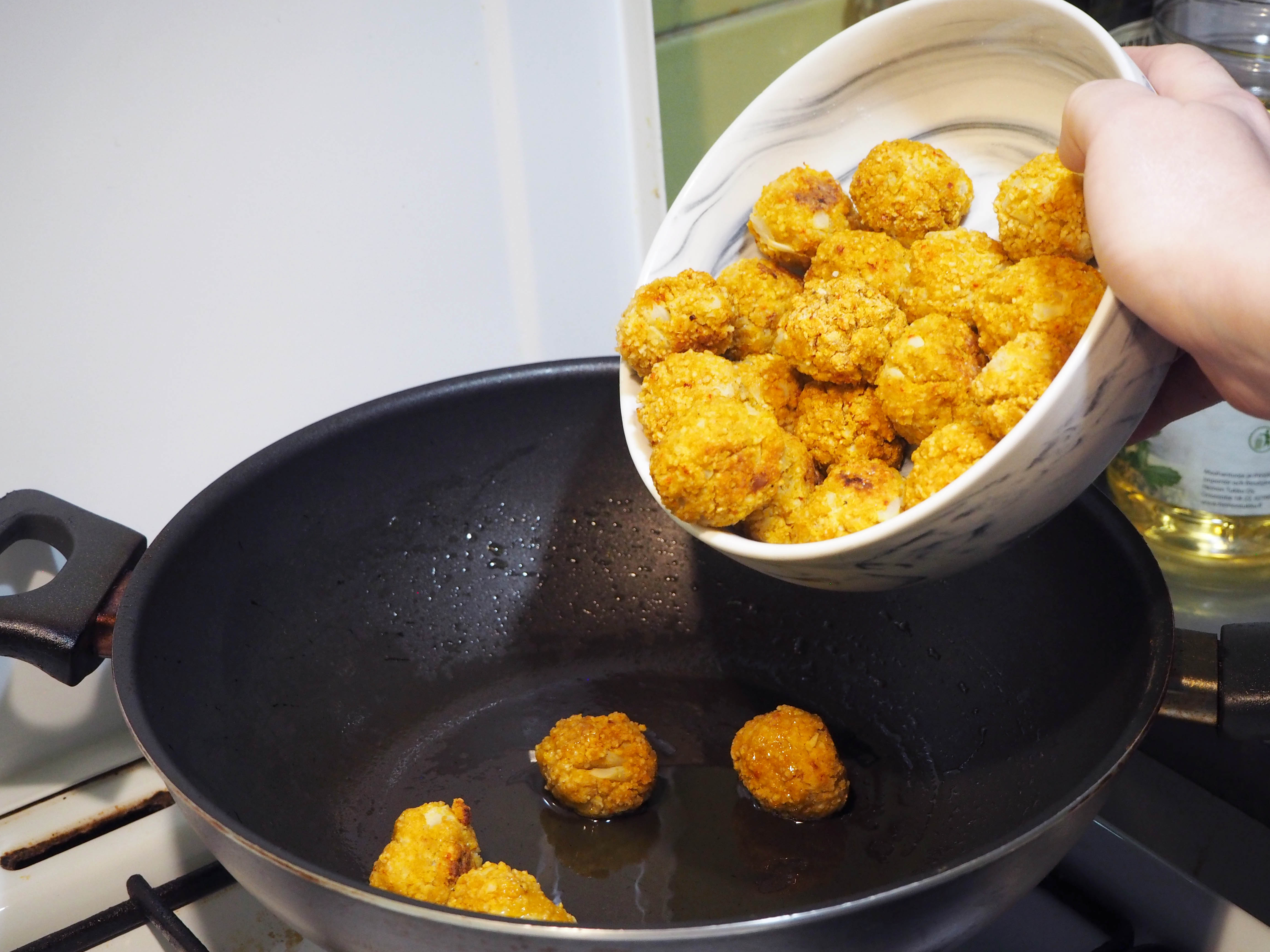 I always liked veggie balls, even before I became a vegetarian. You can use an endless variety of ingredients to make them. This one has cauliflowers as the vegetable base, accompanied by couscous and spices.