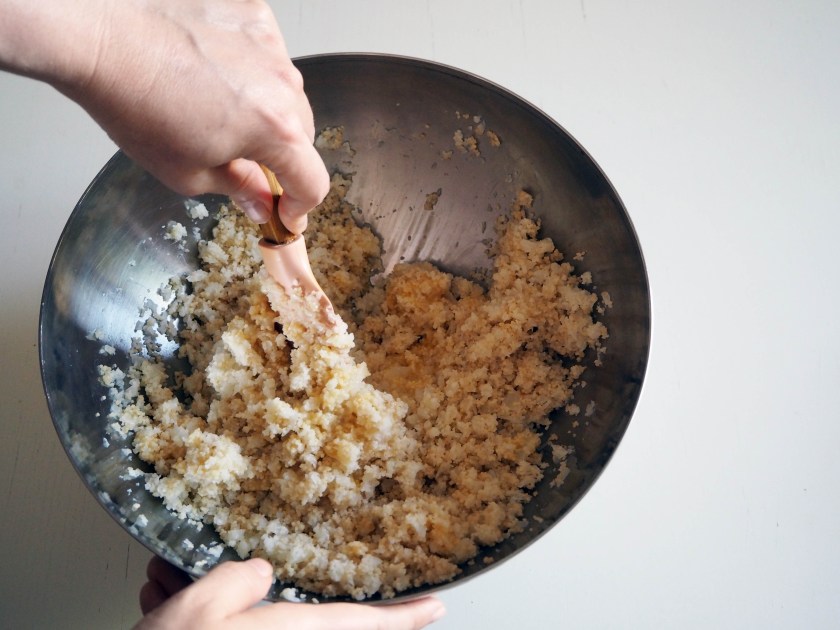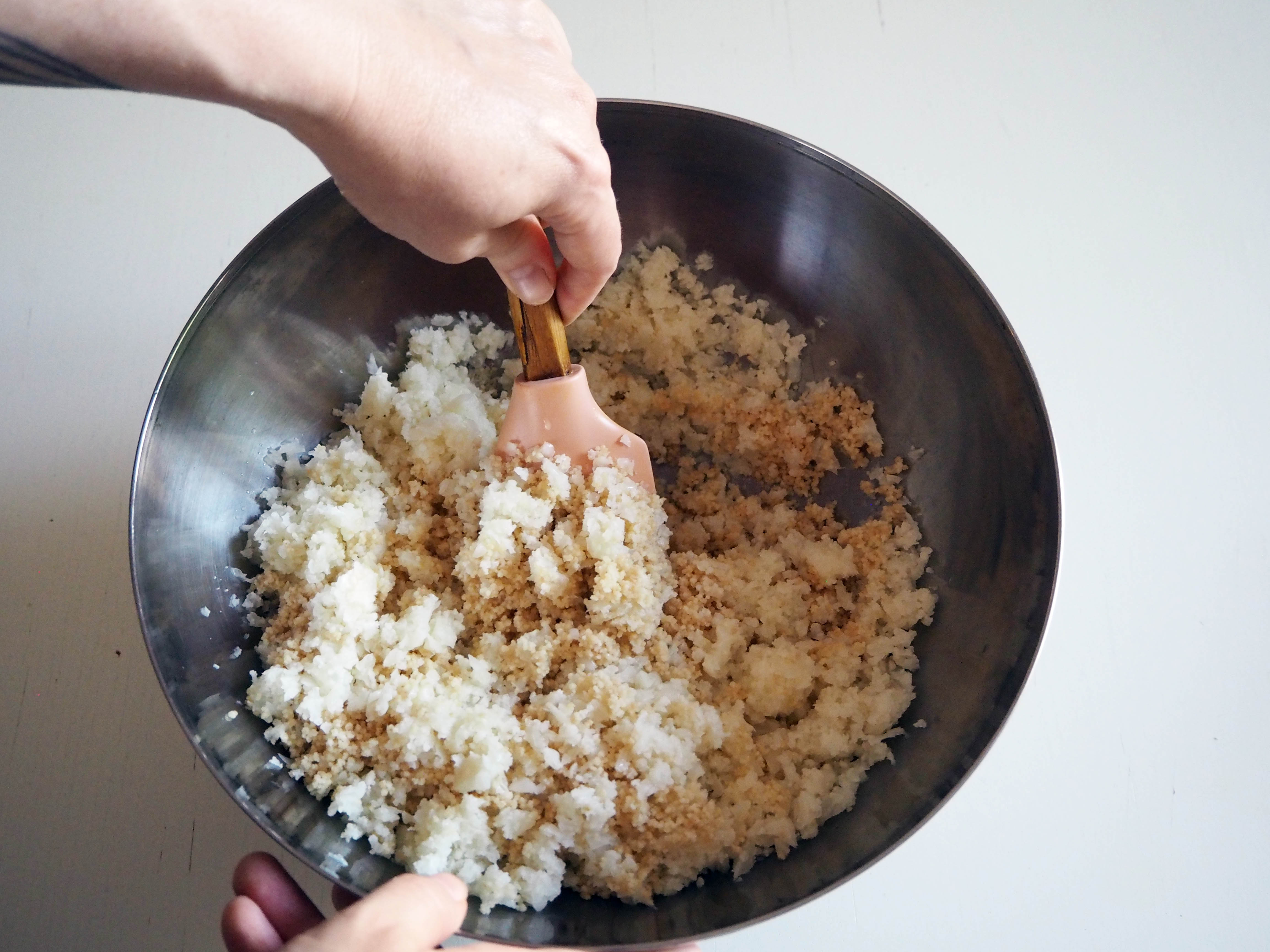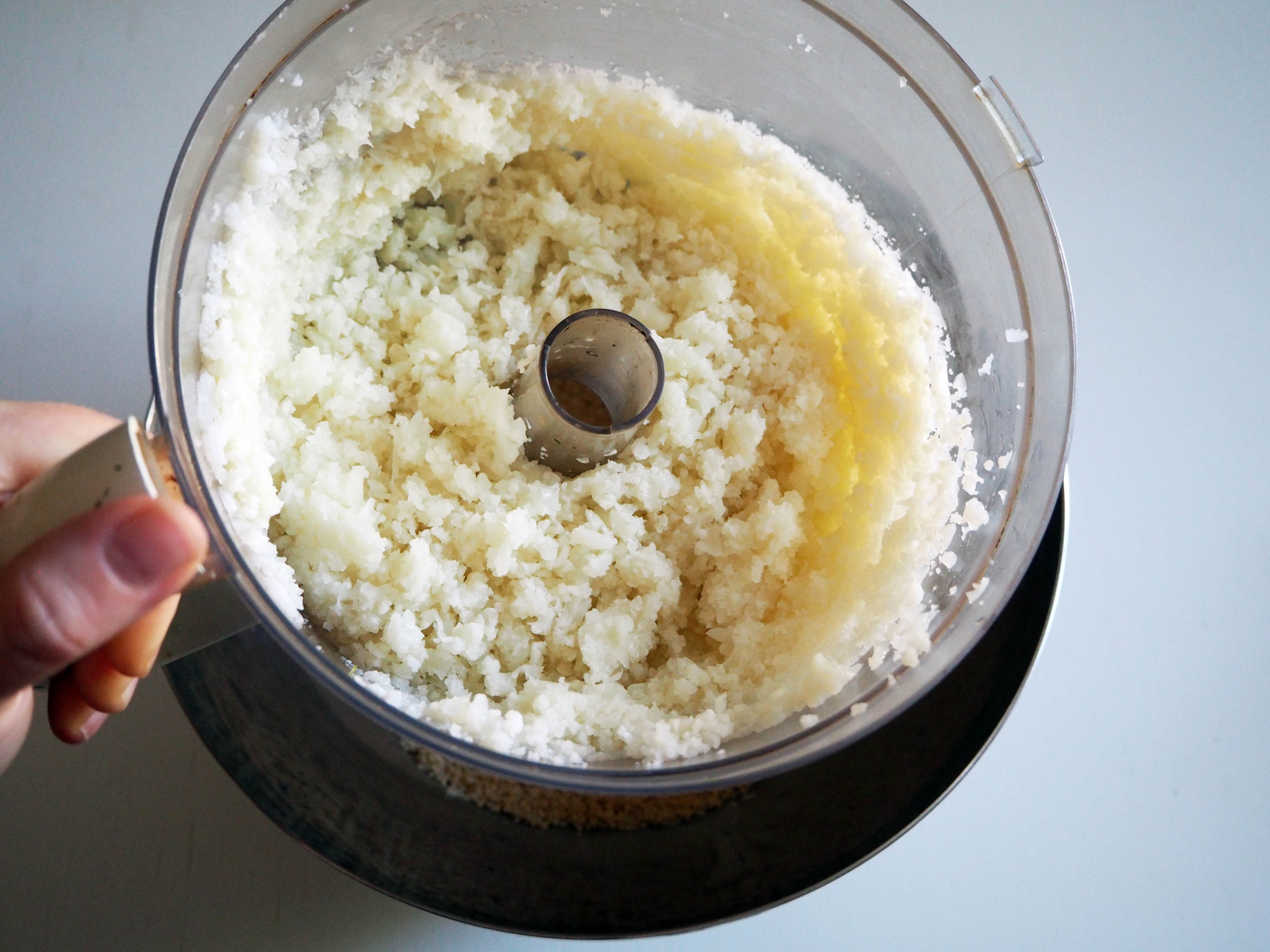 2. Drain the cauliflower, wash with cold water a little to cool and then put in a food processor. Shred it into small pieces in only a few seconds. Don’t use the food processor for too long or again, they will get too close to a puree.