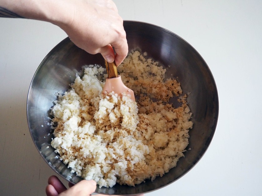 1. Preheat the oven to 190C. Put cauliflower florets in a large pan and cover with water. Cover the pan and put on medium high heat. Cook the cauliflower florets until they are slightly tender, but not too soft (so that they are easy to shred in the food processor but not too soft to turn into a puree).