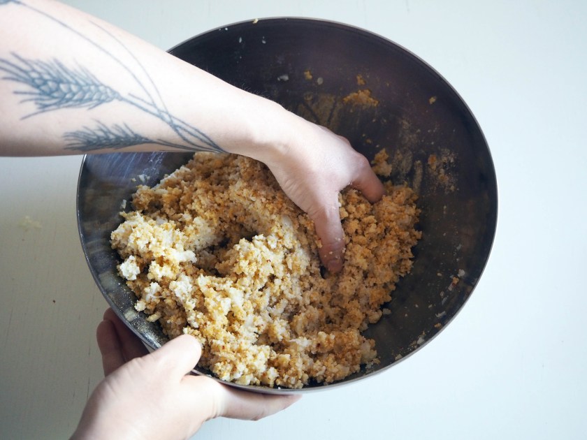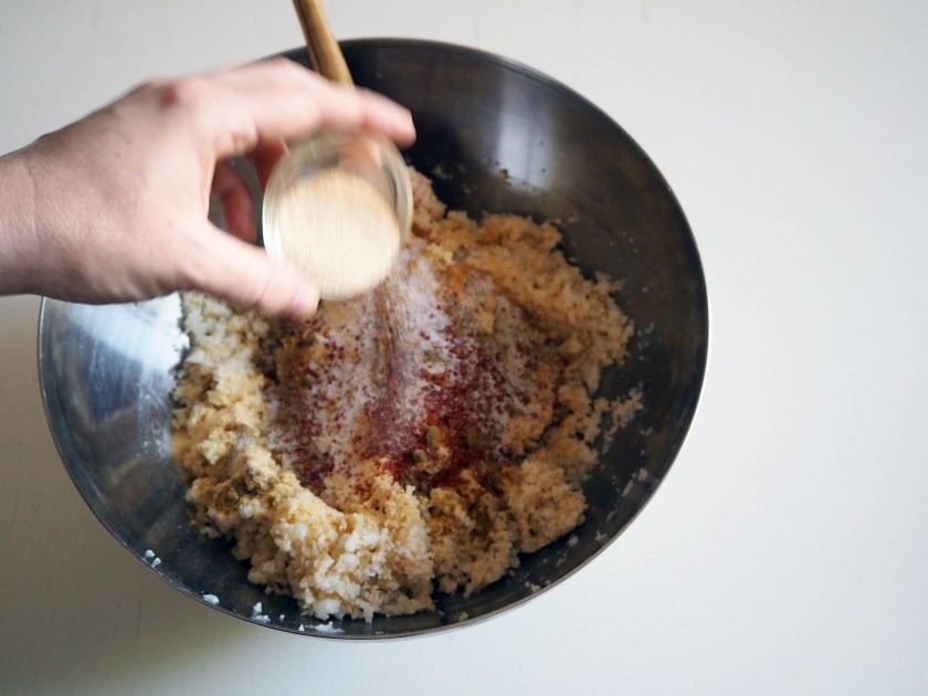 The most important part of the recipe is cooking the cauliflower. You should cook it just to have it a little tender, not more. If you cook it too much, it will soften too much and turn into a puree in the food processor. You don’t want cauliflower puree, you want small pieces of cauliflower. And the only reason for cooking (boiling) is to chopping in food processor easier. So be careful with that!