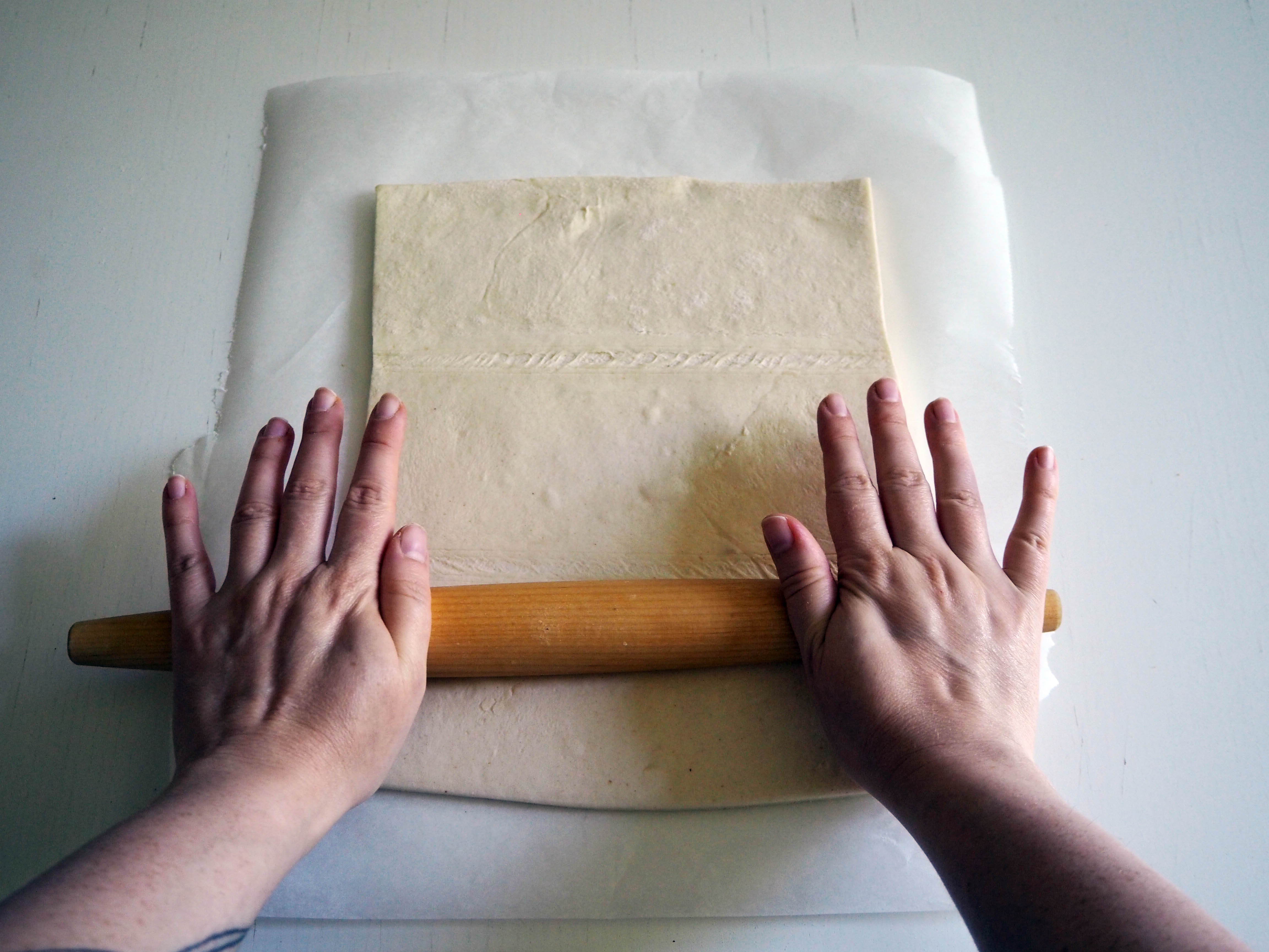 2. On a baking paper, roll out the pastry a little bit (according to the size of your oven). Leaving 1 cm space from edges, prick the pastry with a fork.