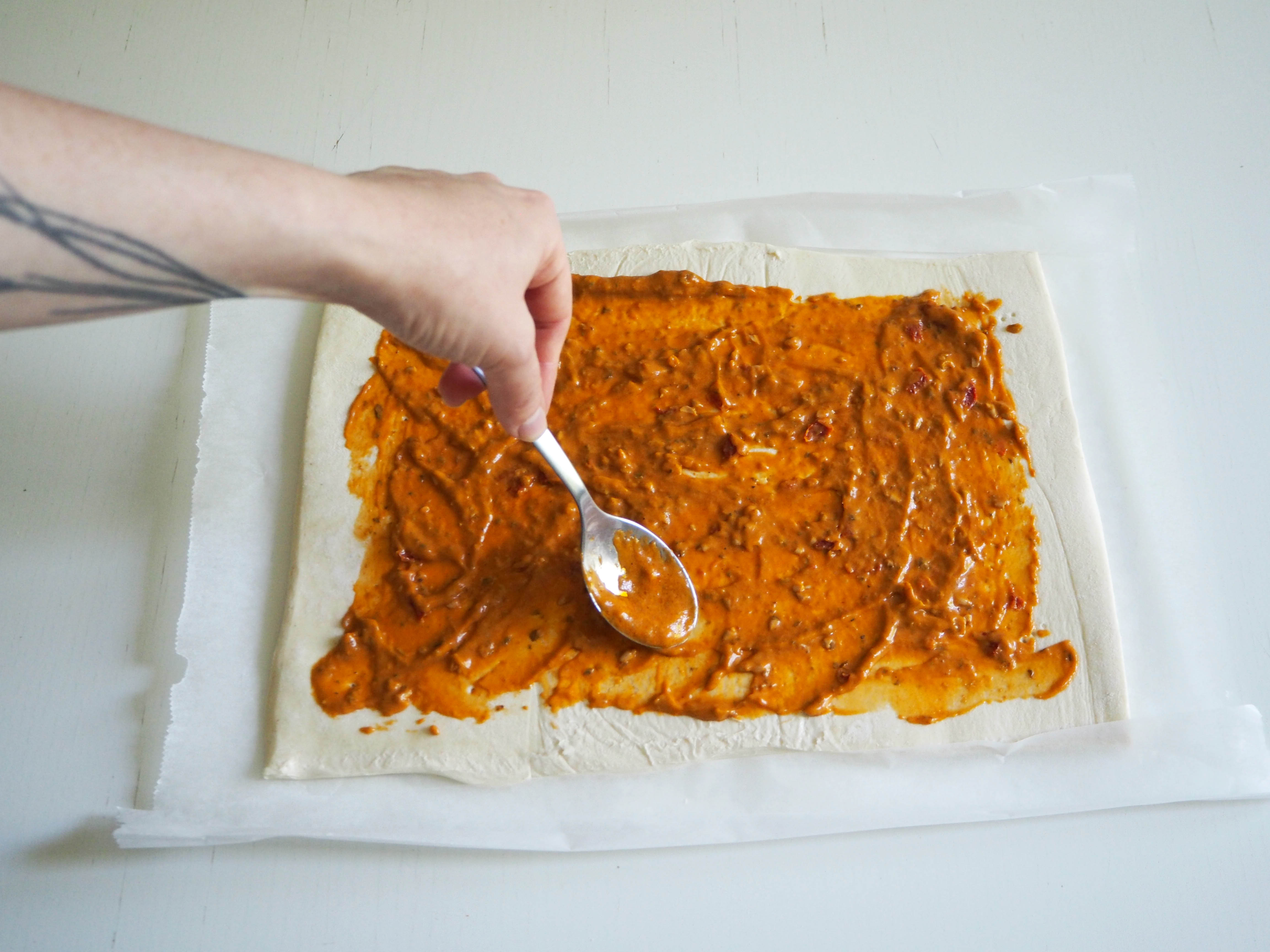 3. Leaving 1 cm space from edges again, spread the red pesto on the pastry.