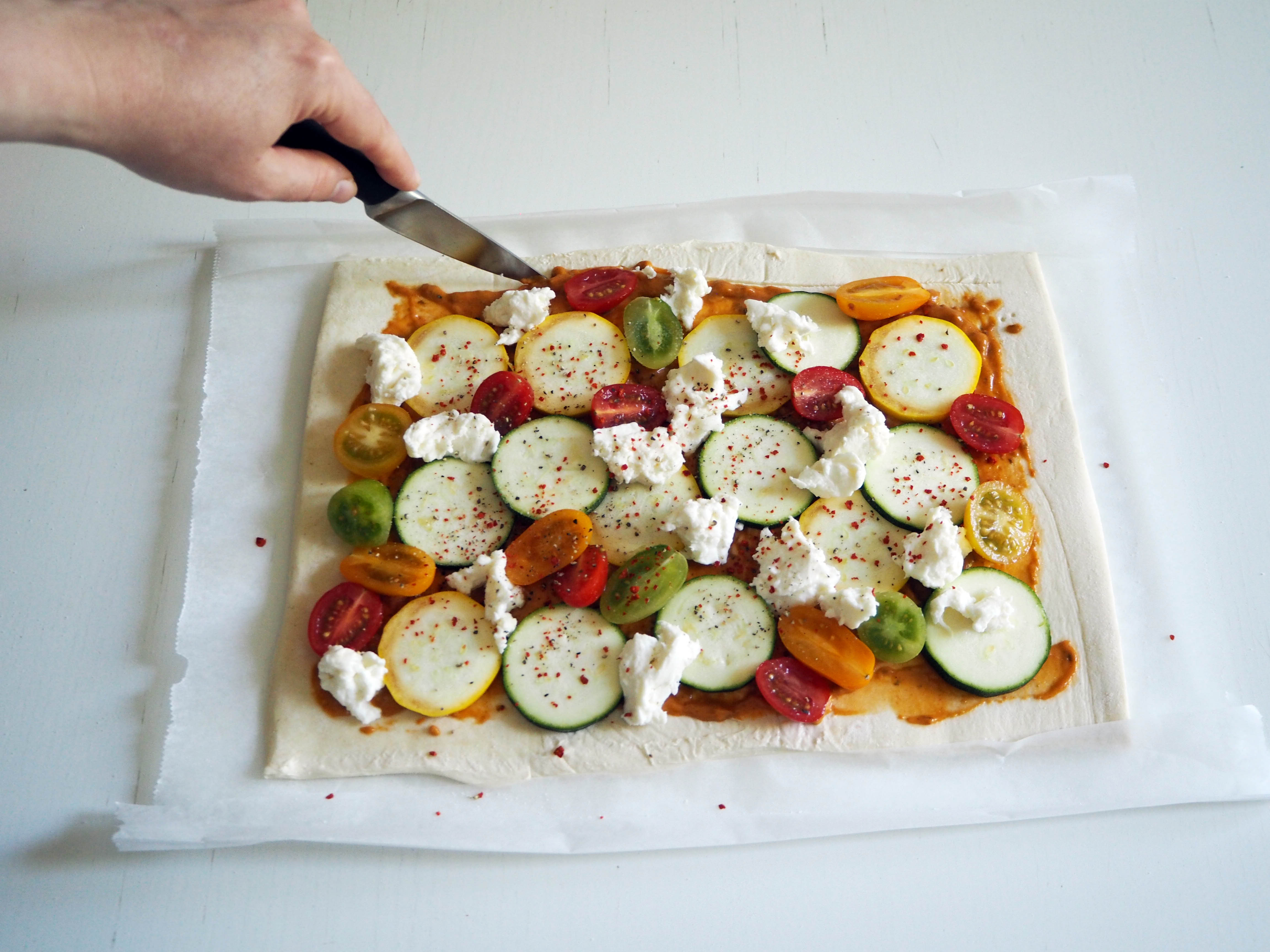 4. Arrange the veggies, tomatoes and mozzarella pieces on the area with pesto.