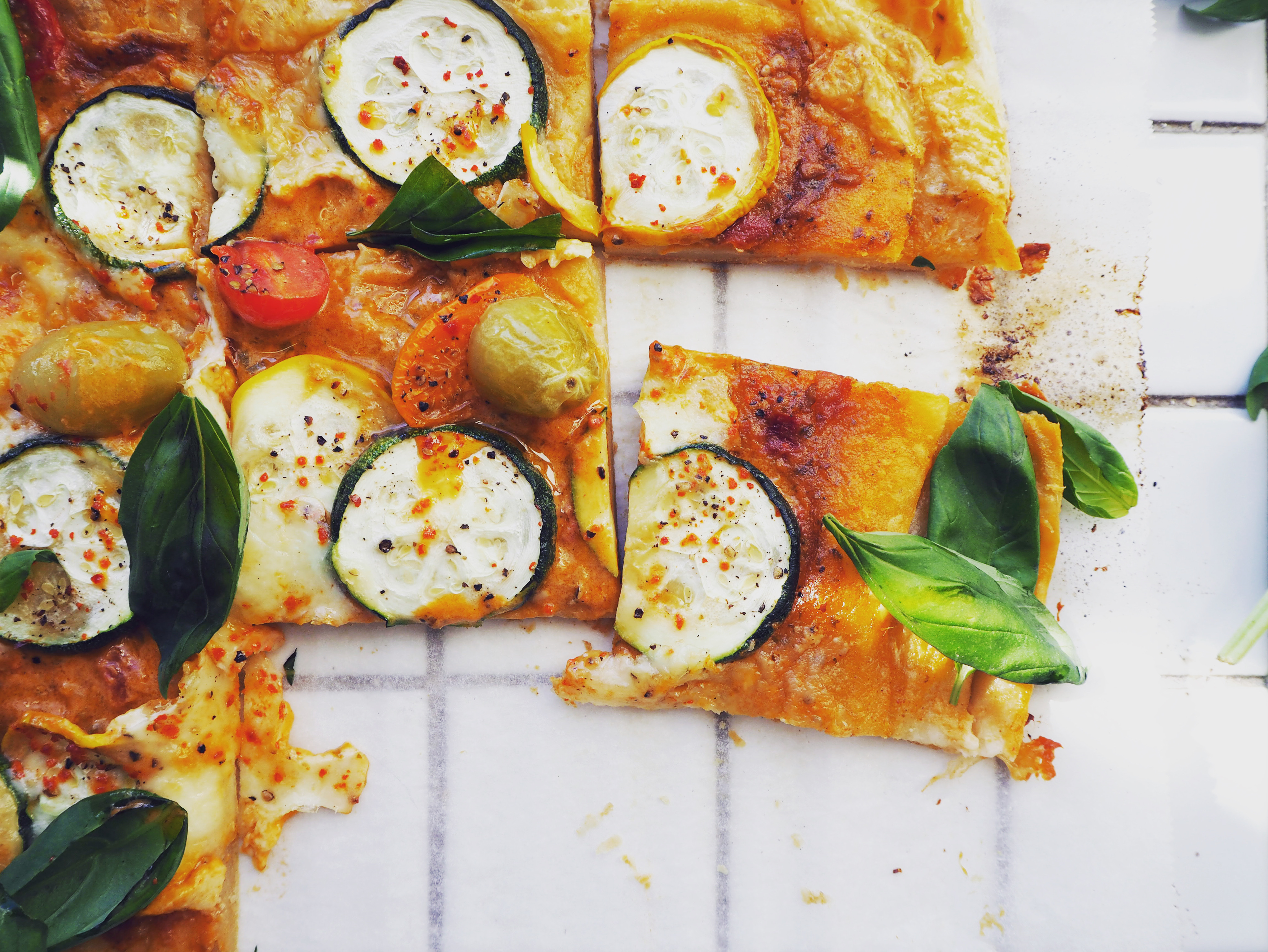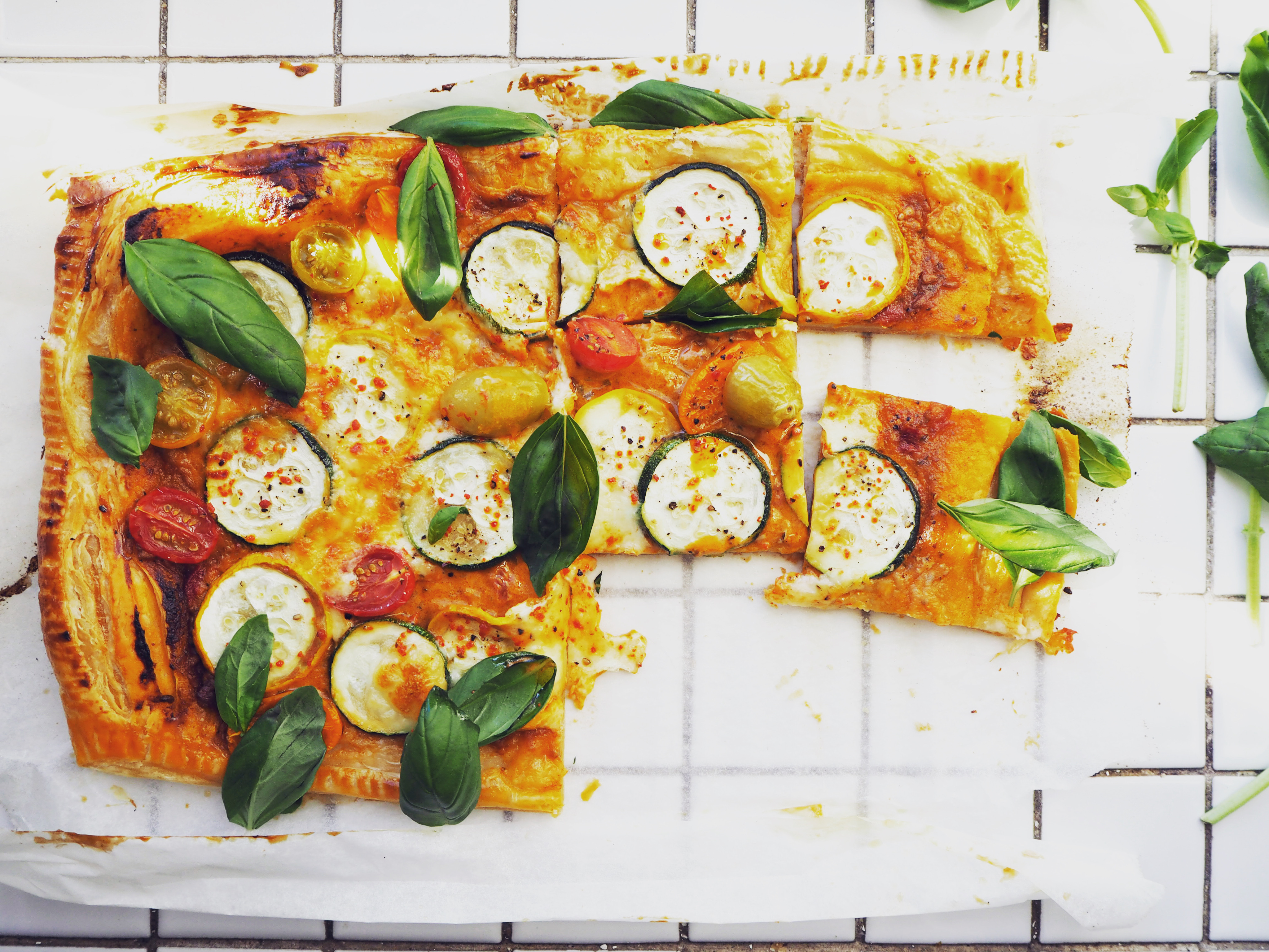7. Drizzle olive oil and put in medium part of the oven. Bake for about 30-35 minutes, until the pastry is golden brown and vegetables are cooked. Cool on a wire rack for about 10 minutes and then serve. Decorate with fresh basil leaves if you like. Enjoy!