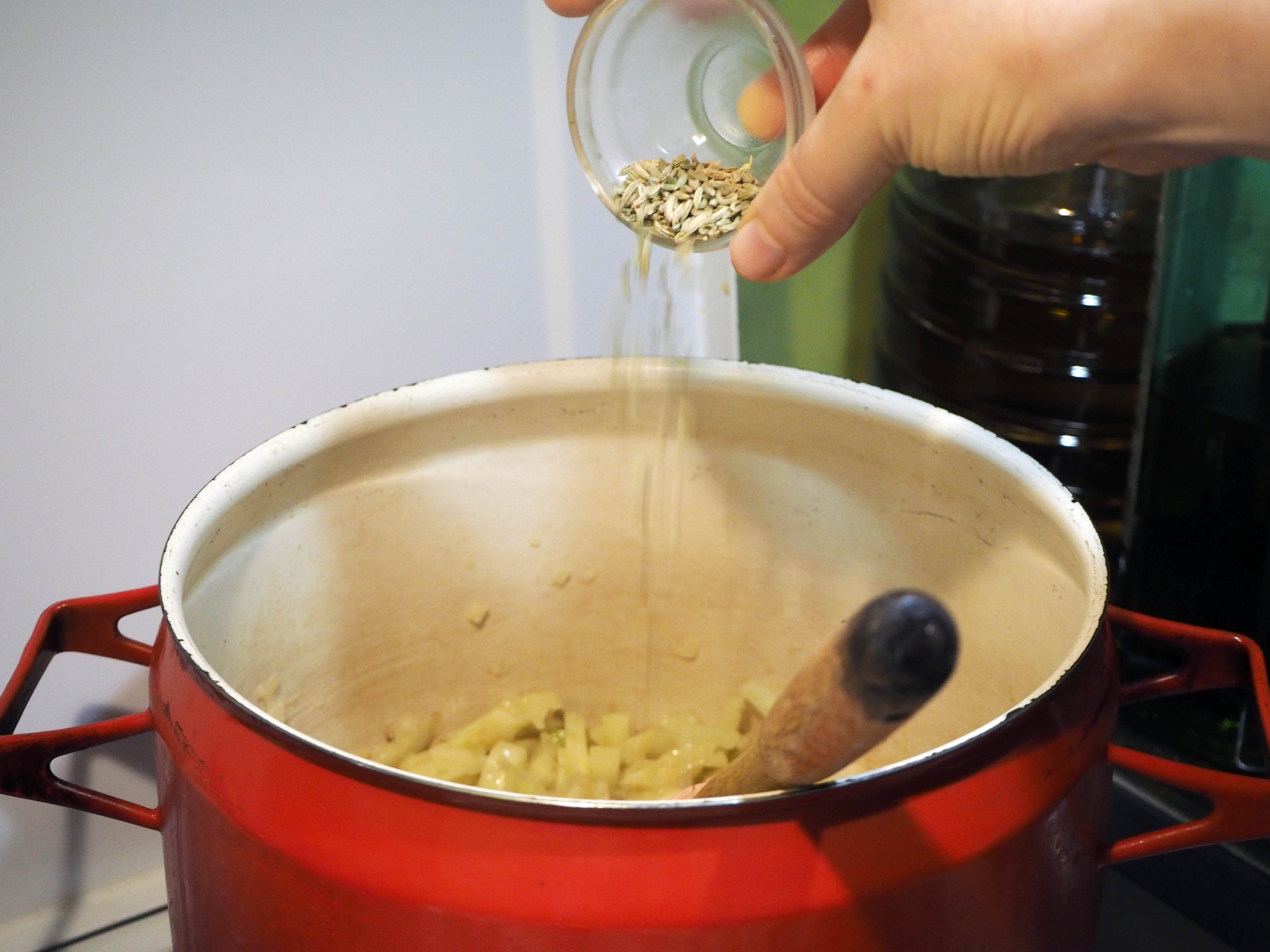 4. Add fennel seeds and continue to cook by stirring for 1 more minute.