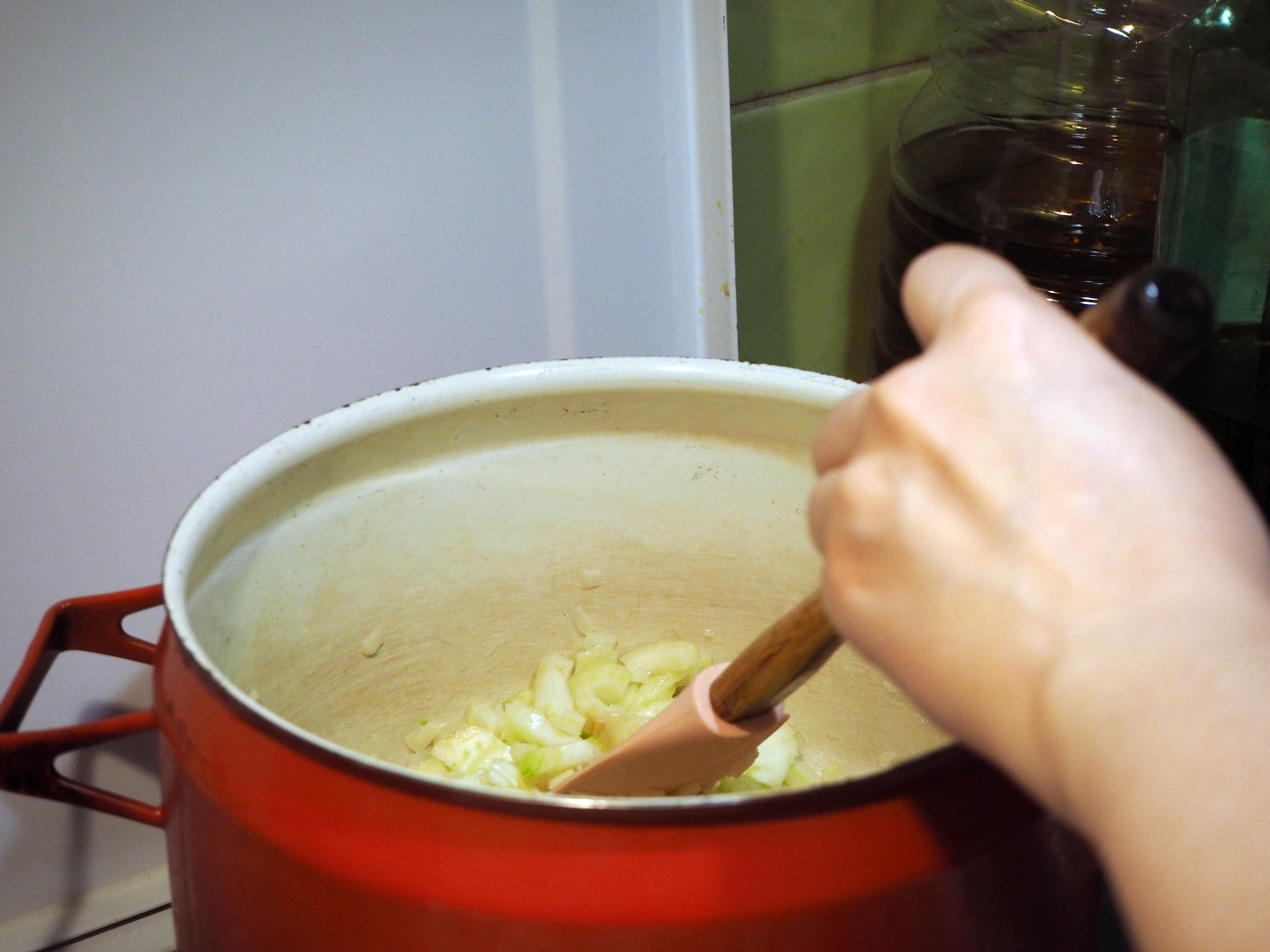 3. Now we make the soup: In a pot, put the olive oil and warm for about 30 seconds on medium high heat. Add onion and fennel and cook, frequently stirring, for about 5 minutes, until the onion is translucent and fennel is getting soft.