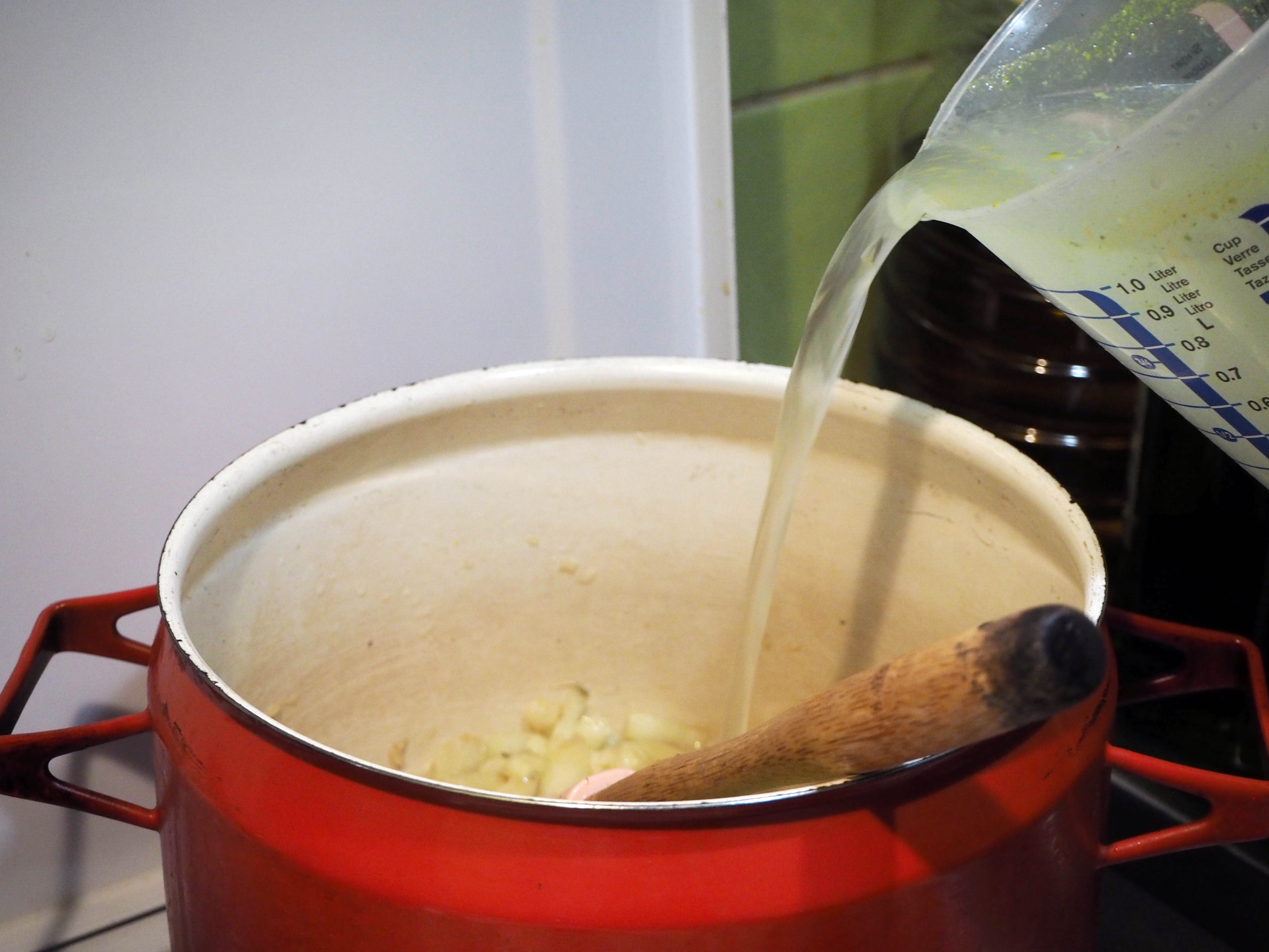 5. Add vegetable broth (or water), stir, cover the pan and let the soup come to a boil.