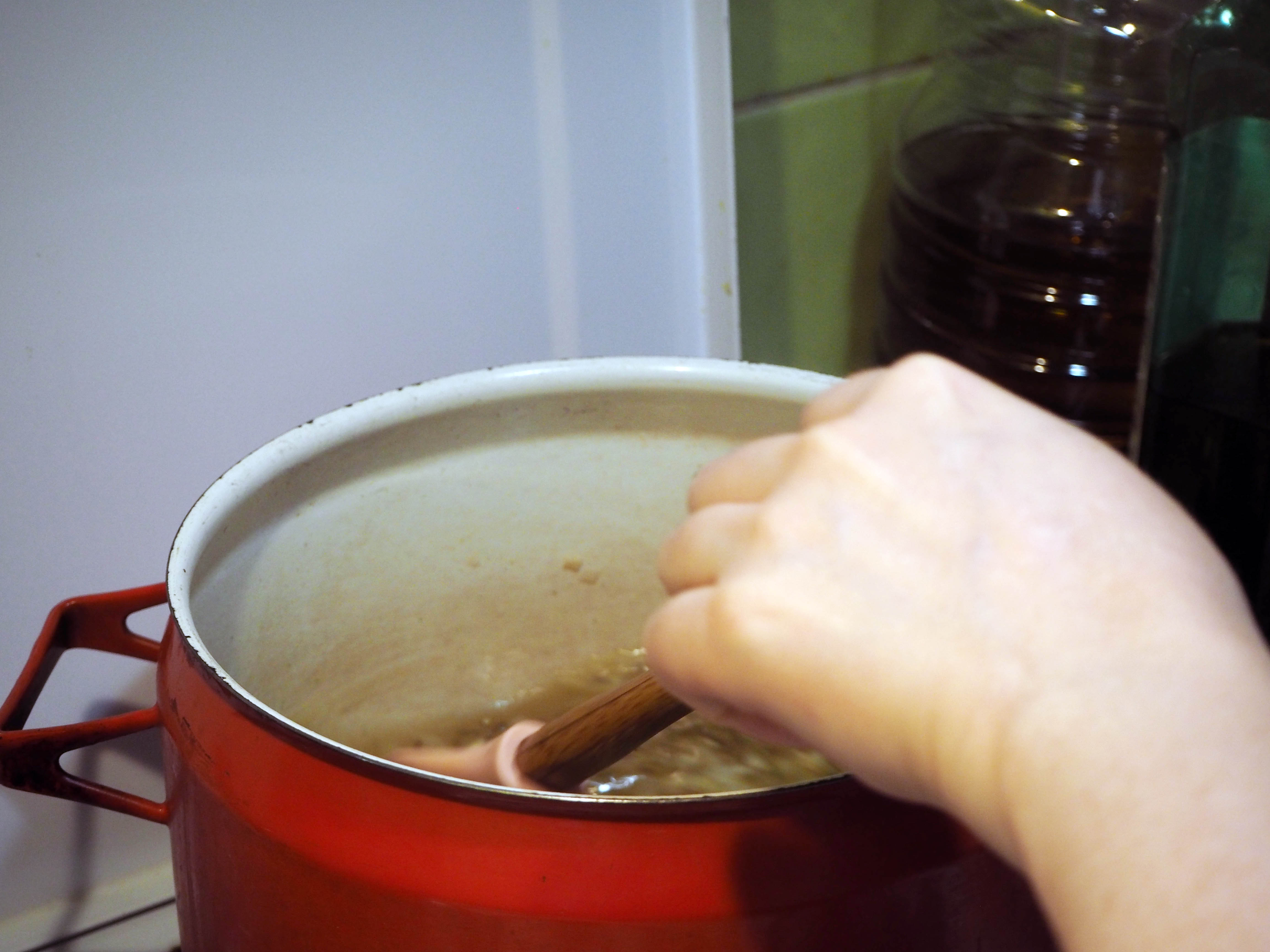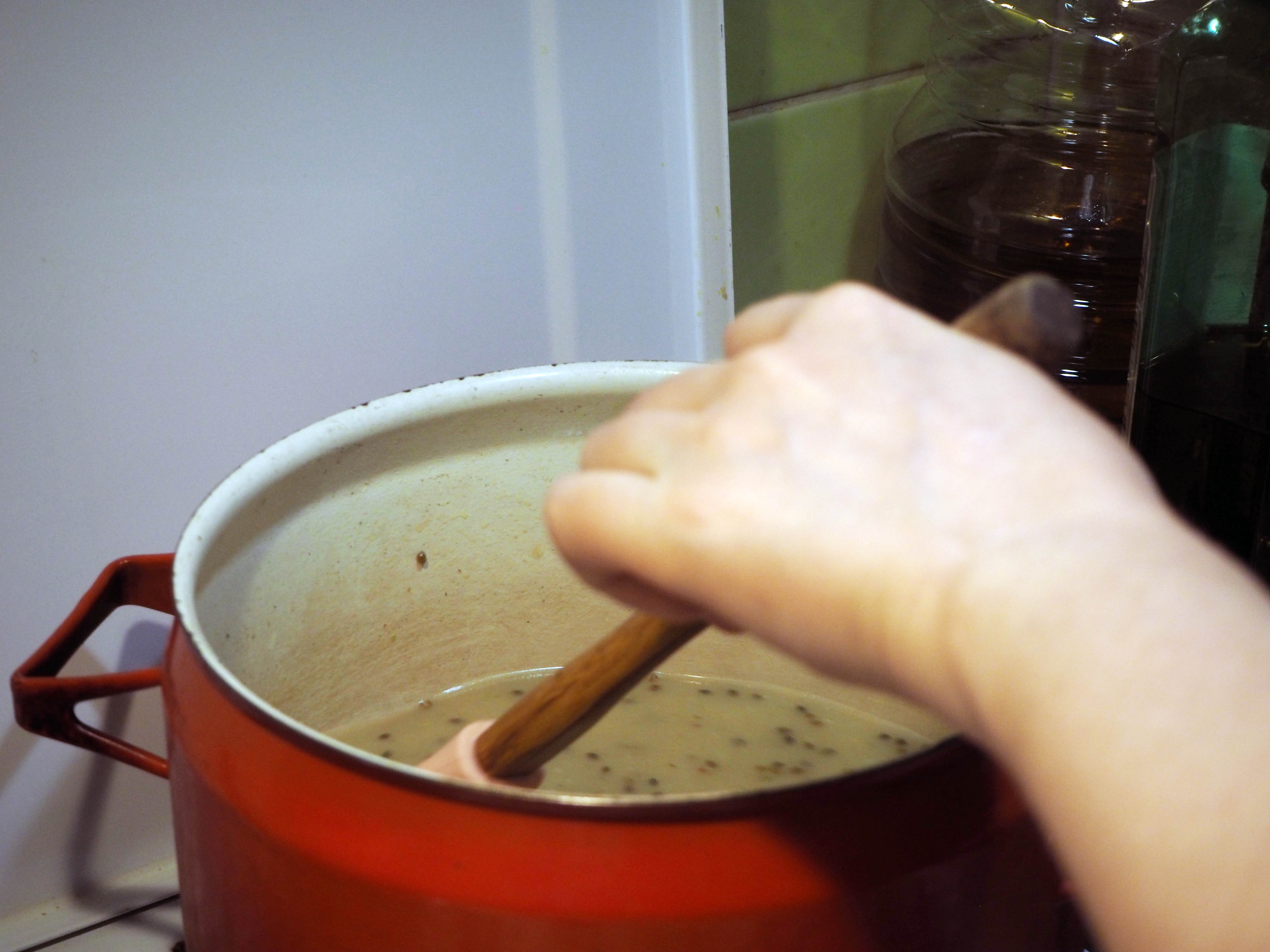 8. When the soup is fully cooked, turn off the heat. Using a hand blender, or by putting into a standing blender, puree the soup.