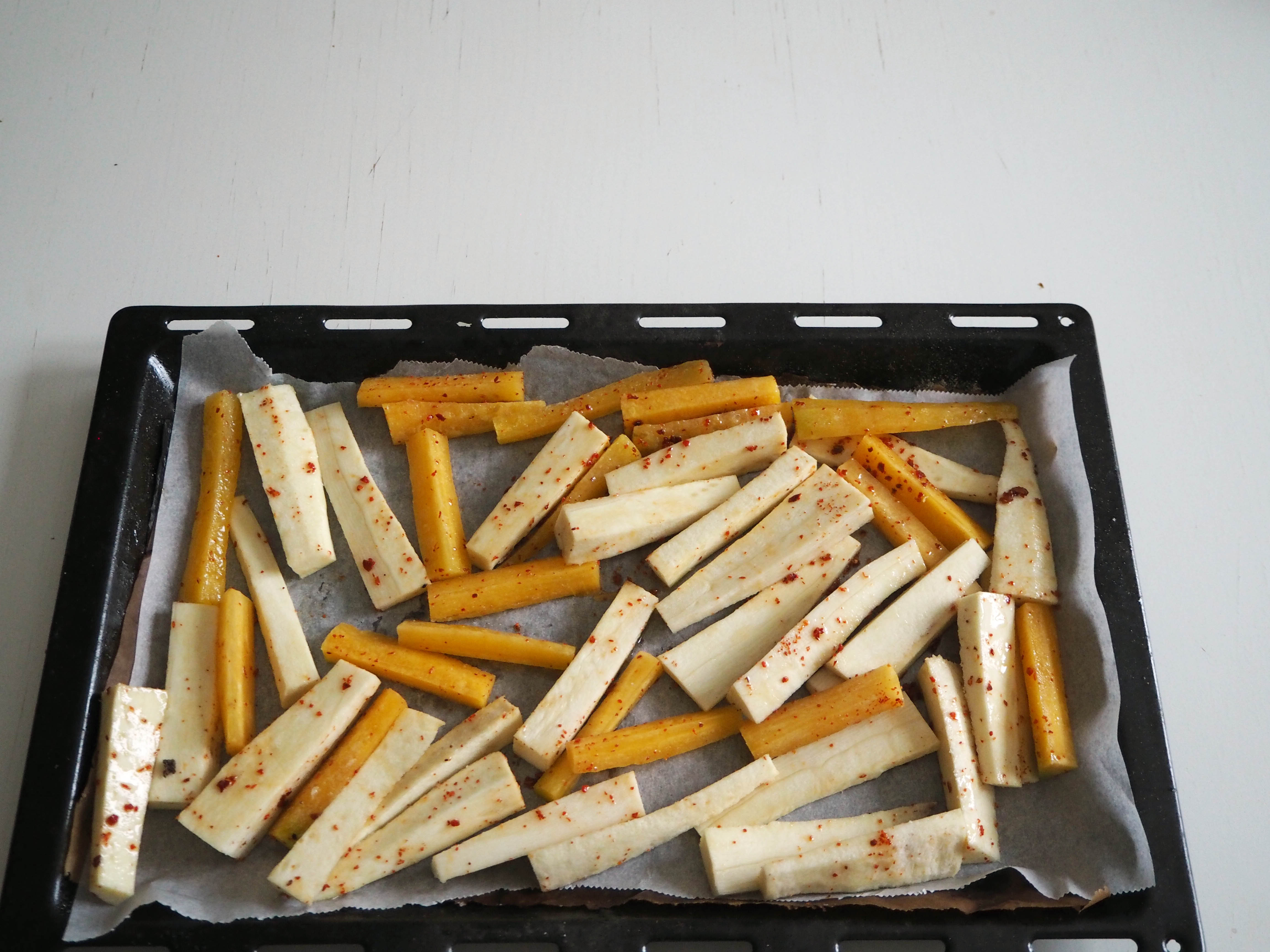 - Put your cut vegetables in a bowl. Add salt, chilli pepper flakes (if using) and olive oil and mix well using a spoon or a fork. Transfer the vegetables onto the baking tray in one even layer and roast in the middle section of the oven for about 40 minutes, until they are tender and a bit browned.