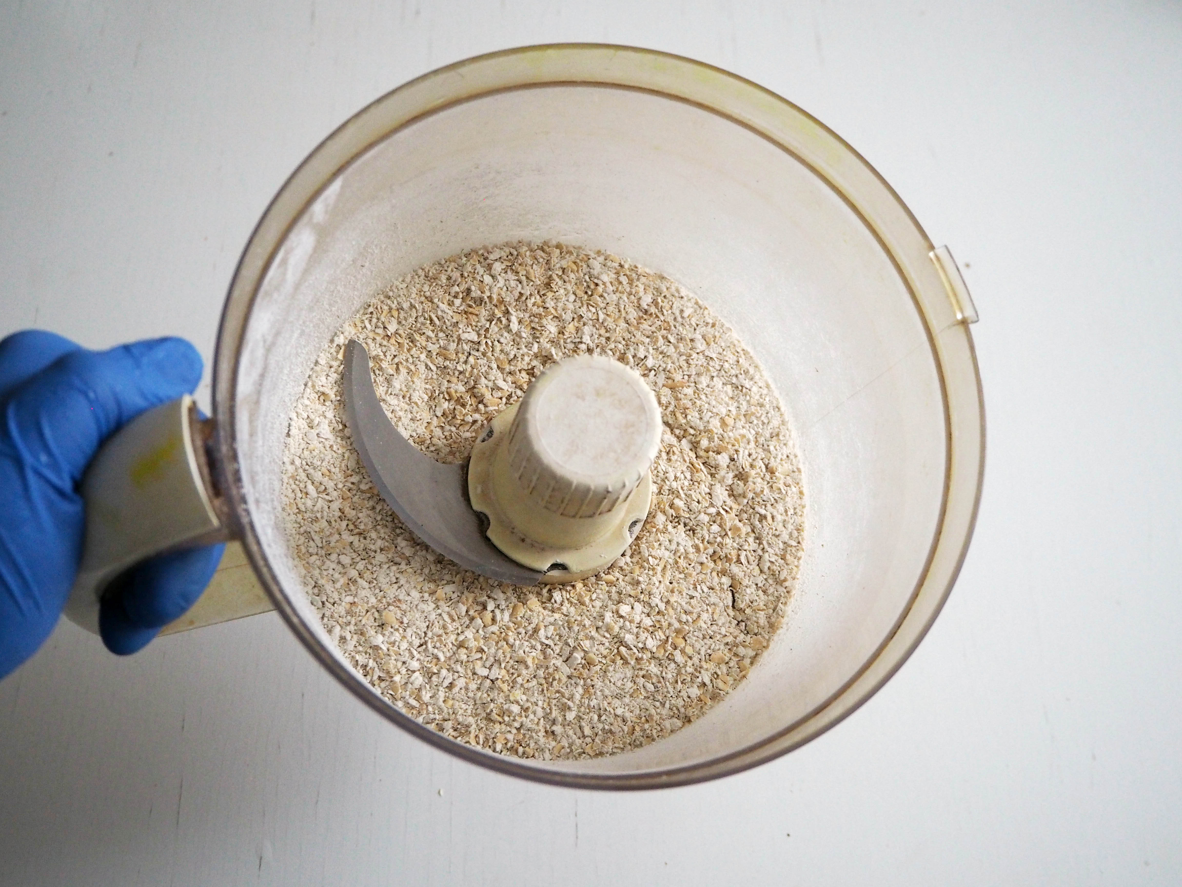 3. While the vegetables are roasting, prepare other stuff. First, the bread: Put the rolled oats in a food processor and blitz them until they become flour. Of course, if you are directly using oat flour, you don’t need that step.