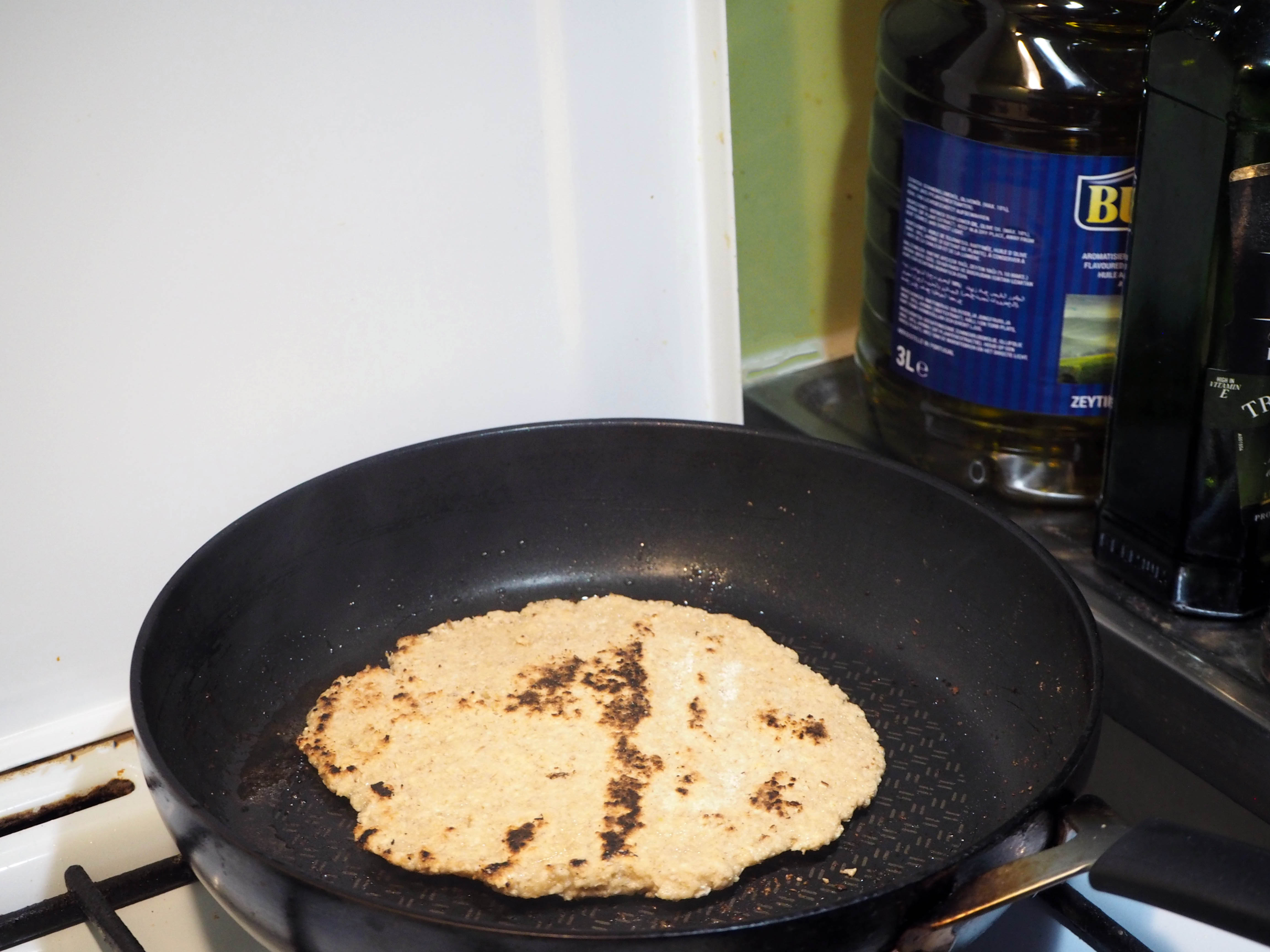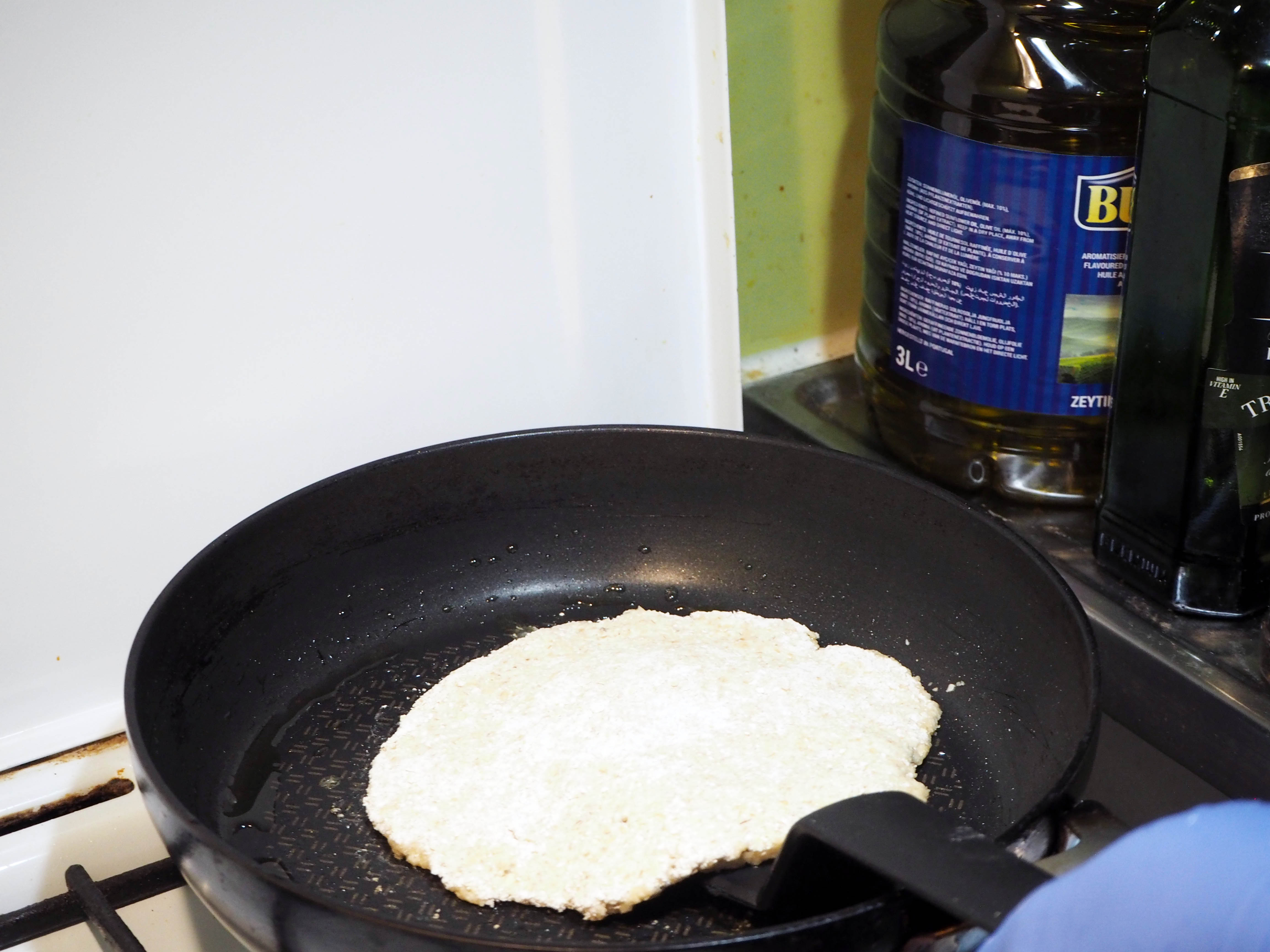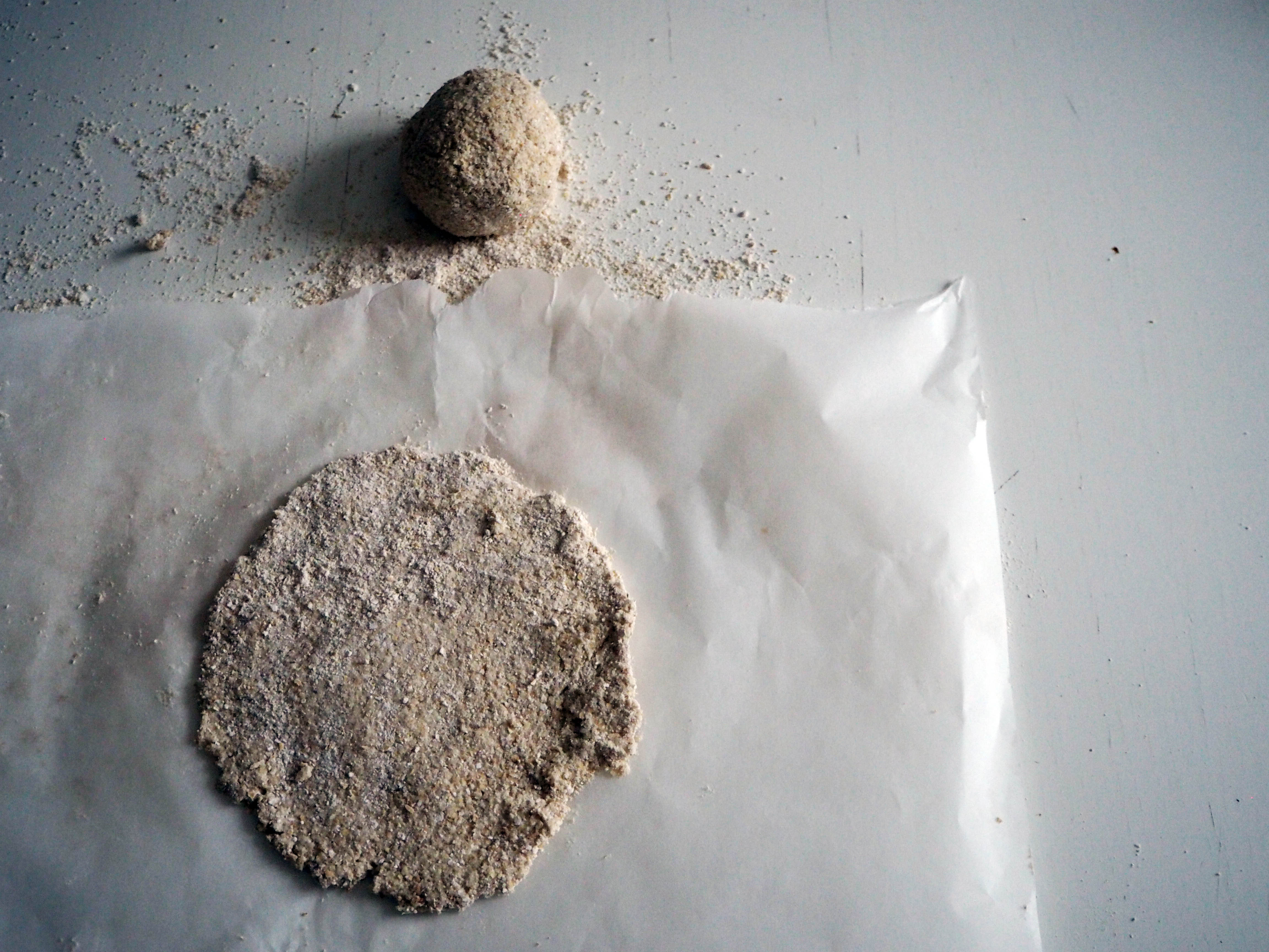 8. On a baking paper (to help you with flattening the bread and carrying it to the stove), put some more oat flour and flatten as much as you can without the dough breaking up. Mine was about 20cm in diameter.