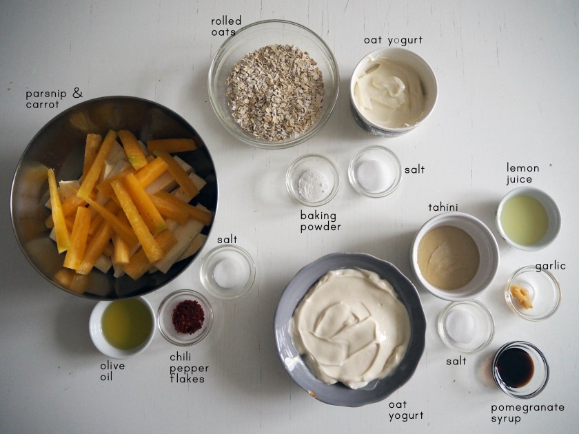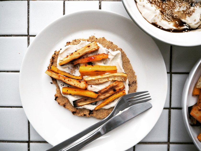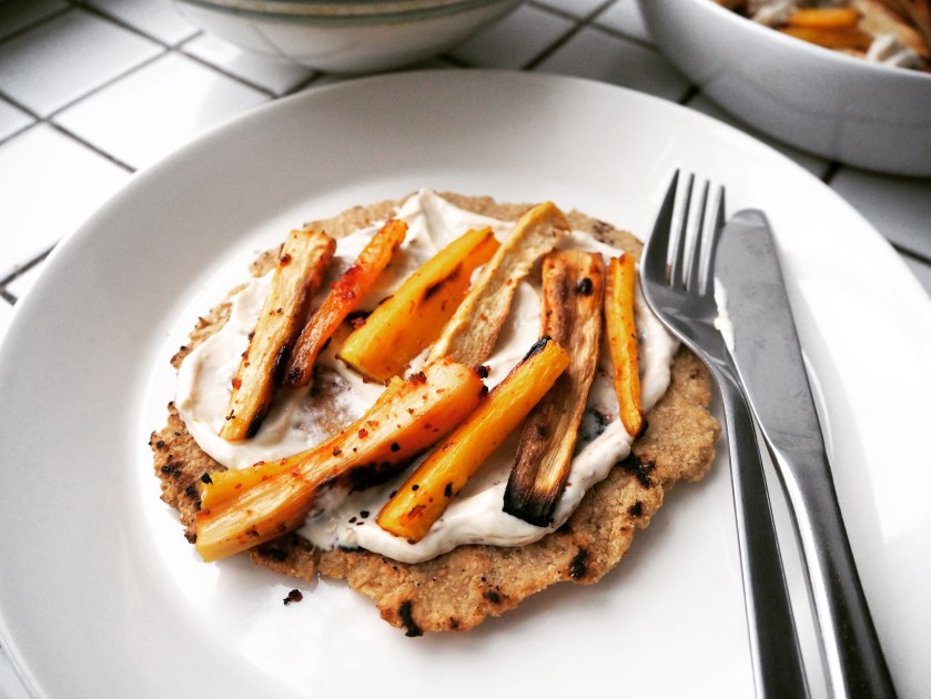 Today’s blog post is full of recipes: a bread, a sauce and a topping idea for the bread with roasted veggies. Most of the key ingredients – except for tahini – came from Oma Maa food bag I received in December.