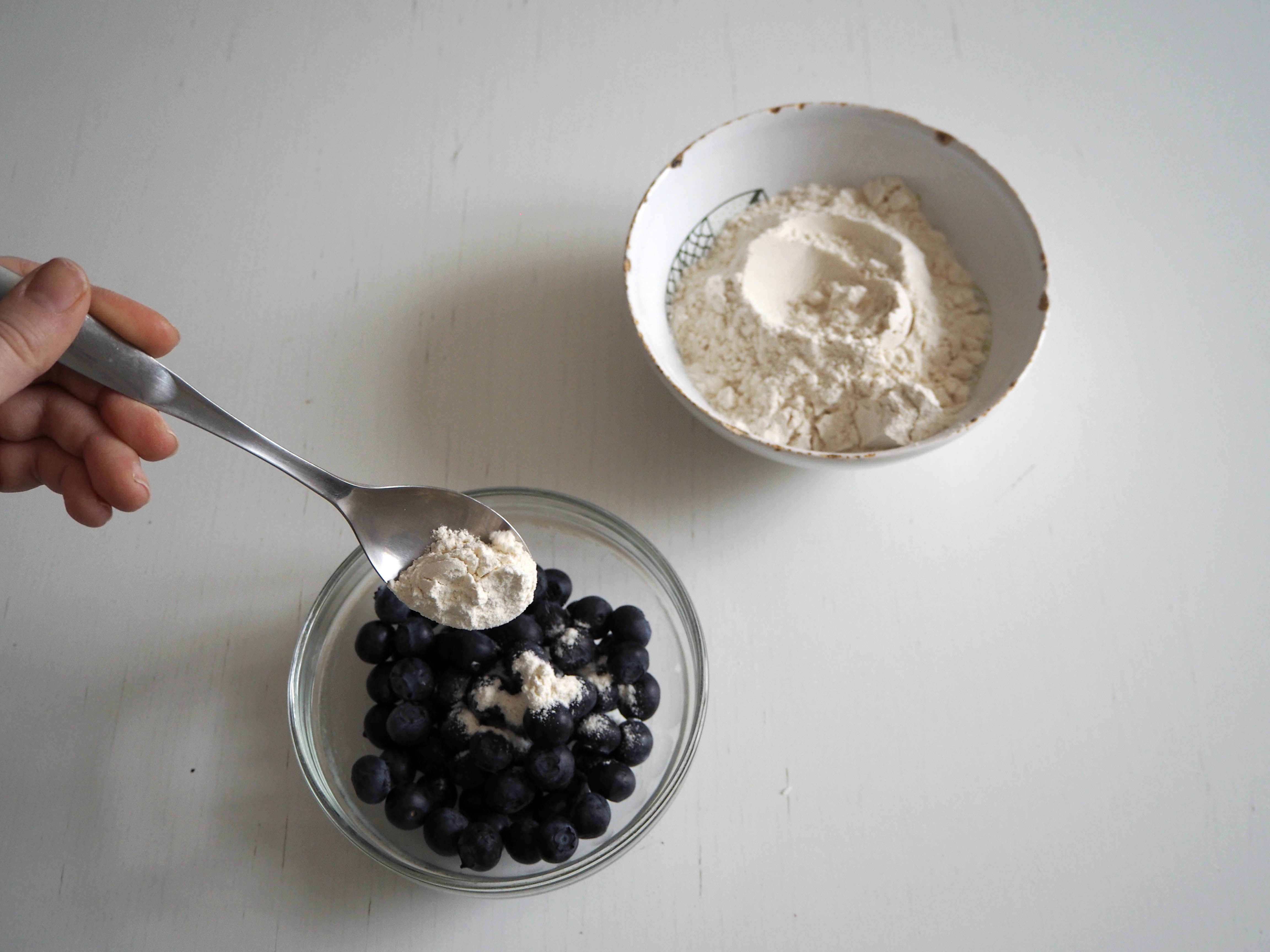 2. Take one tablespoon from the flour and mix it gently with blueberries to cover them completely in flour.