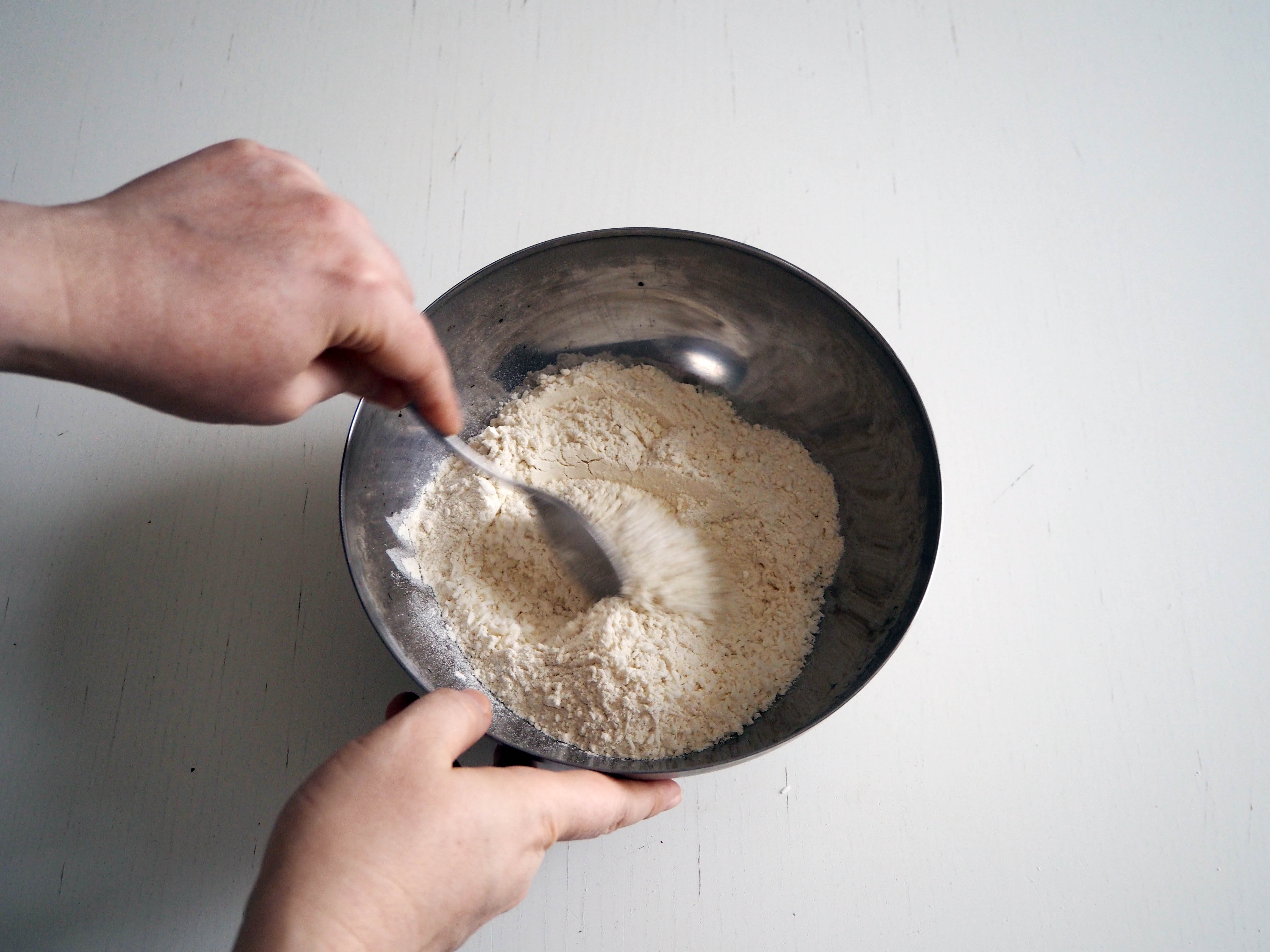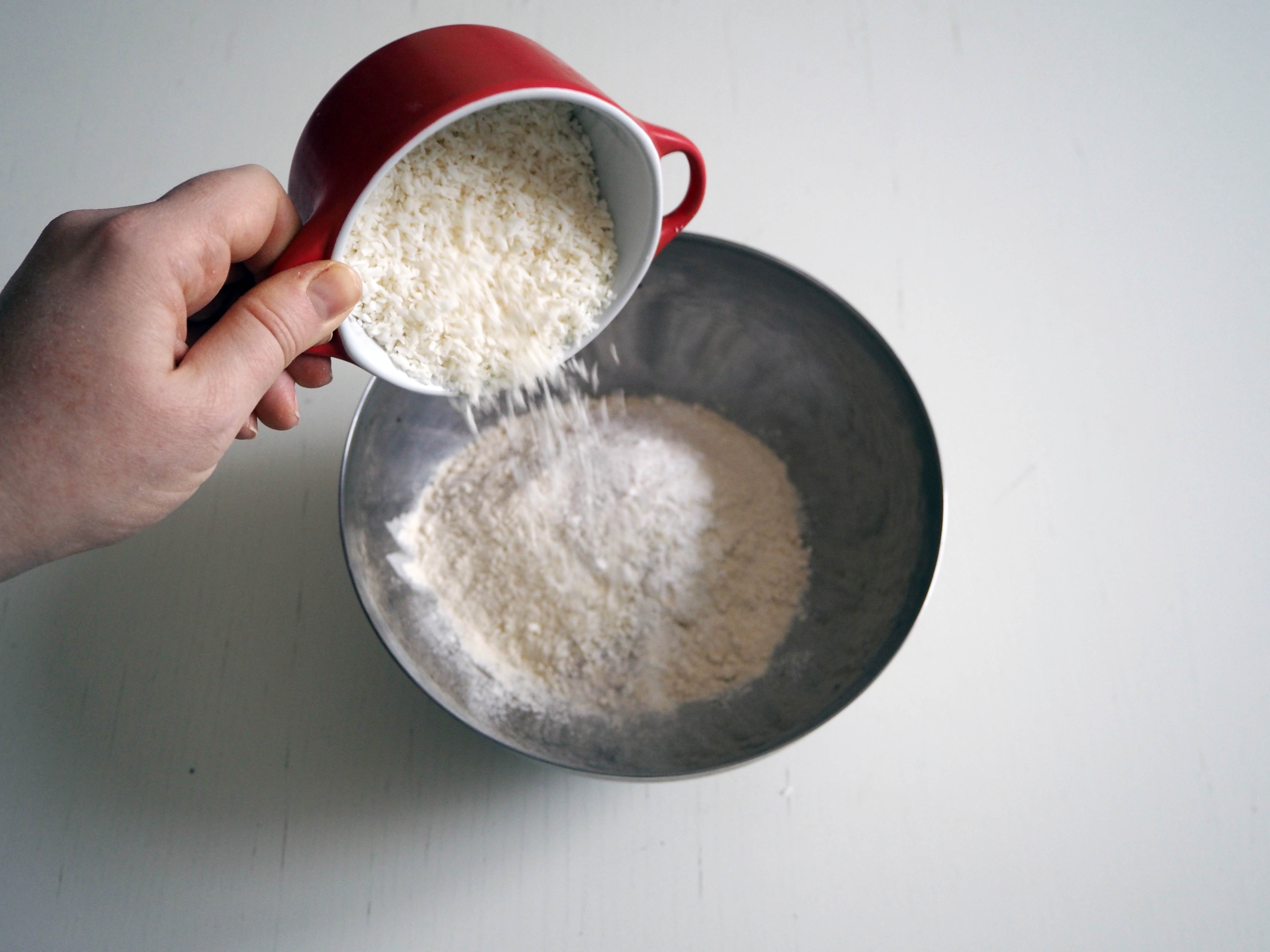3. Put the rest of the flour and the following ingredients in the list until (incl.) coconut, in a bowl. Whisk a little and put aside.