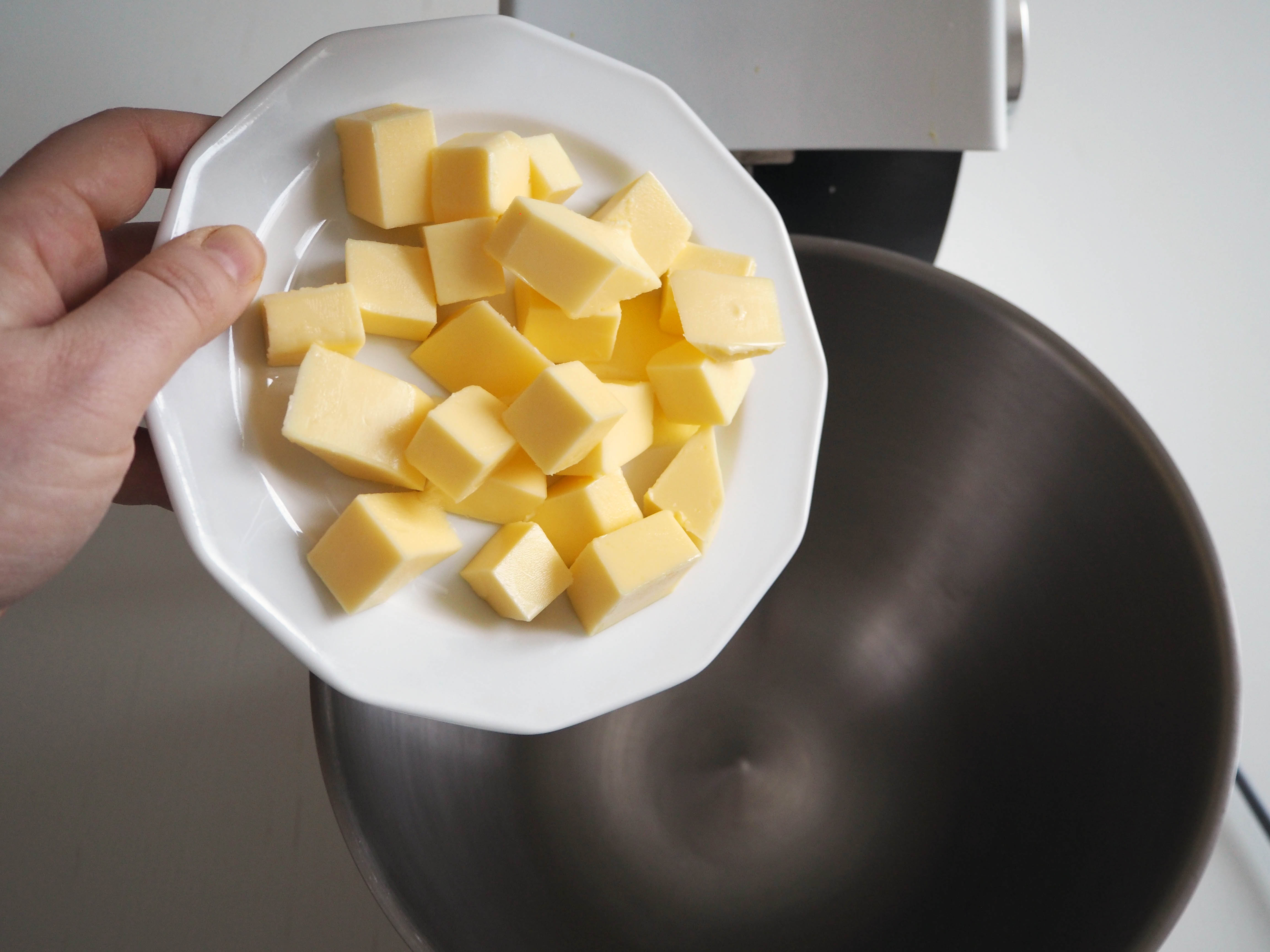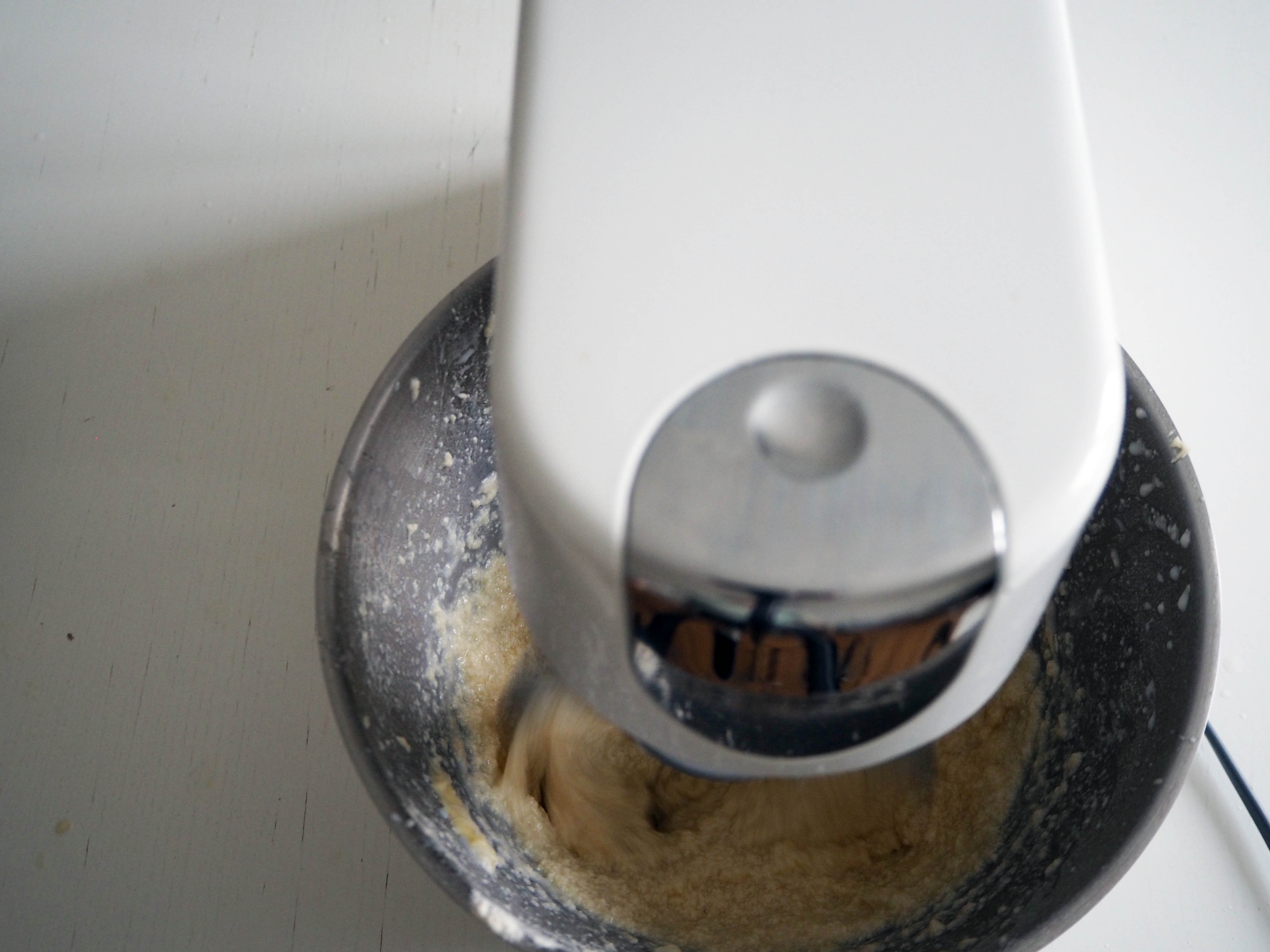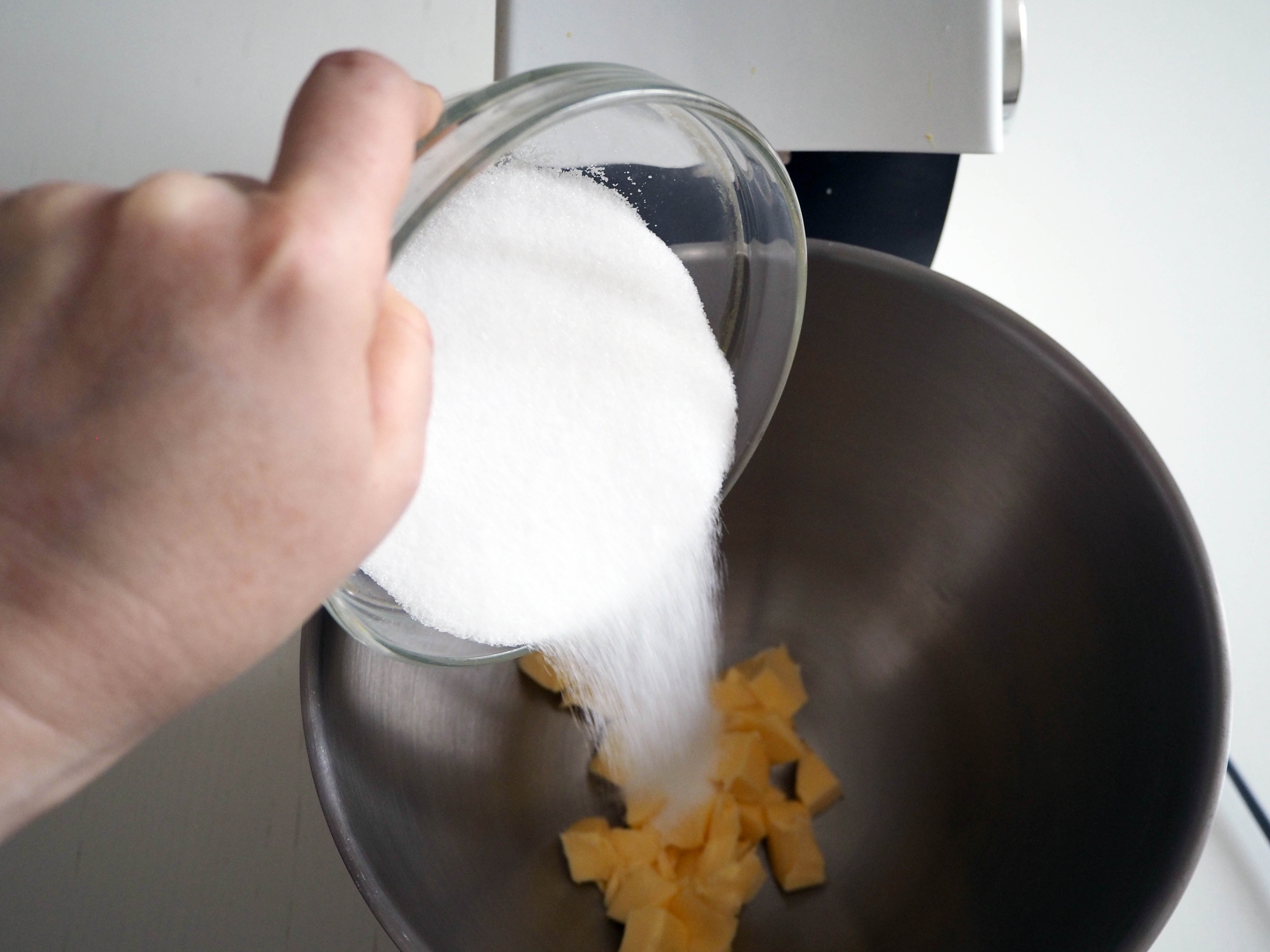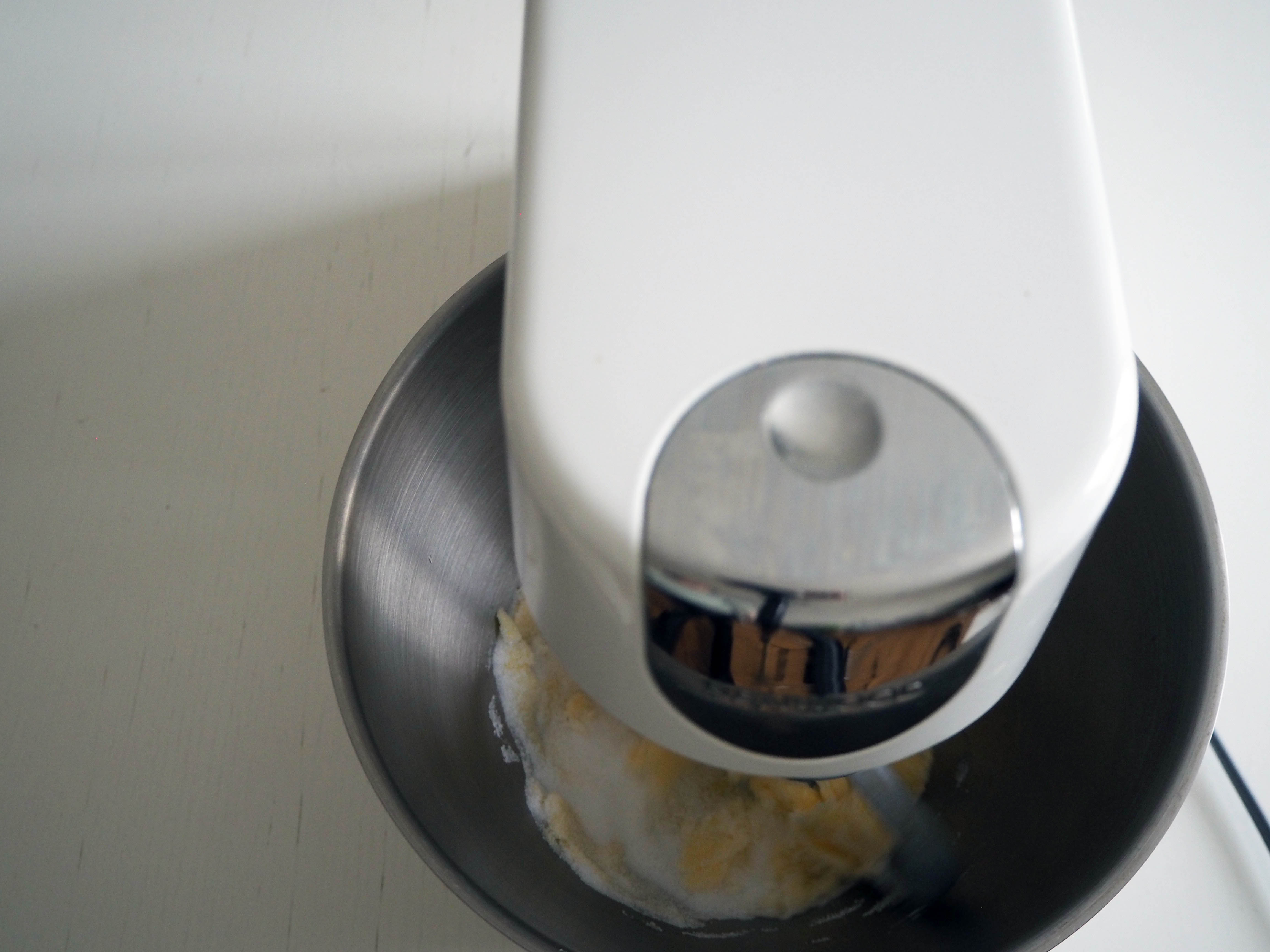 4. In a mixing bowl, put butter and sugar, and beat for 3-4 minutes in medium speed, until it gets creamy. Scrape the sides of the bowl if needed.