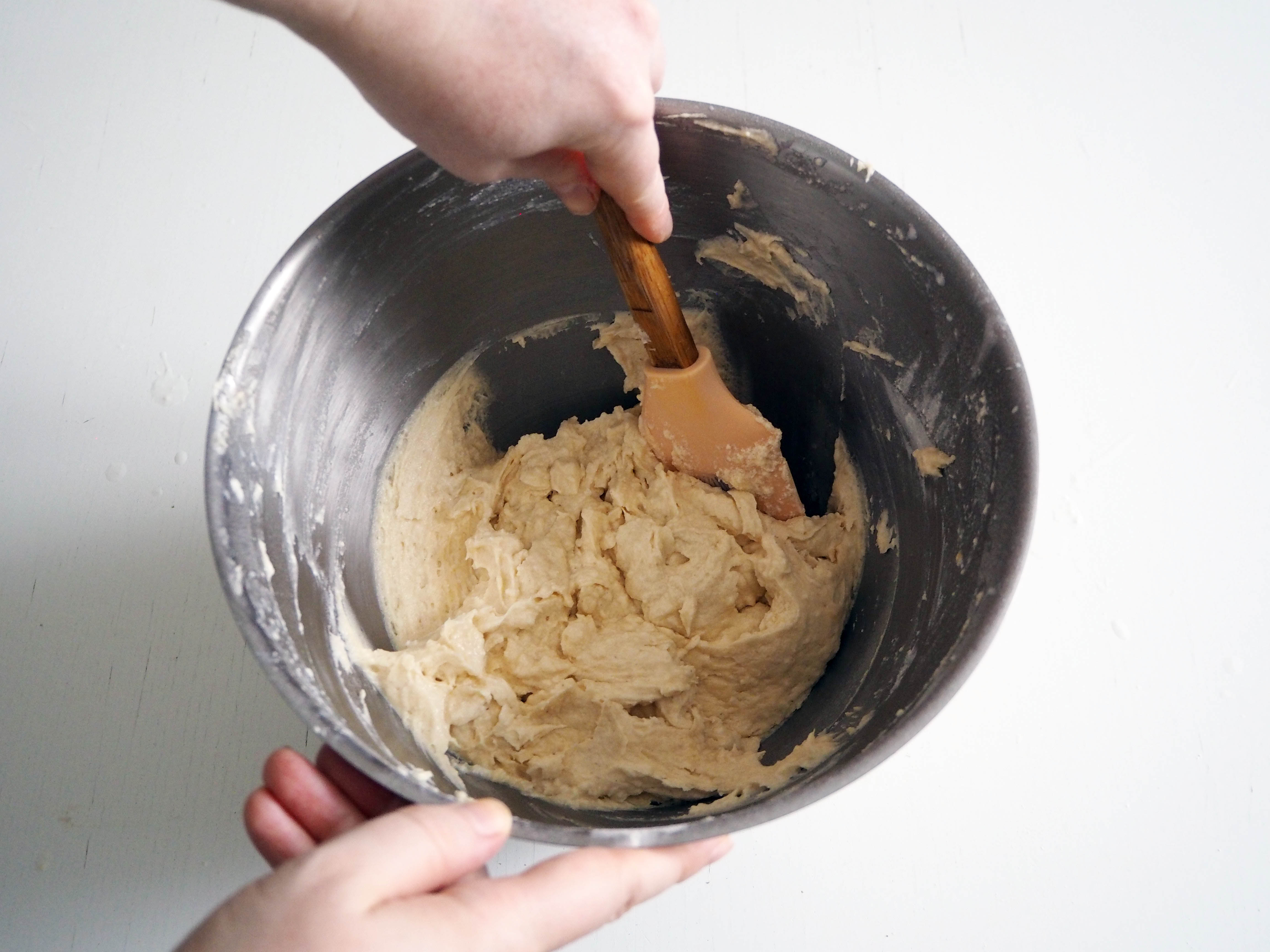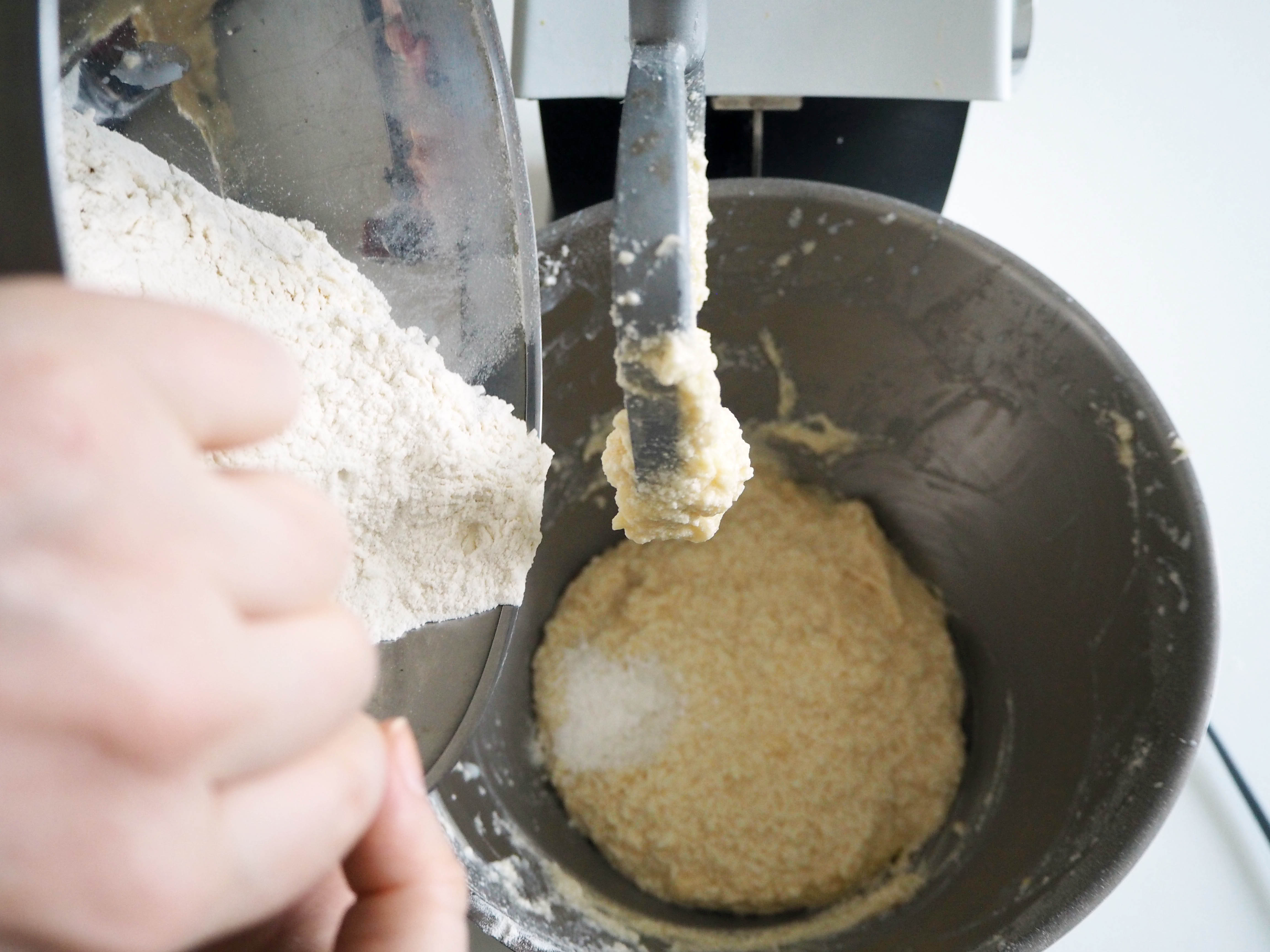 6. Add half of the flour mixture and slowly beat until fully incorporated.