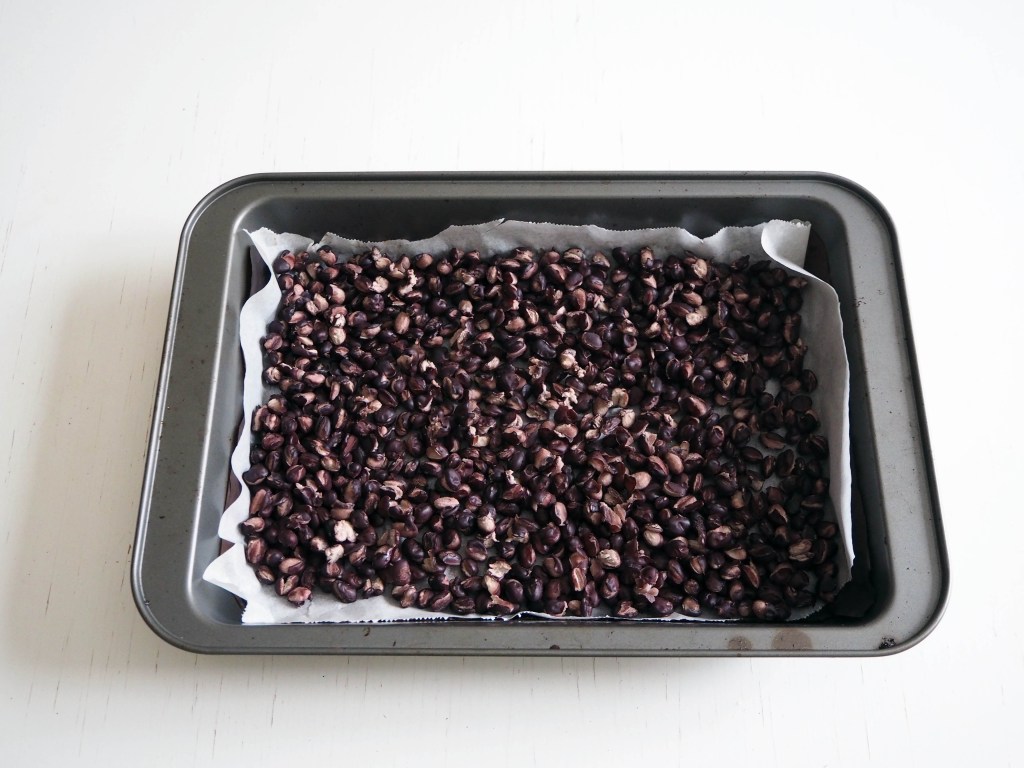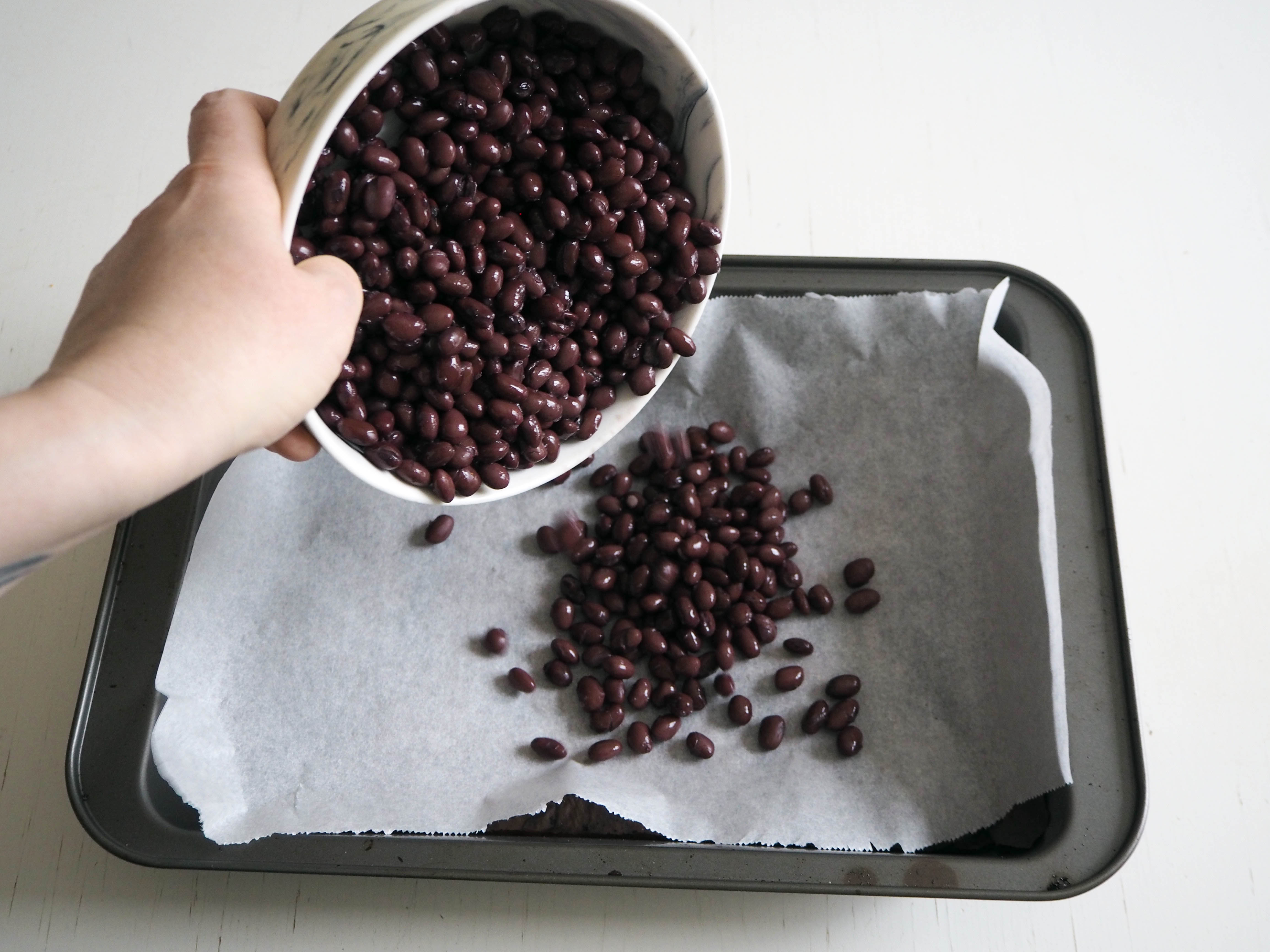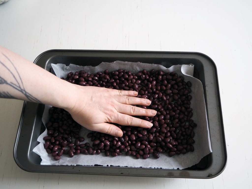 - Spread washed and drained black beans on the baking paper in one layer. Put in the oven for 15 minutes, and they will get dry and start to crack. Take them out of the oven and set them aside. In the meantime, increase the oven heat to 200C and prepare another baking paper on the oven tray.