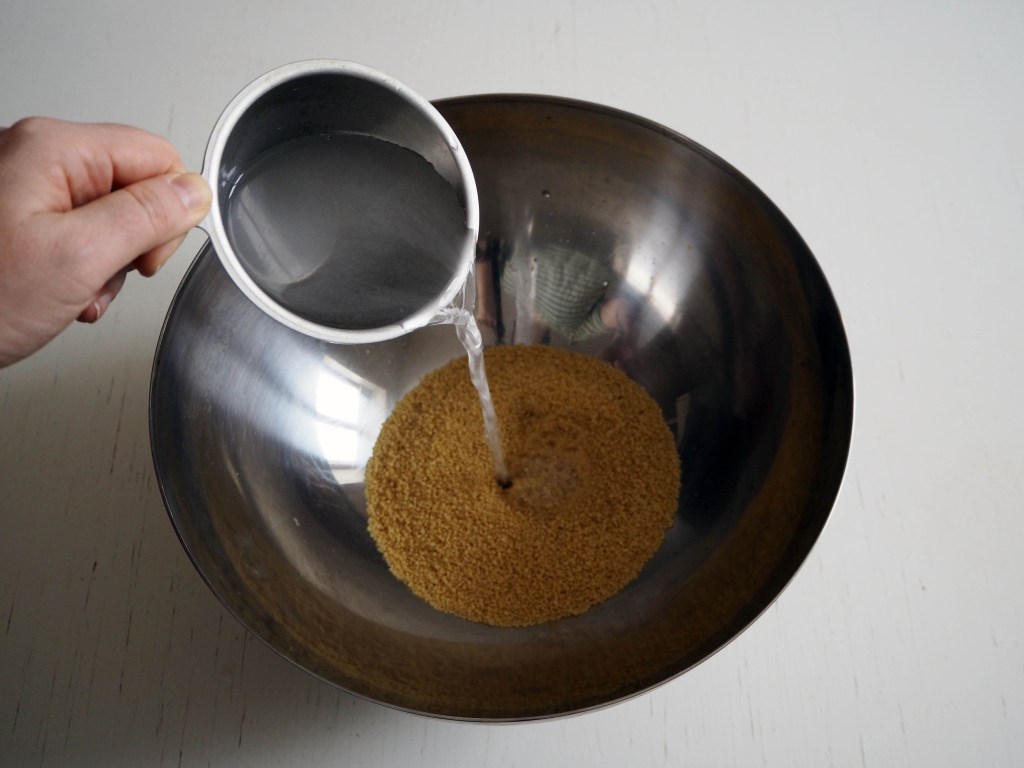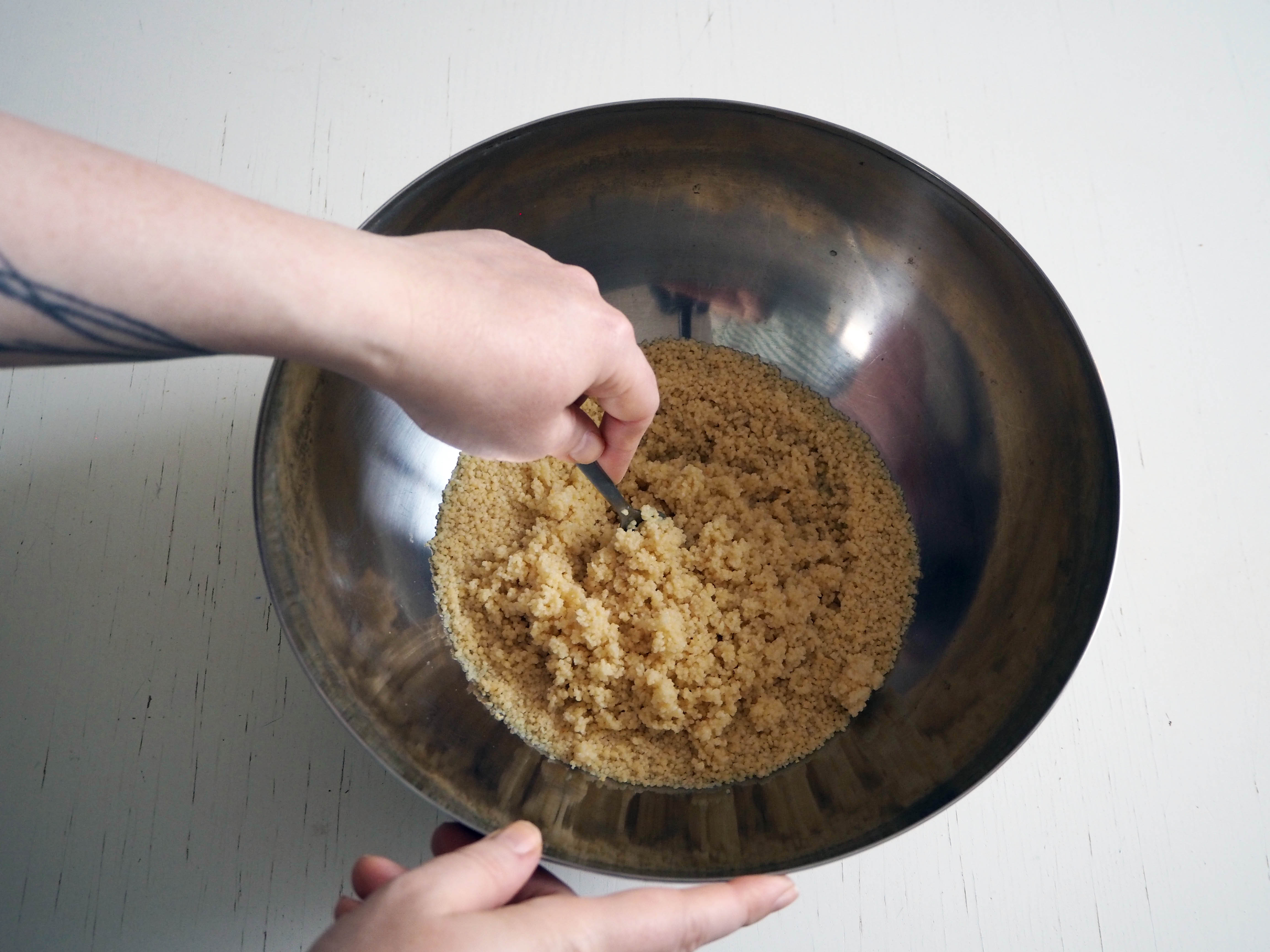 3. In a large bowl, put couscous and 2.5 dl (or 1 cup) hot water (doesn’t need to be boiling, hottest possible from the tap is fine). Let it sit for 5 minutes, then mix a little with a fork to give some air.