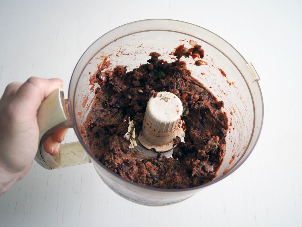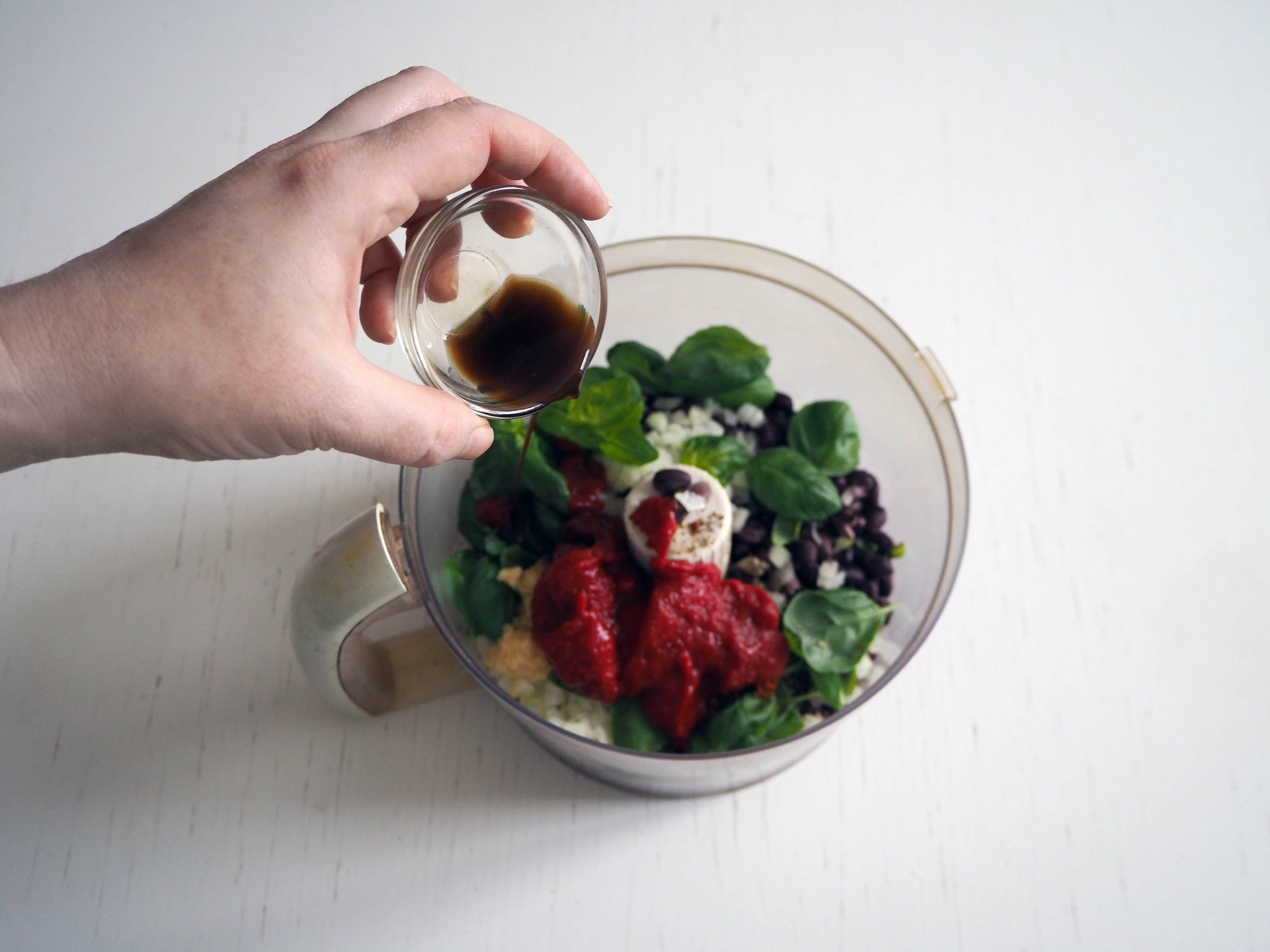 4. In a food processor, put black beans, onion, basil, garlic, oregano, red pepper flakes, salt, tomato paste and soy sauce. Process until you have a paste. You don’t have to make it very smooth; if some of the beans stay bigger, they will give a better texture.