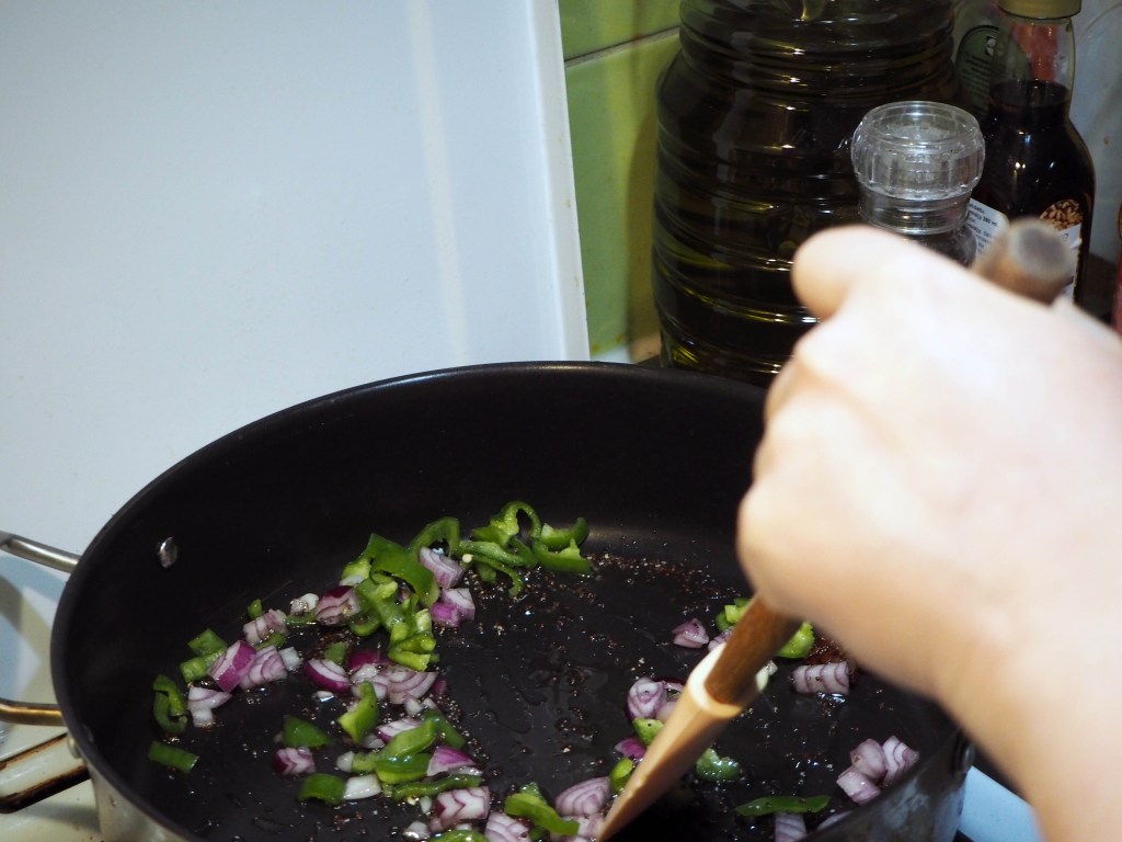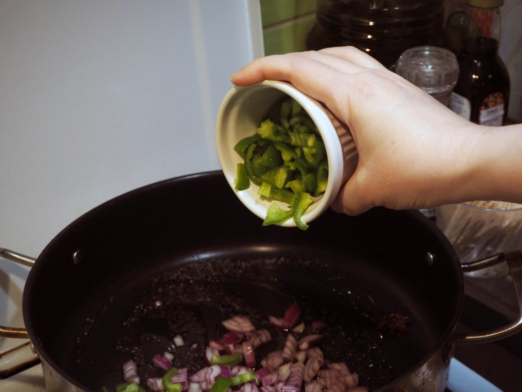 7. Now, let’s make the rice. In a large but not too deep pan, put oil on medium-high heat. To that, add cardamom, mustard seeds, cloves, star anise, red onion and green chilli peppers. Saute this mixture until the onion becomes translucent.