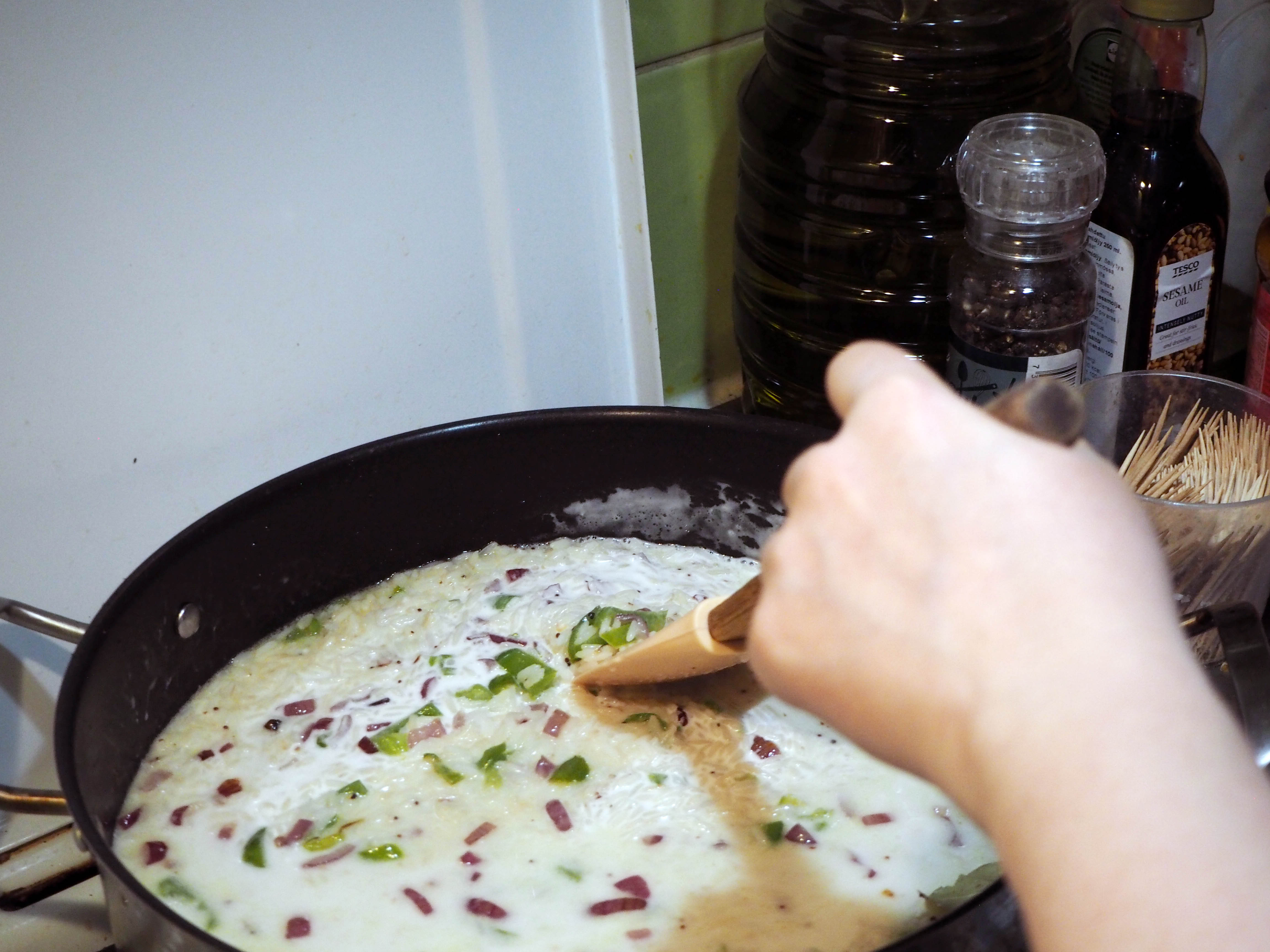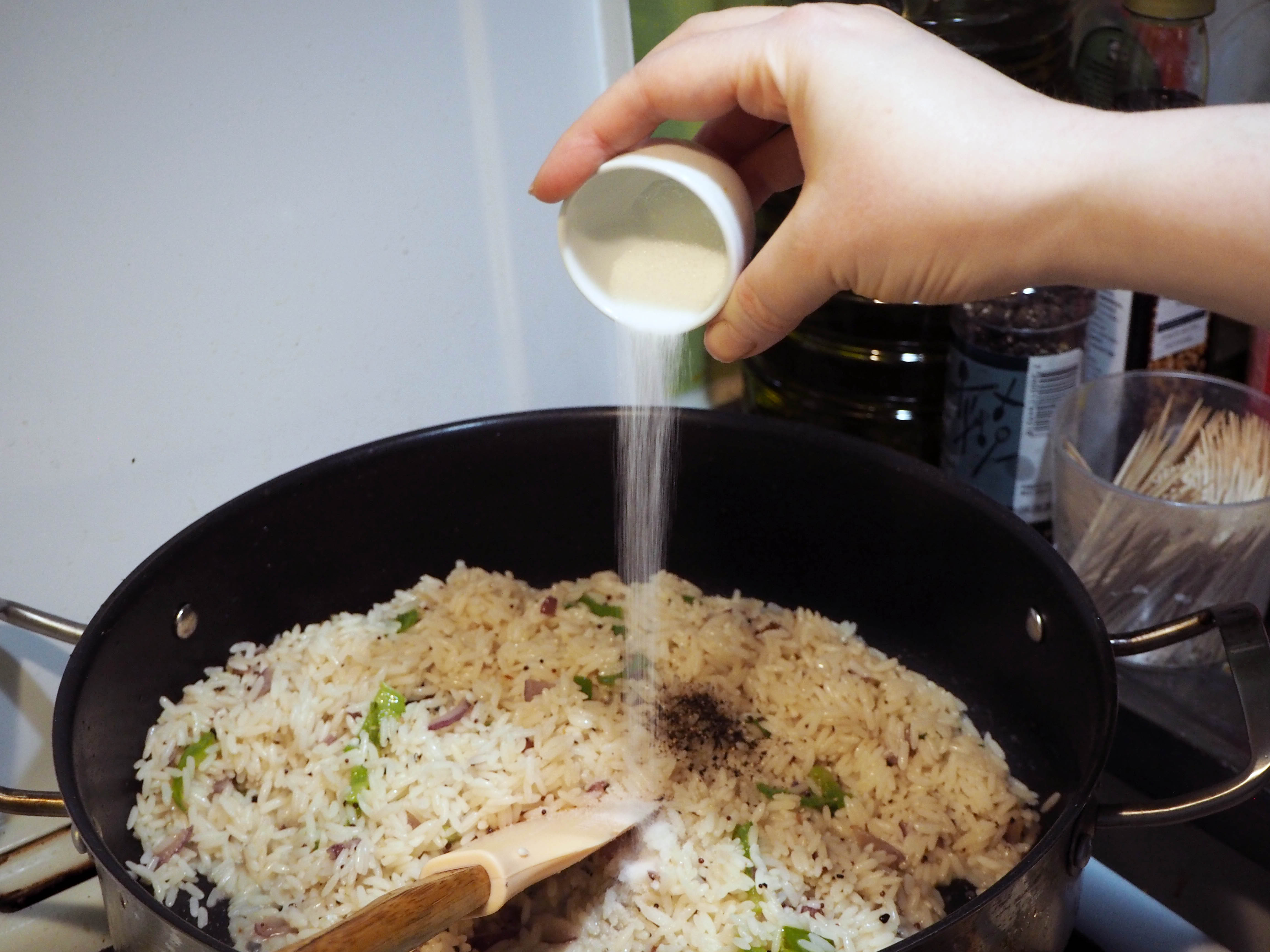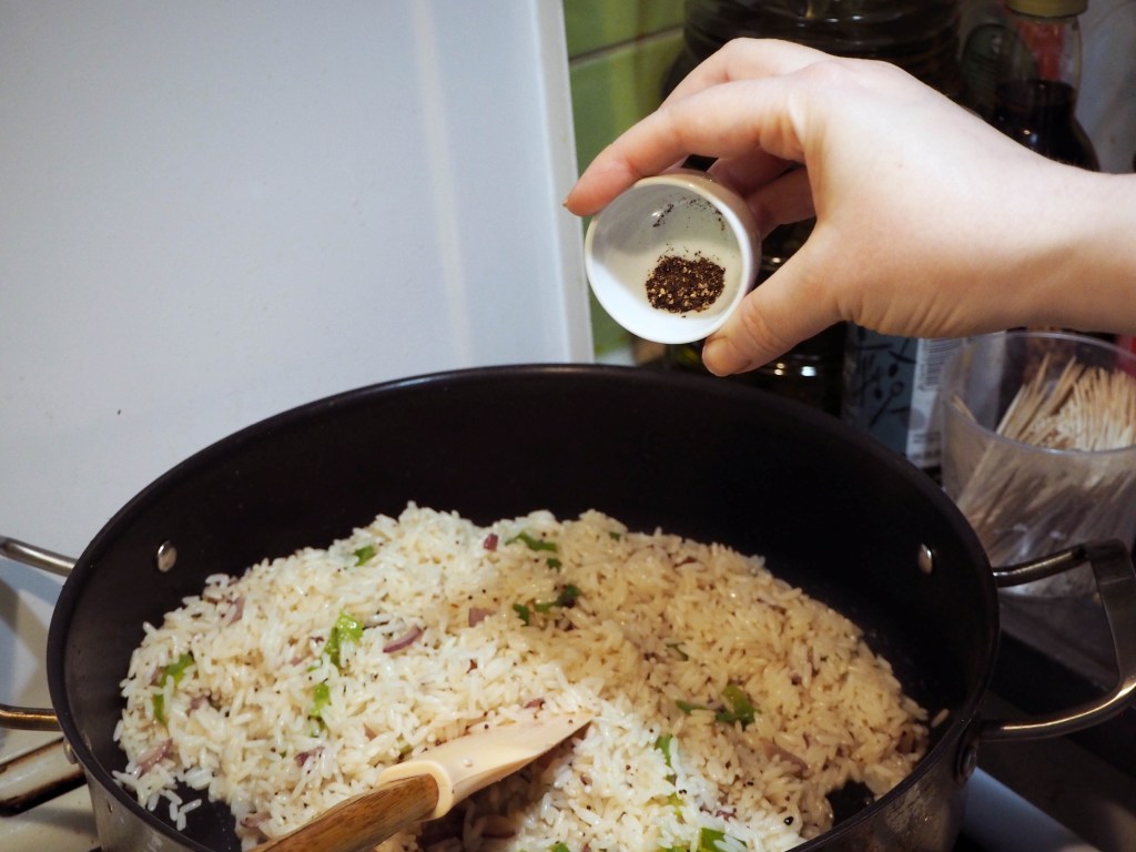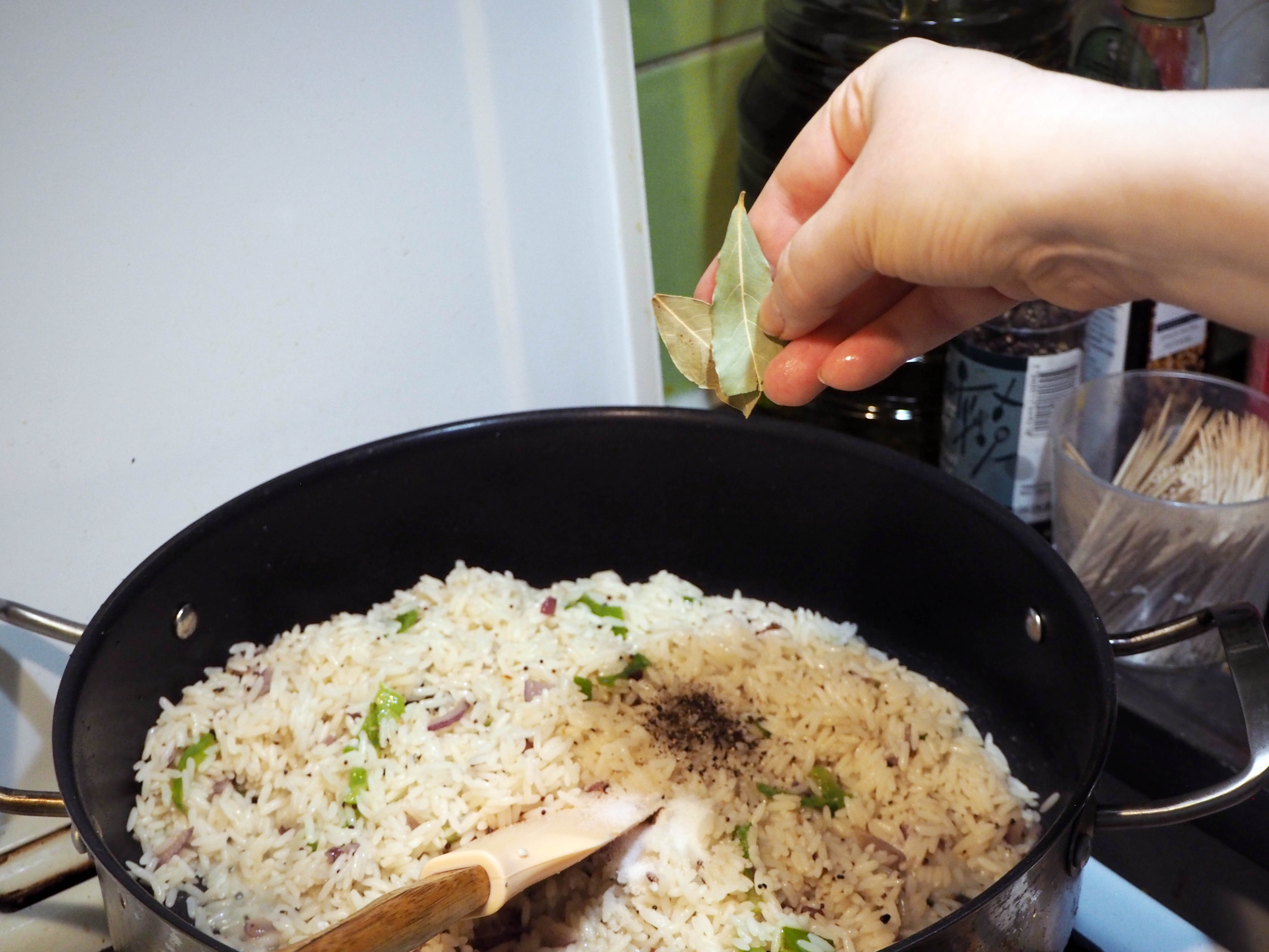 8. Add drained rice, black pepper, salt and bay leaves and mix.