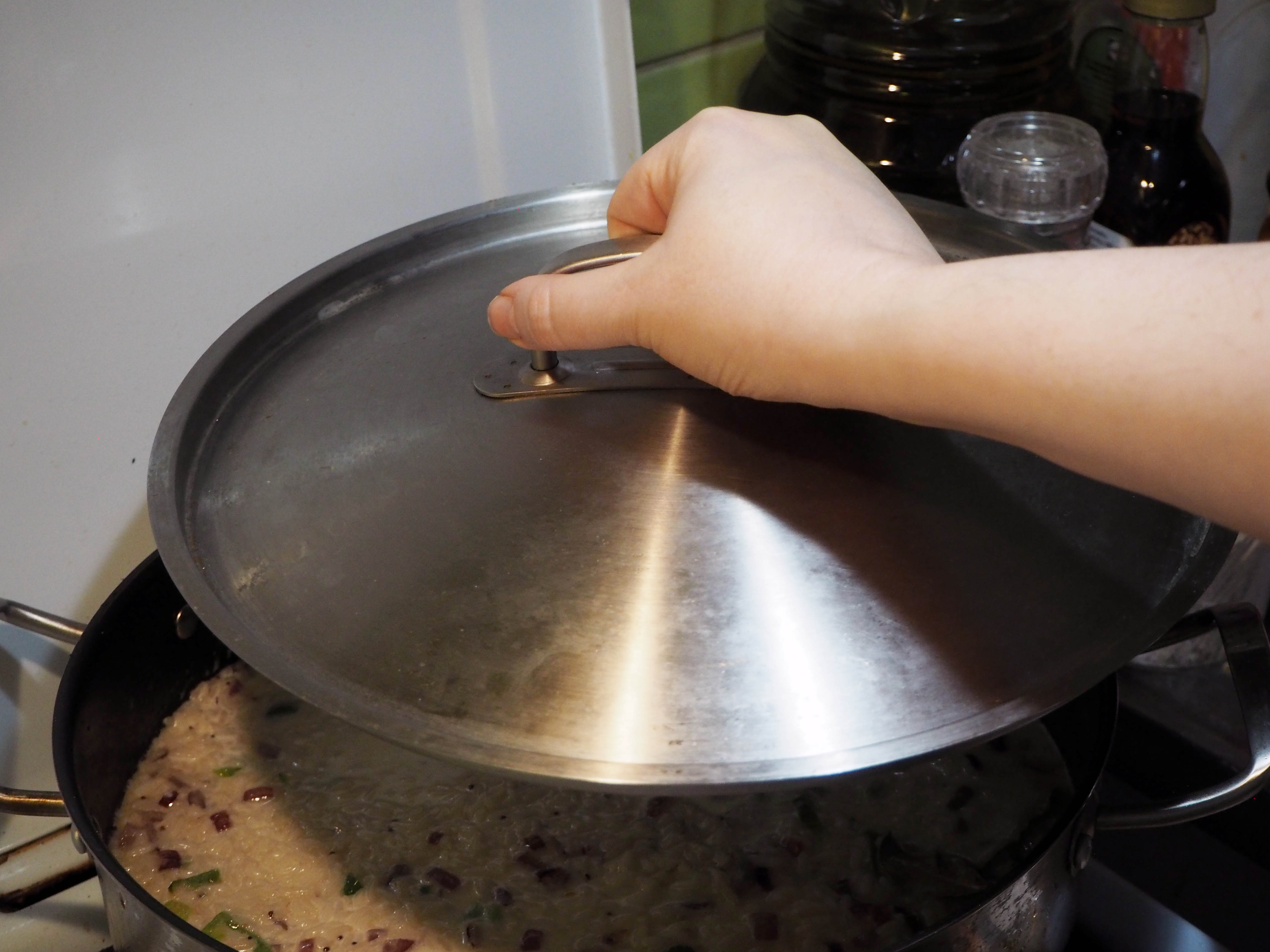 9. Add coconut milk and water, stir a bit, then cover with the lid. Reduce the heat to medium-low and let it cook slowly until all the liquid is absorbed, about 10 minutes max. Check often to make sure that the bottom doesn’t burn. When ready, take away from the heat and let it rest for about 5 to 10 minutes. Serve the rice with black bean balls. Enjoy!