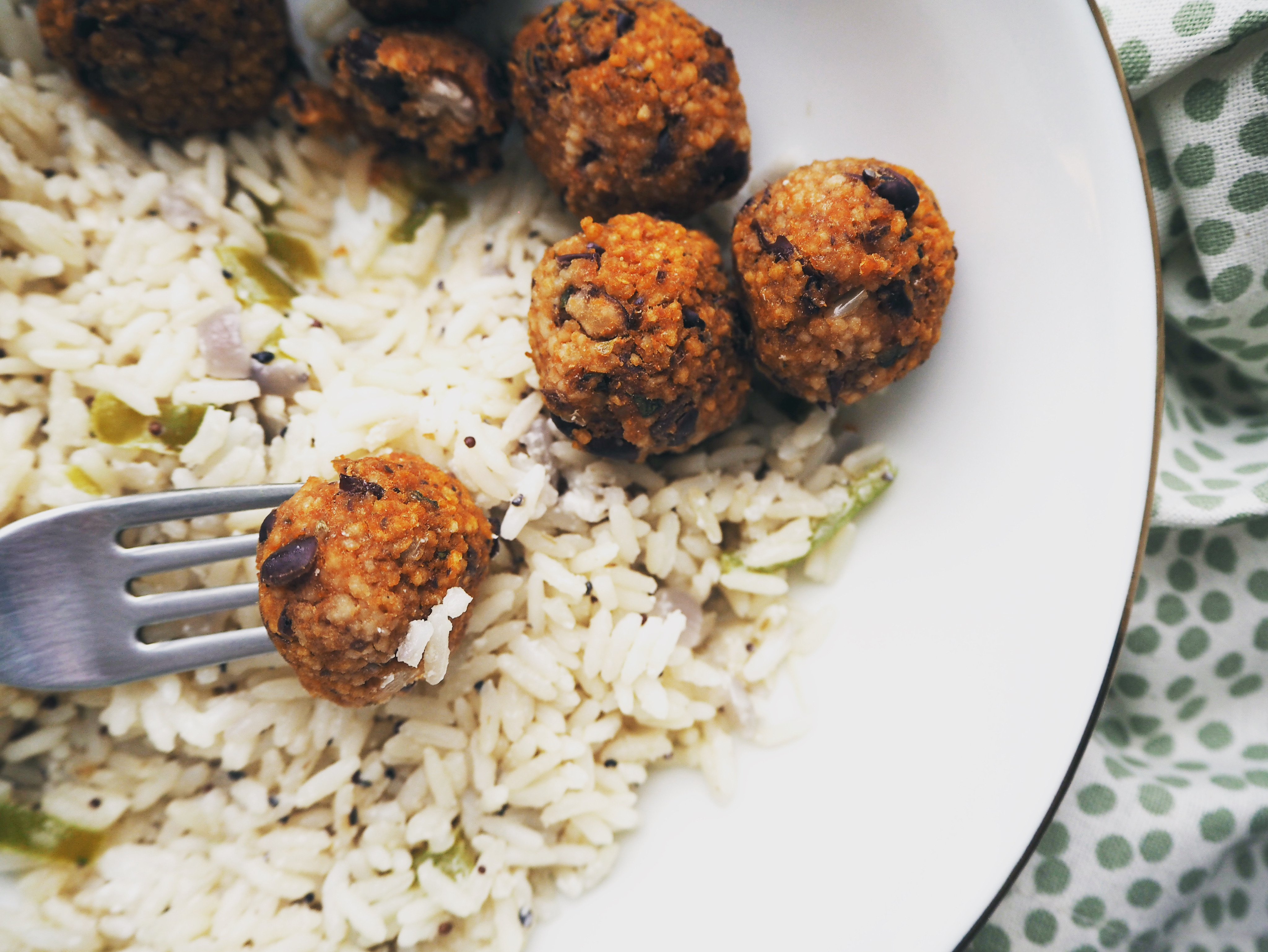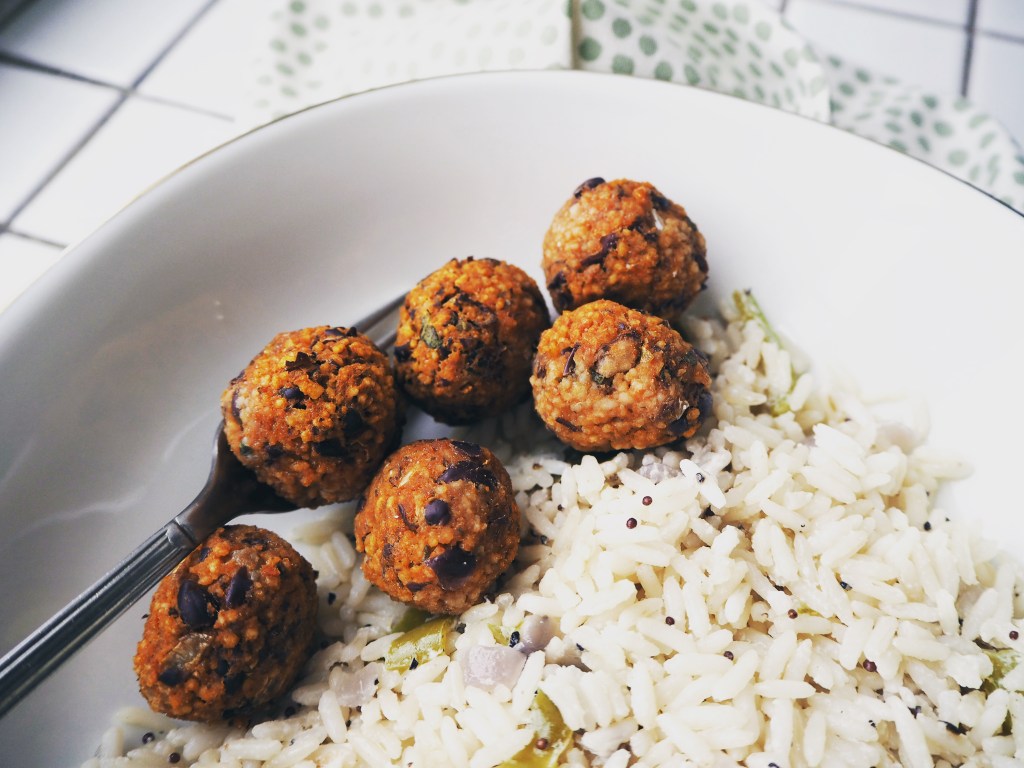 I got the inspiration from two different recipes to make these balls and rice pilaf, but I put my own twists. I used couscous with black beans because I like the texture of couscous in this kind of balls. The gluten-free alternative for couscous can be quinoa or a mixture of almond flour and breadcrumbs. Of course, all these substitutions will result in different textures and tastes themselves.