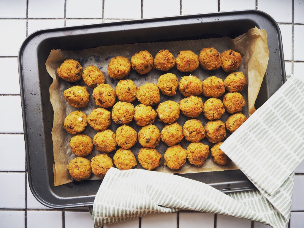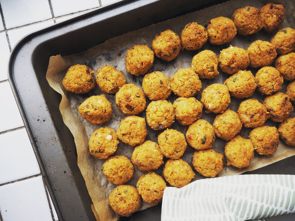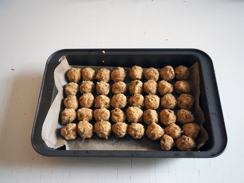 - Preheat the oven to 200C. Put a baking paper on an oven tray (or two trays, up to you: I bake all the balls in one batch, but you may need to prepare more than one tray if your oven is smaller).