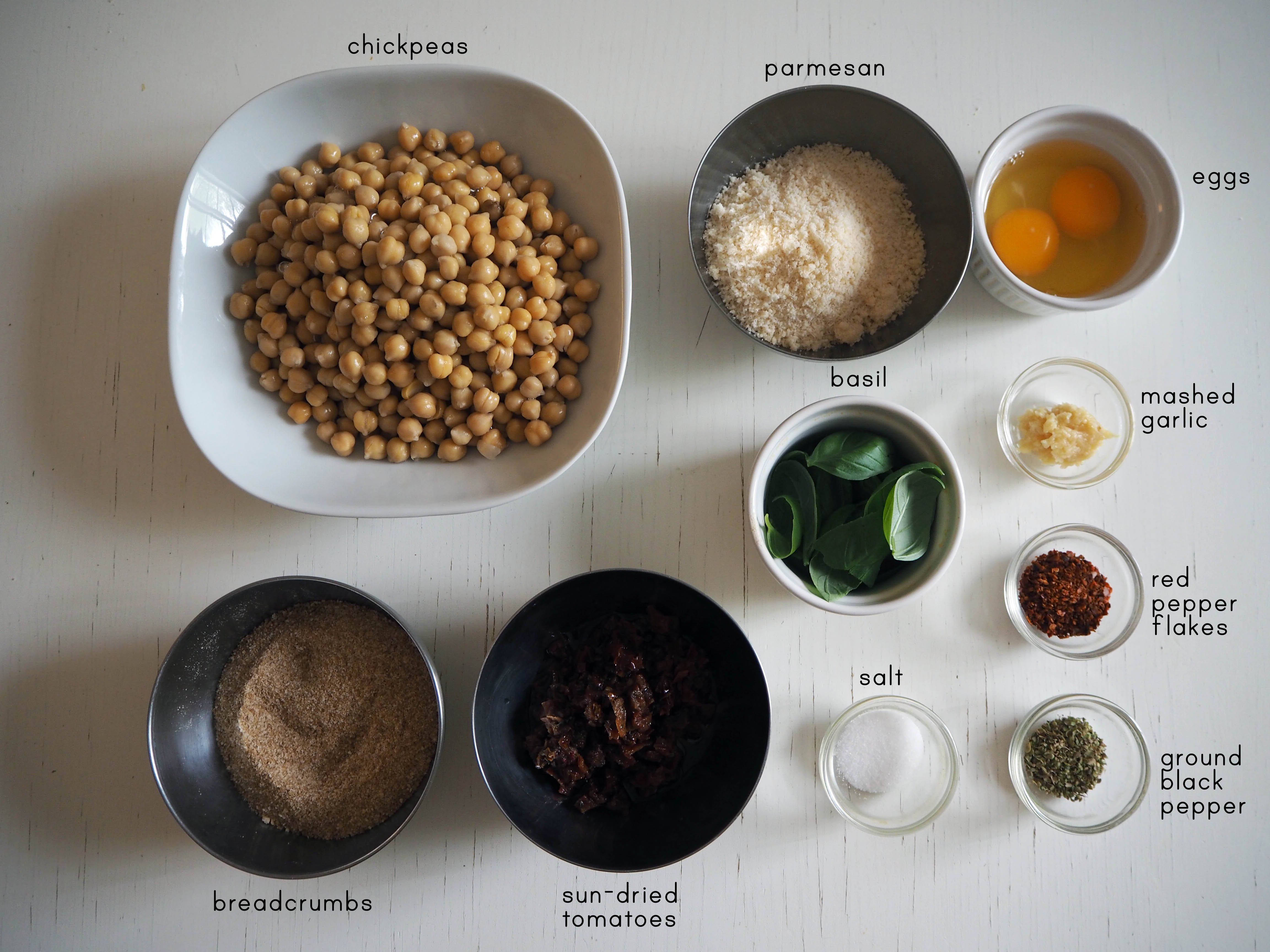 - In a food processor, put all the ingredients except parmesan and breadcrumbs and process until all ingredients are mixed well. You can leave some of the chickpeas in larger pieces to give the balls a nice texture.