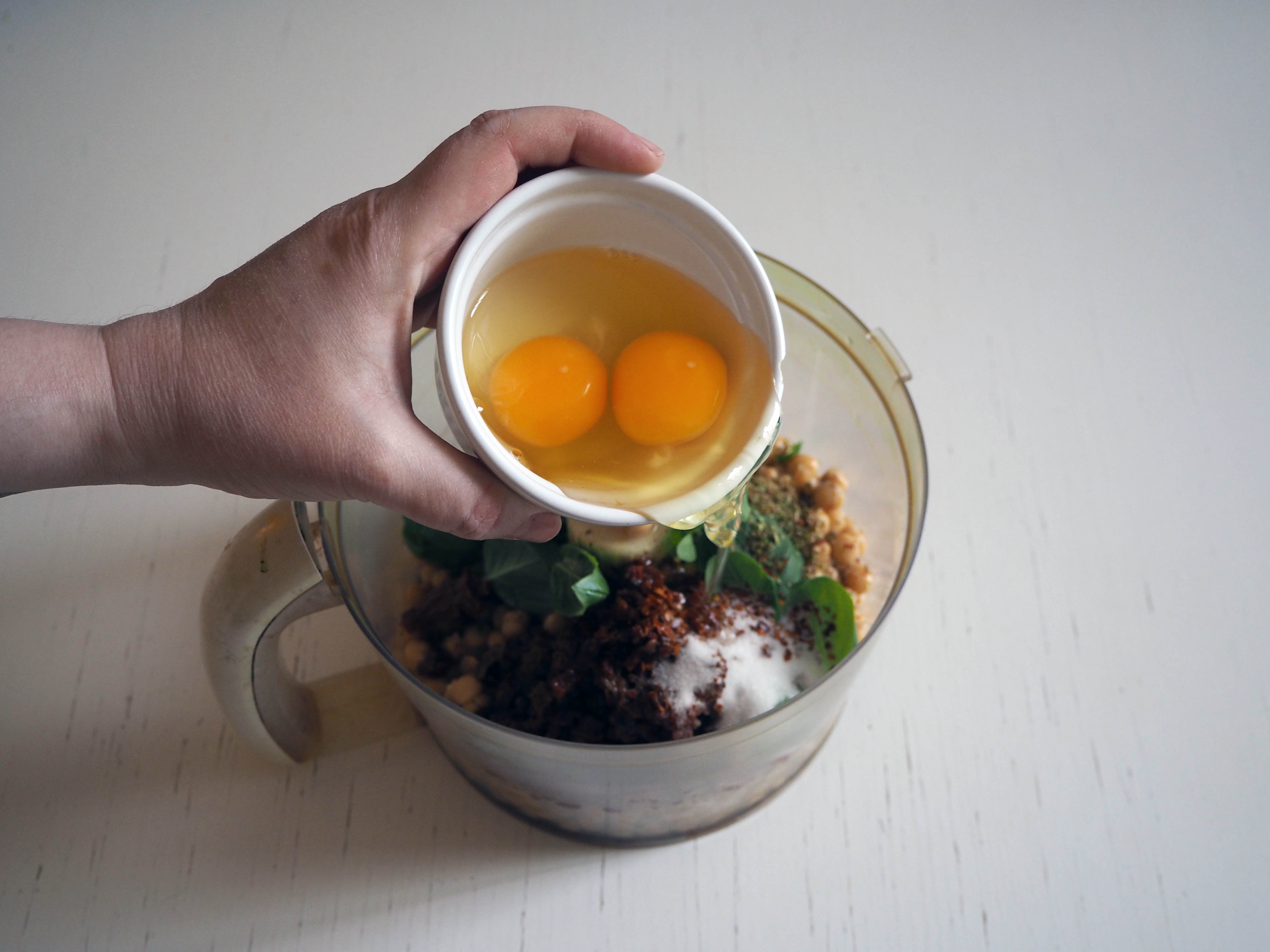 - In a food processor, put all the ingredients except parmesan and breadcrumbs and process until all ingredients are mixed well. You can leave some of the chickpeas in larger pieces to give the balls a nice texture.