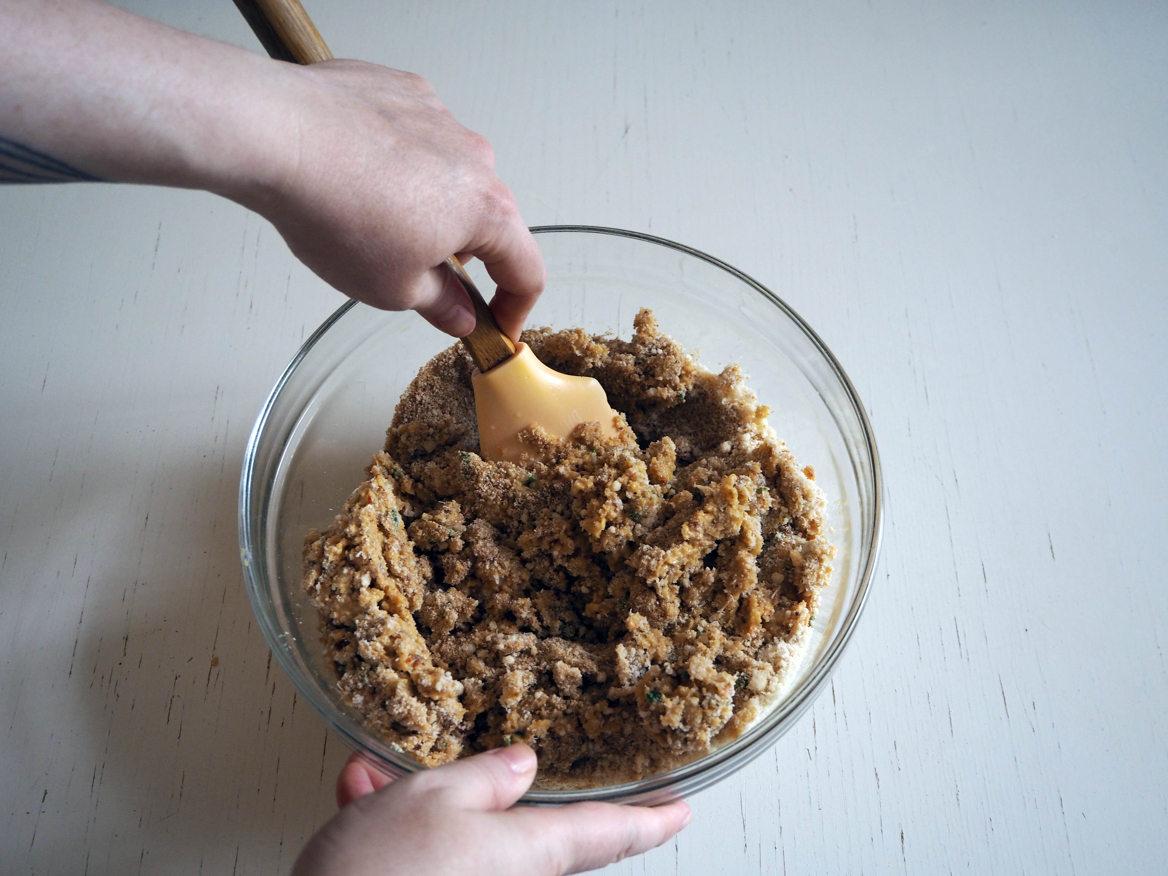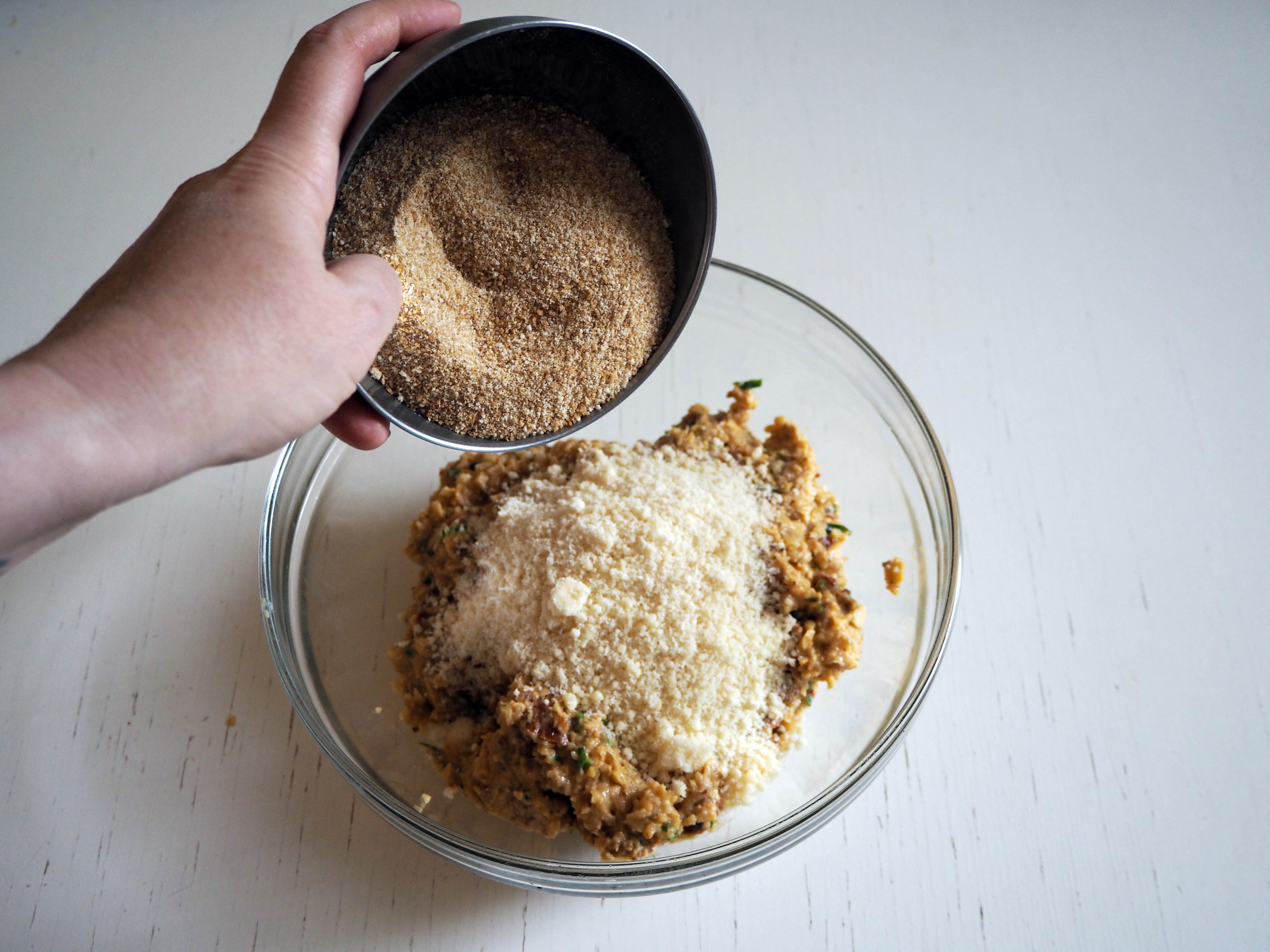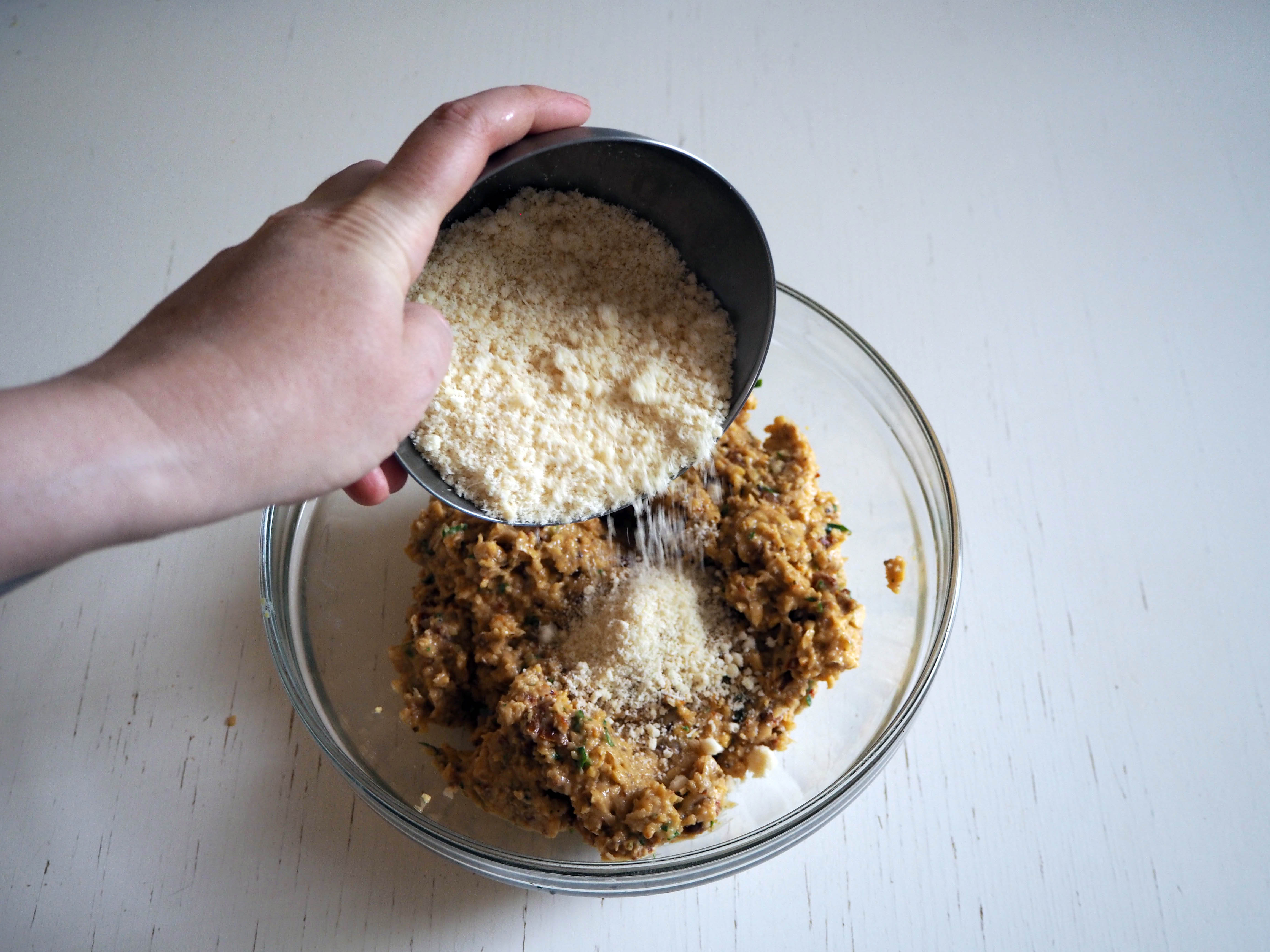 3. Transfer the mixture into a bowl, add parmesan and breadcrumbs and then fold until you have a uniform mixture. If the mixture is too sticky and soft, and cannot be made into balls, gradually add a bit more breadcrumbs until you have the desired texture and hardness.