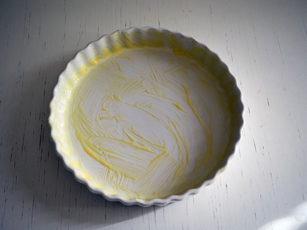 - Preheat the oven to 180C. Grease a 24cm pie dish and put it aside.