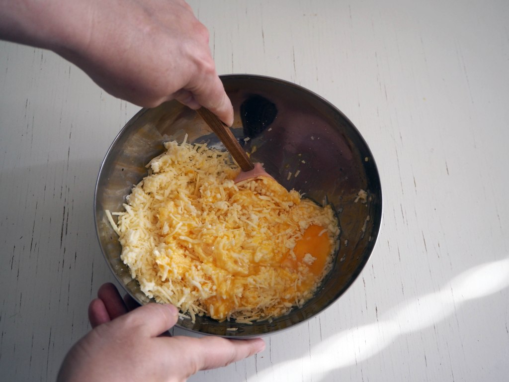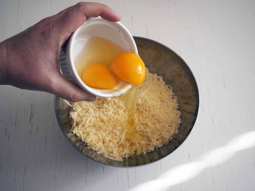 4. Add eggs to grated cheese and mix well.