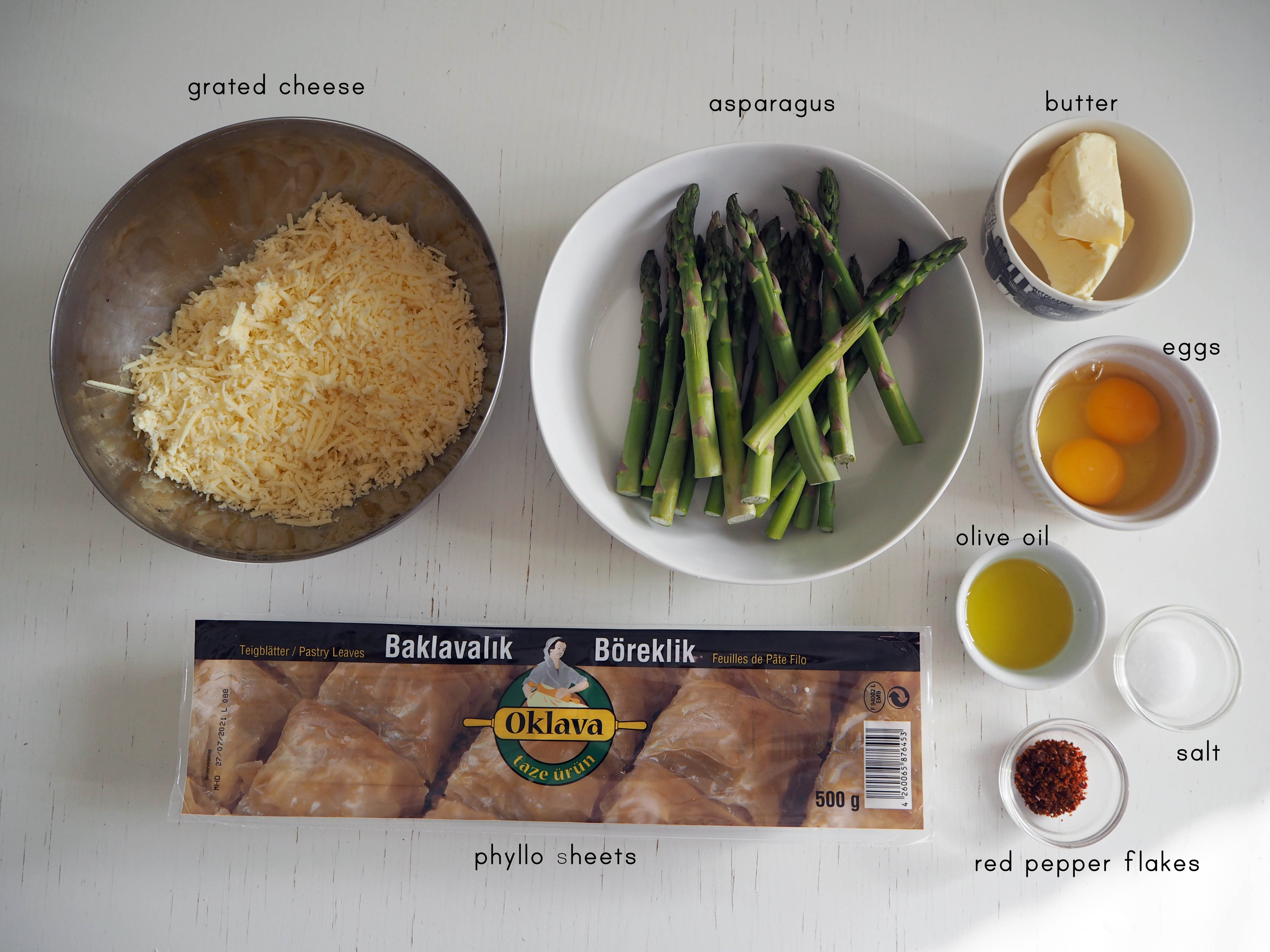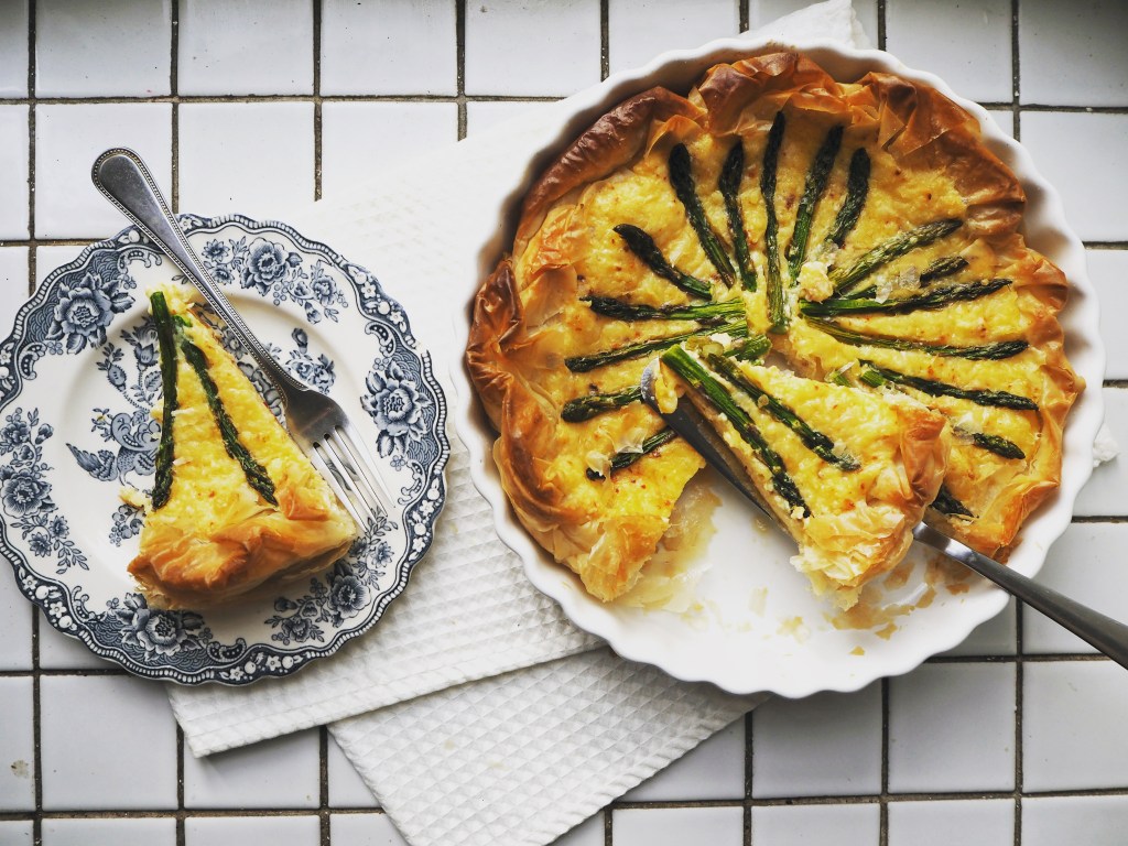 A cheesy asparagus pie is not a brand new idea; there are many versions of it if you google. A few of them even use phyllo. However, mostly those pies are rectangular, so I decided to make a round pie in this recipe.