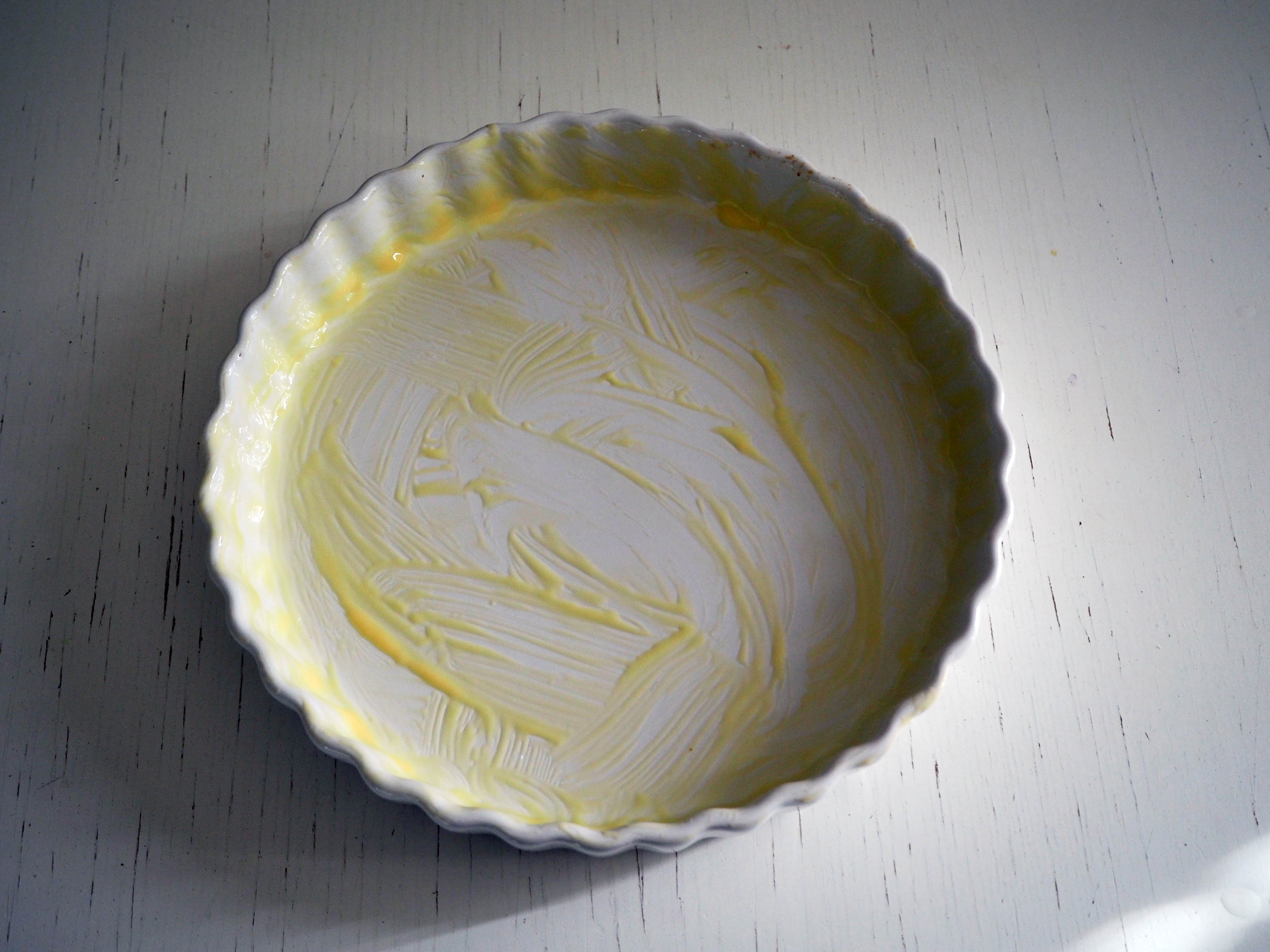 - Preheat the oven to 180C. Grease a 24cm pie dish and put it aside.