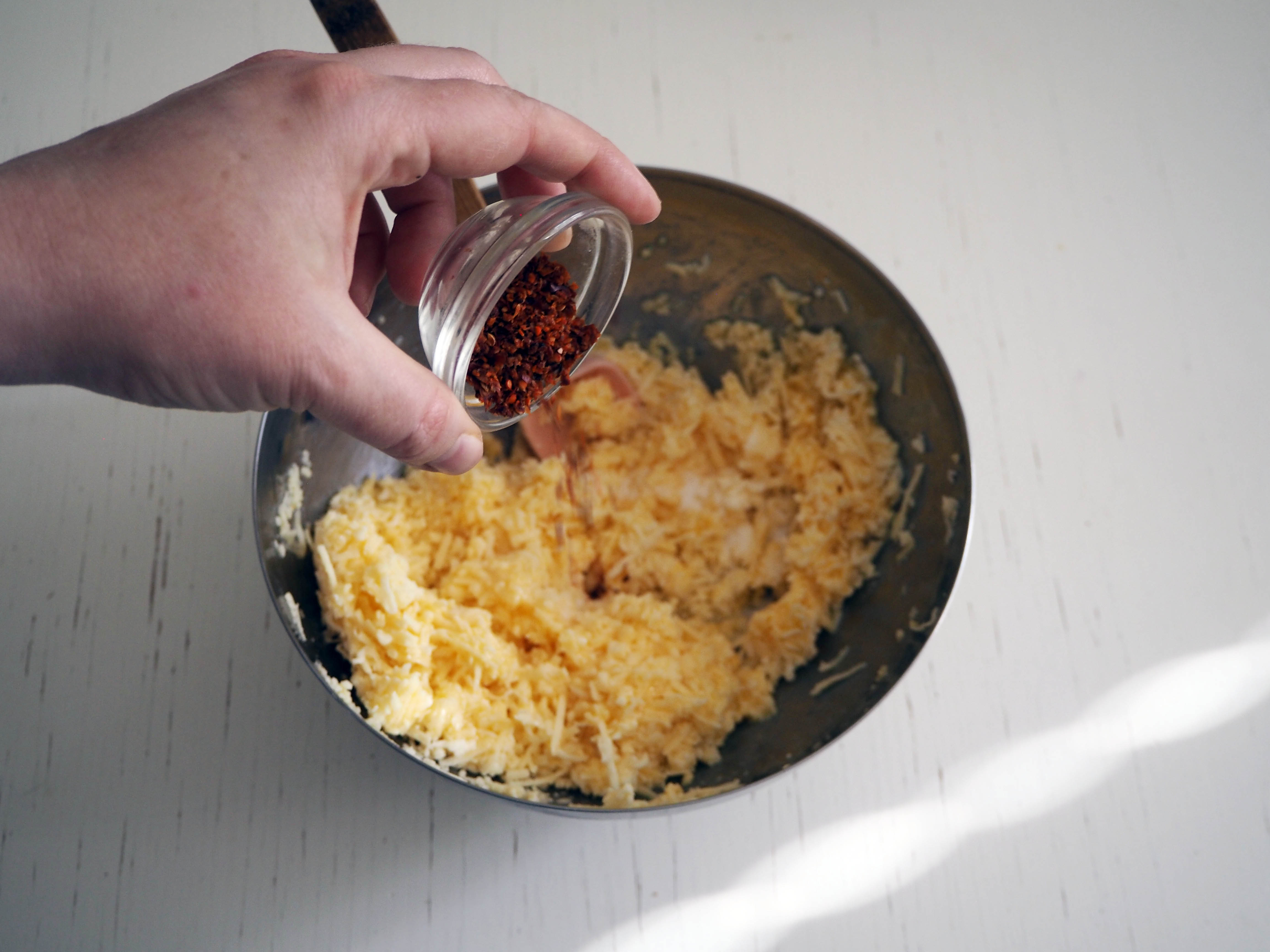 **My cheese was salty enough, so I didn’t add any salt to the cheese. This pinch of salt is only for spreading on top. If your cheese is not very salty, you might consider adding a little salt to the cheese.